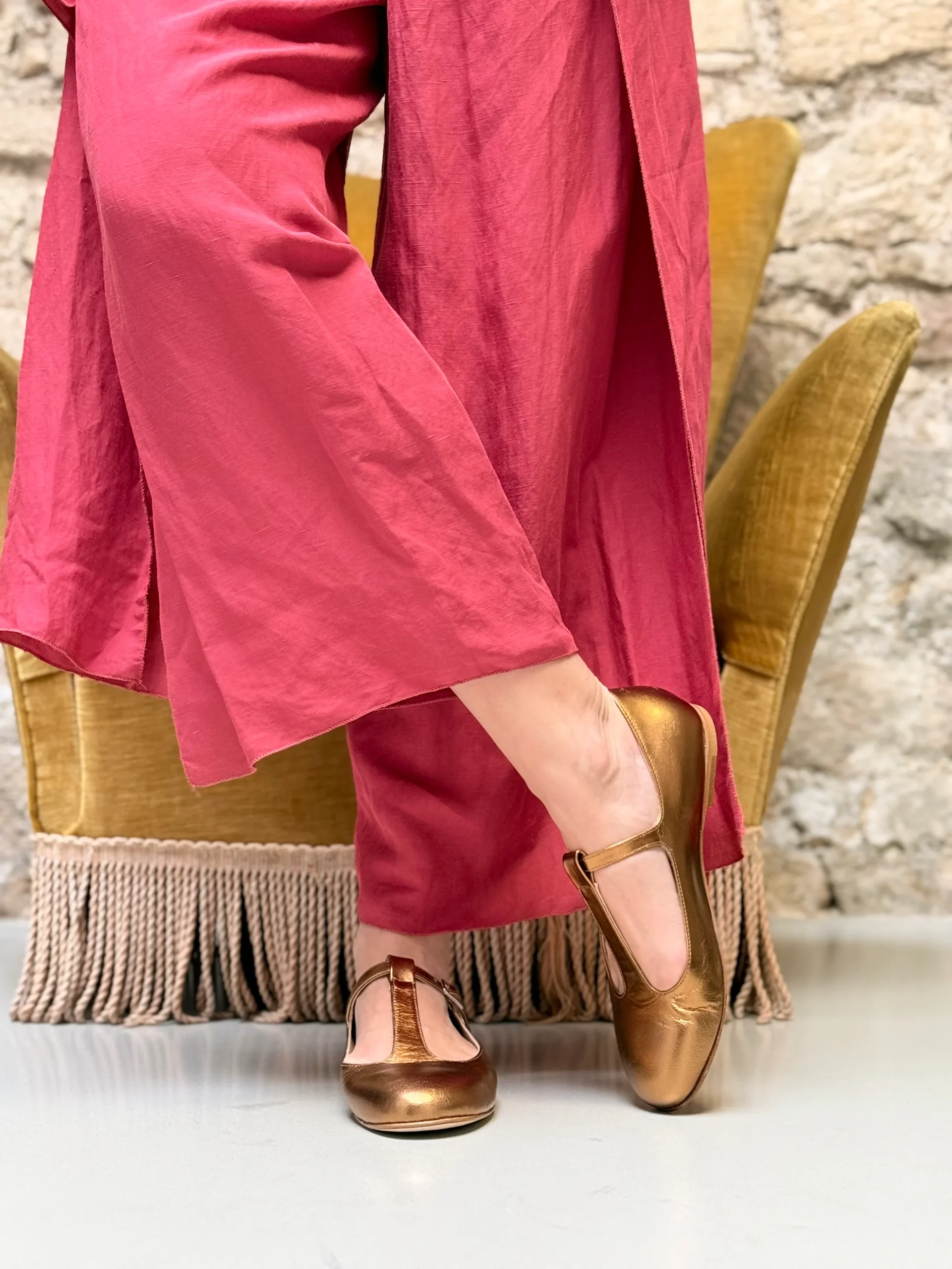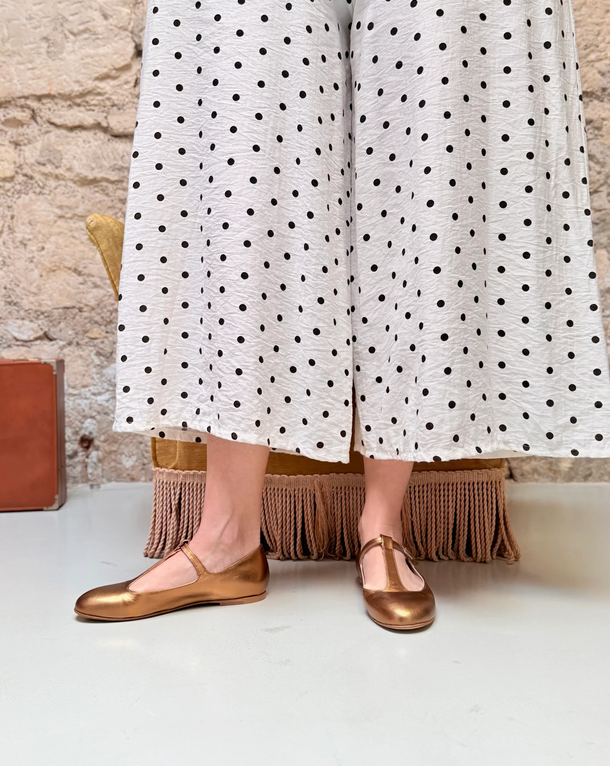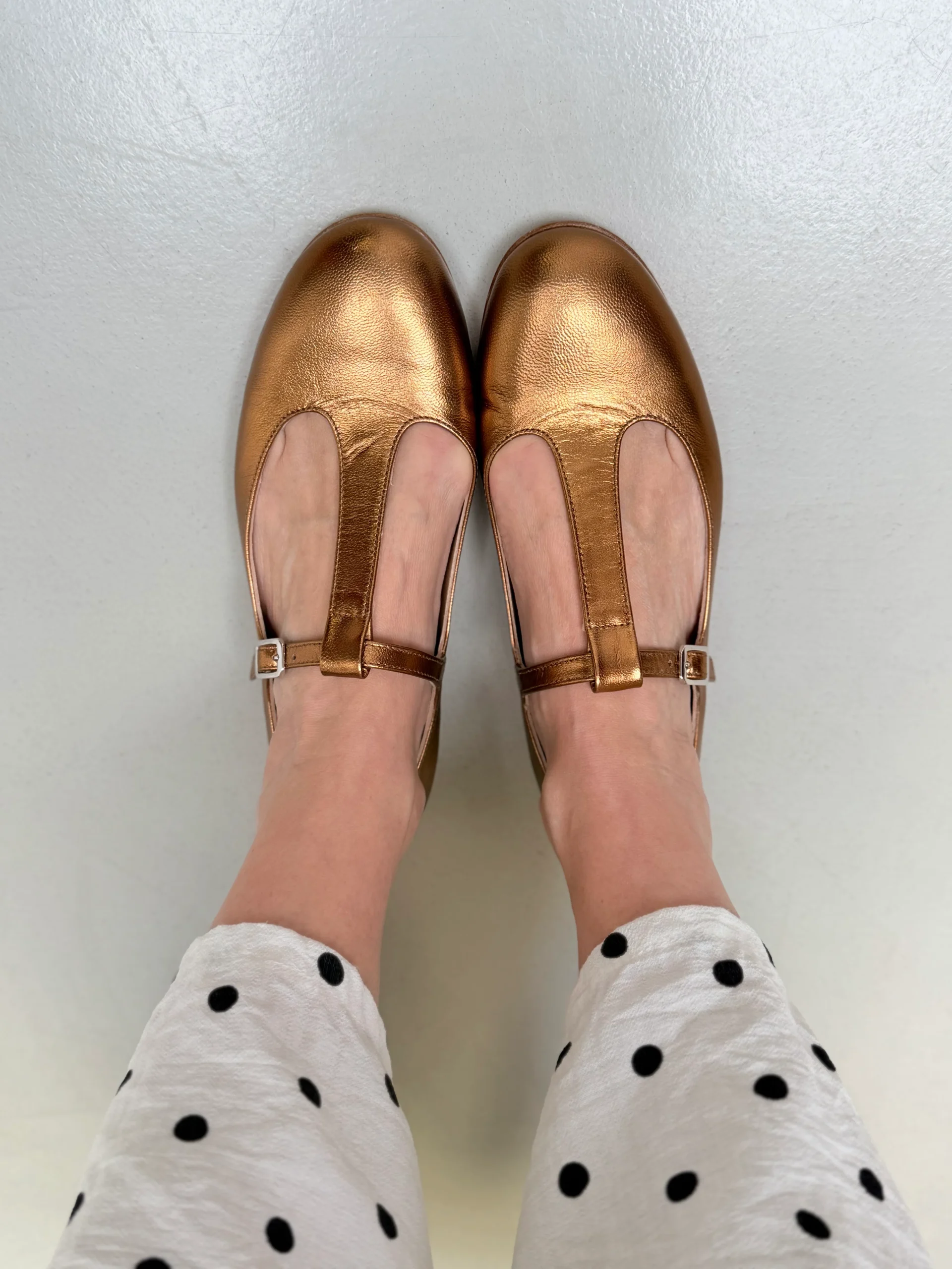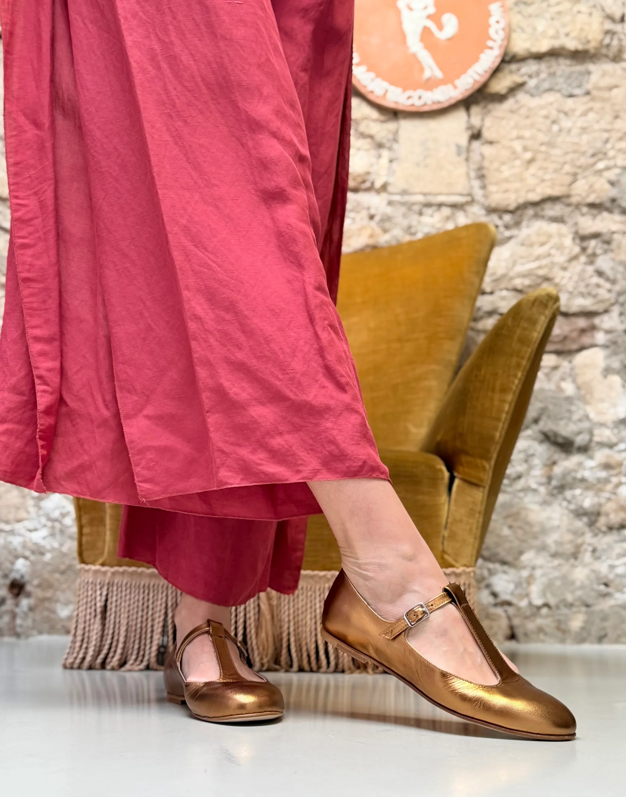 Kris Rame è una ballerina T-bar che sembra fatta di luce: nappa laminata color bronzo, morbida e pulita, con quel fascino vintage che non stanca mai e che rende elegante anche il look più semplice.