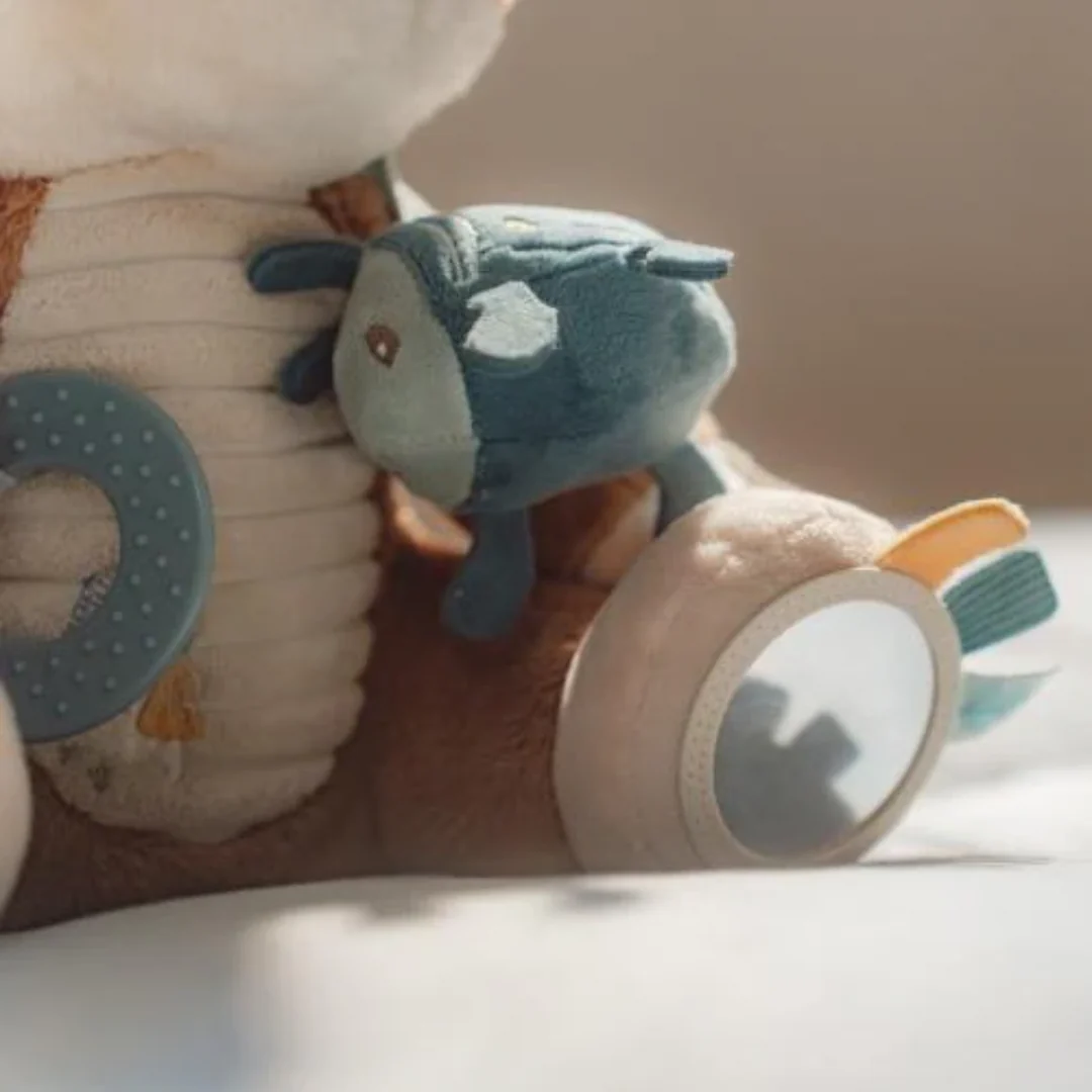 Lo specchietto posizionato sotto una zampa favorisce la percezione di sé, mentre le diverse superfici rendono questo peluche attività neonato adatto a un’esplorazione graduale, rispettosa dei tempi del bambino.