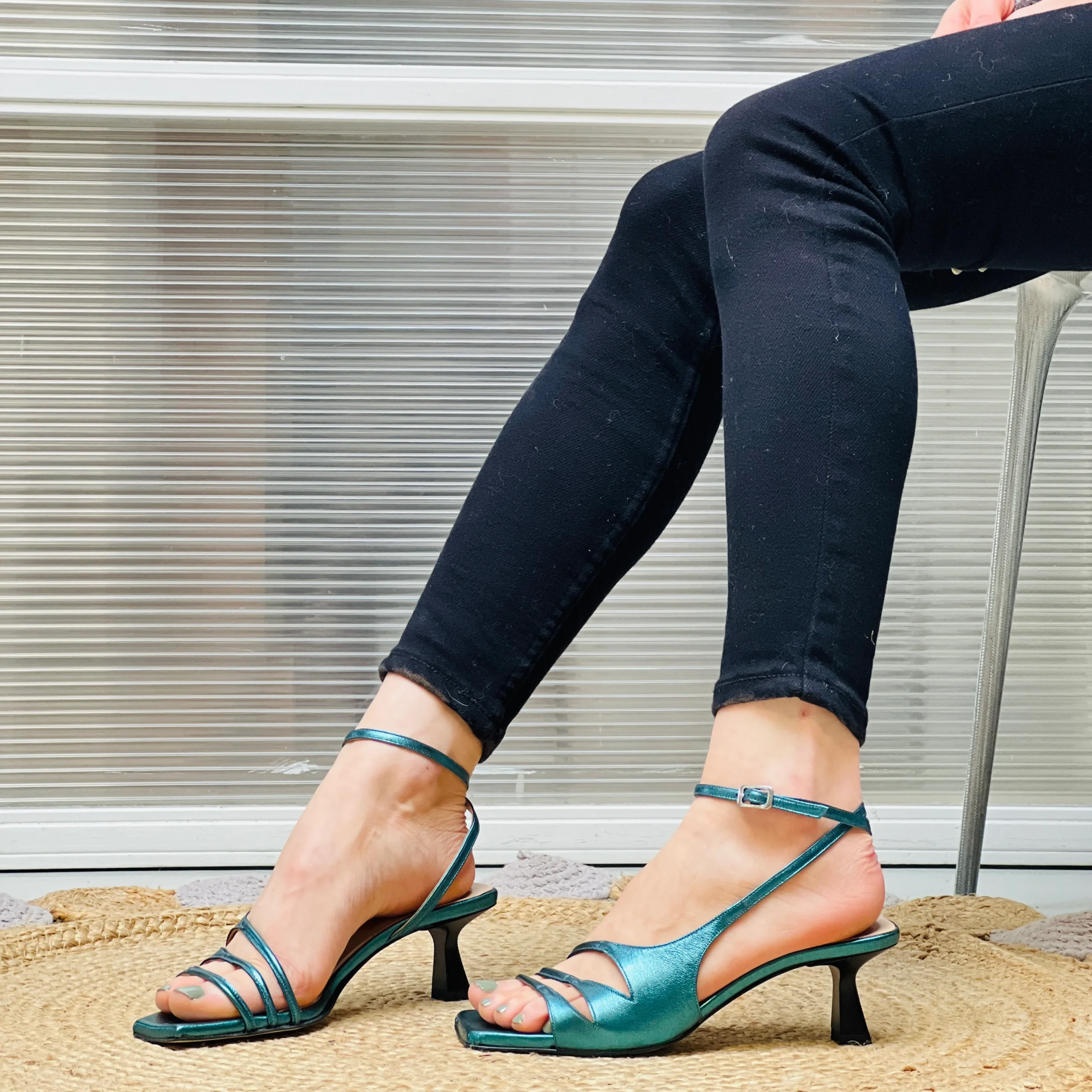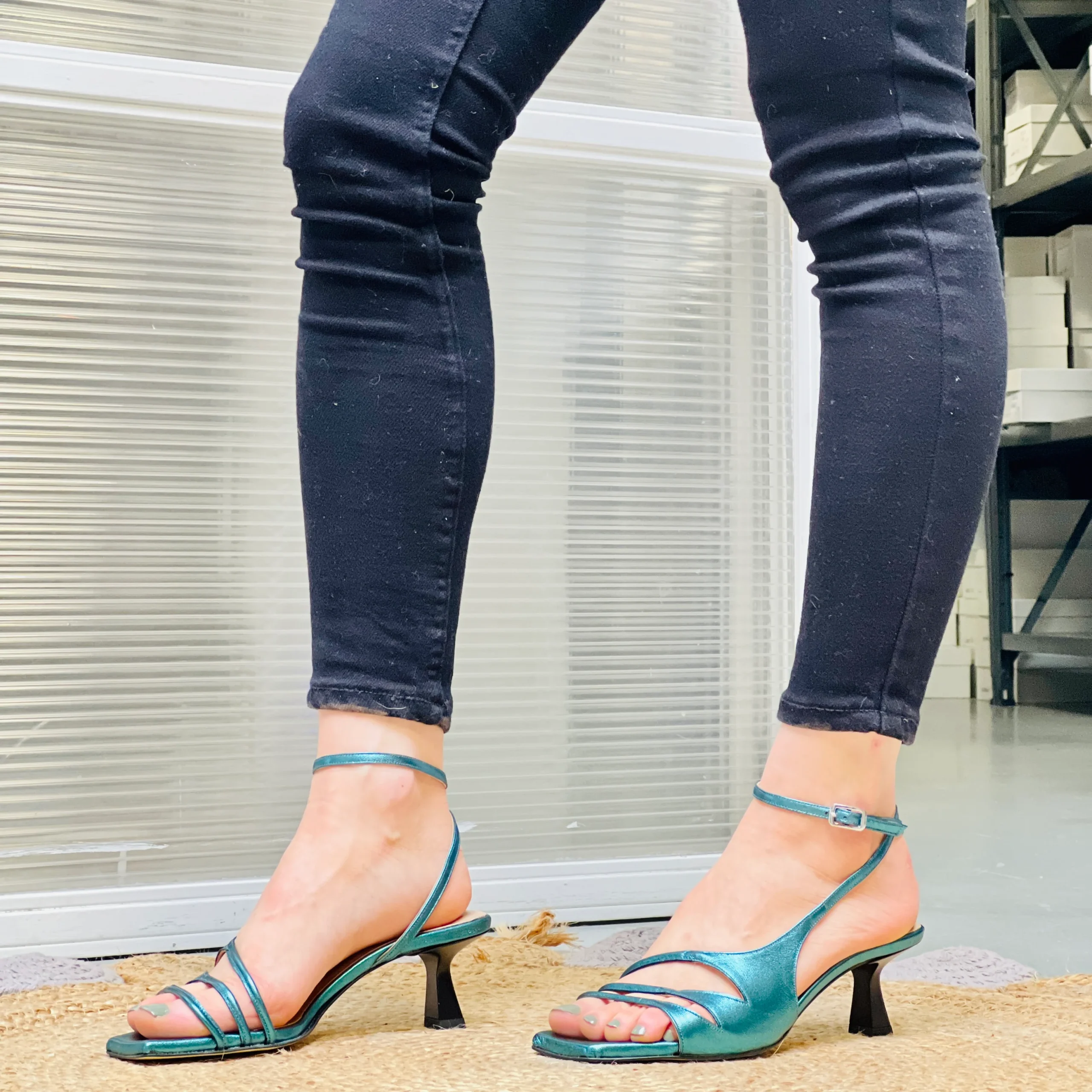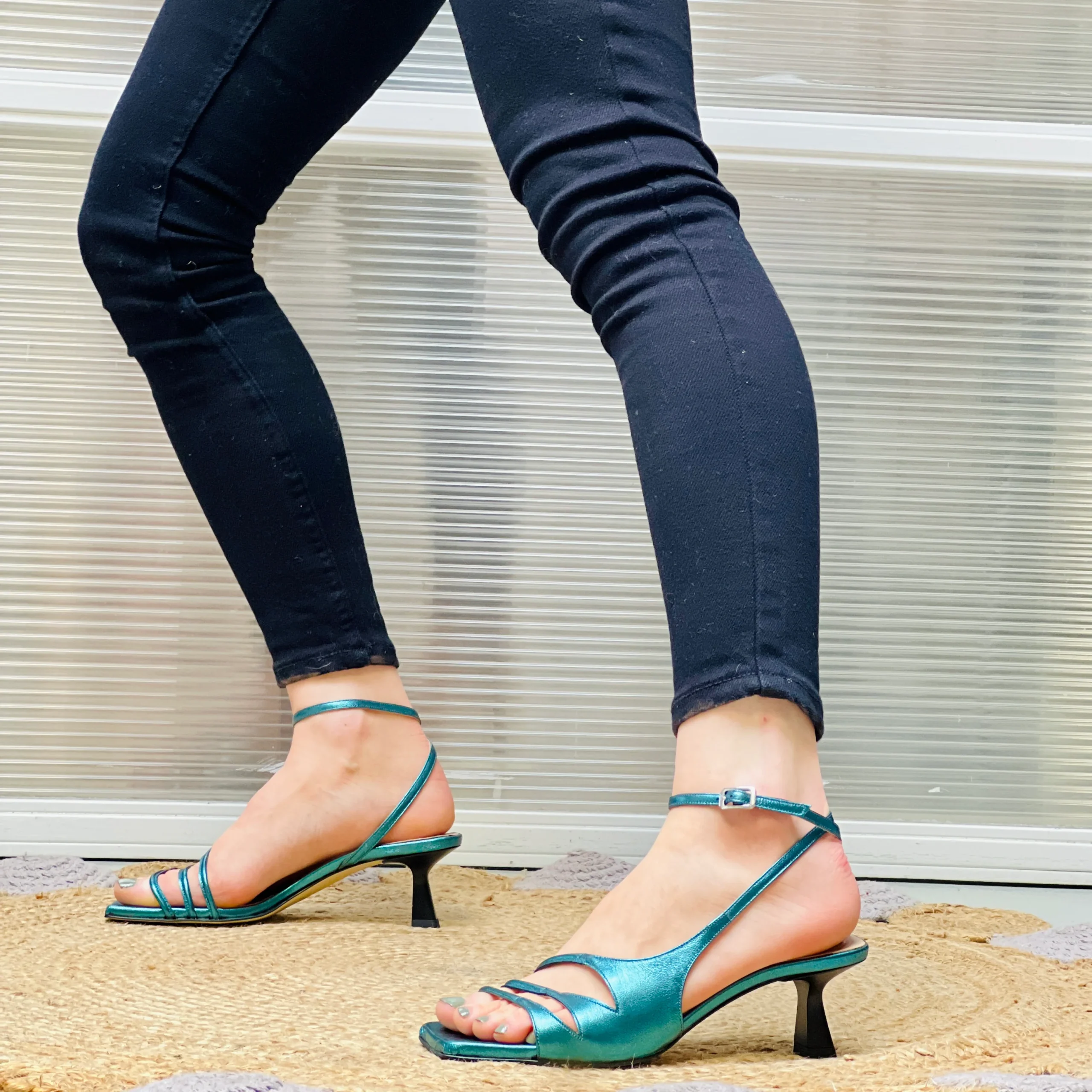 il gioco del cinturino esterno che si incrocia poi in caviglia lo alleggerisce e ne conferisce eleganza.