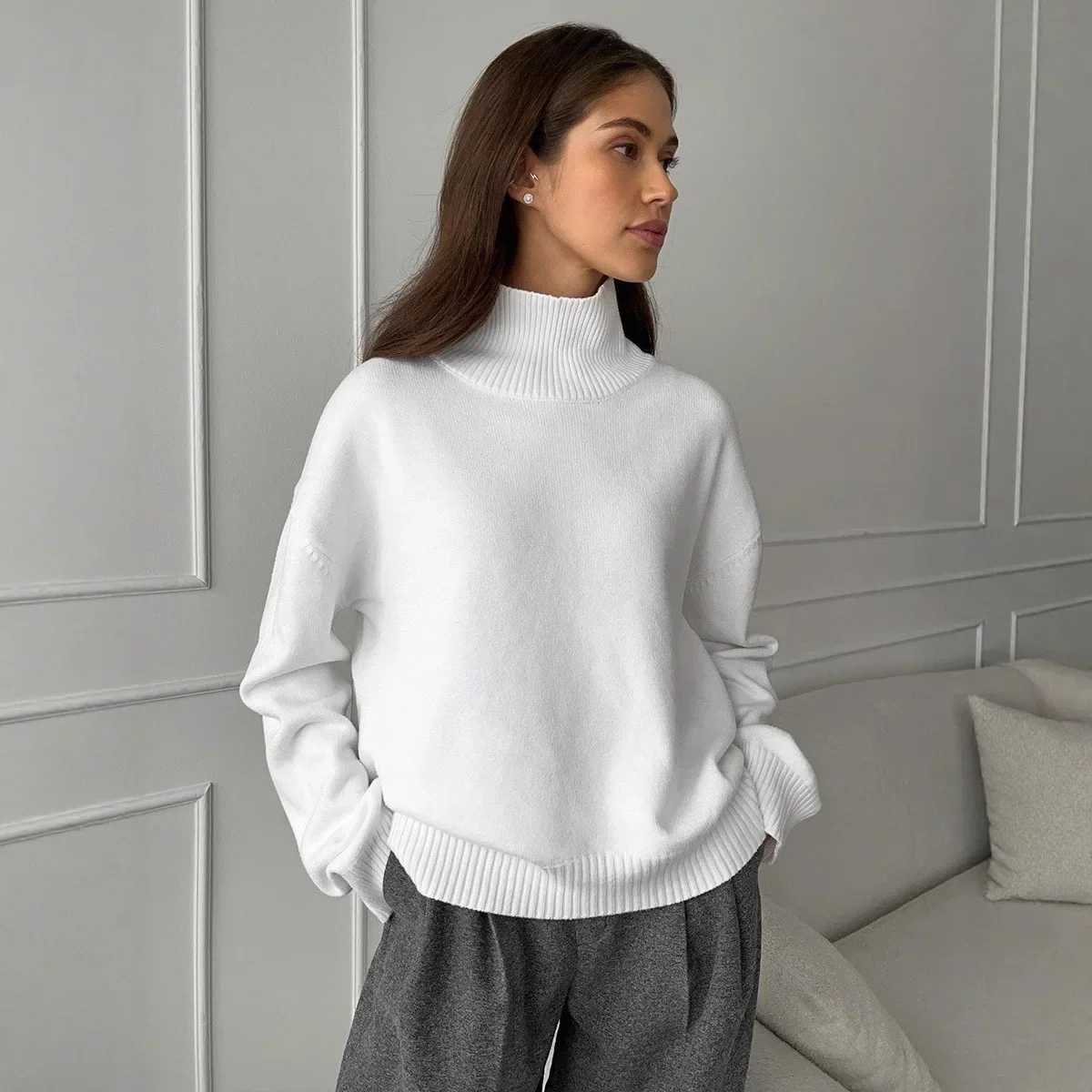 Pensato per l’autunno e l’inverno, questo maglione a collo alto e dalla vestibilità ampia offre uno stile casual senza compromettere il comfort. Il suo tessuto morbido e soffice offre una sensazione avvolgente pur mantenendo un look raffinato.