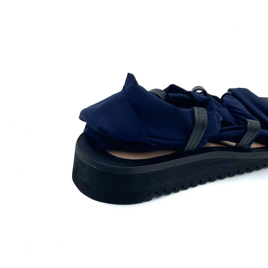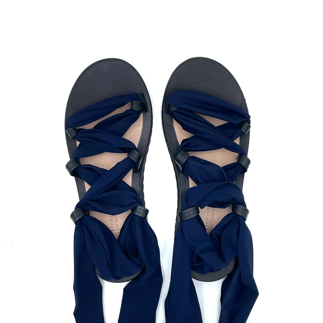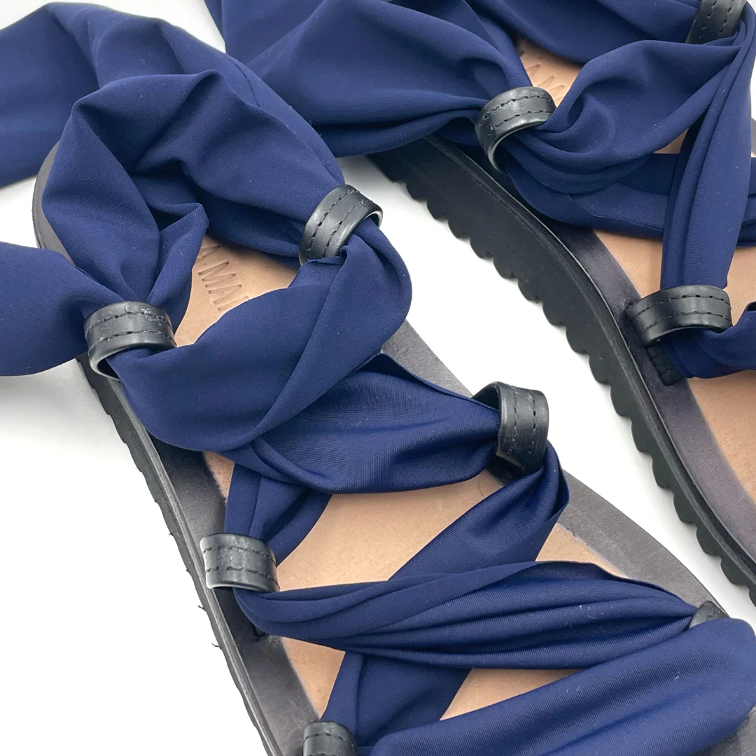 Il Metasandalo nasce dalla collaborazione con le Clotilde, amiche e colleghe artigiane. Le fasce che riceverai insieme al sandalo sono in lycra, un materiale super pratico, facile da lavare e che si asciuga in pochissimo tempo: perfetto per l’estate insomma! Questo kit contiene una coppia di fasce blu navy, ma nulla ti vieta di seguire la creatività : puoi creare le tue fasce usando magliette vecchie, collant o tessuti come il pizzo. La suola in microporosa Vibram è estremamente leggera e ha un altezza di 3 cm sul tallone.