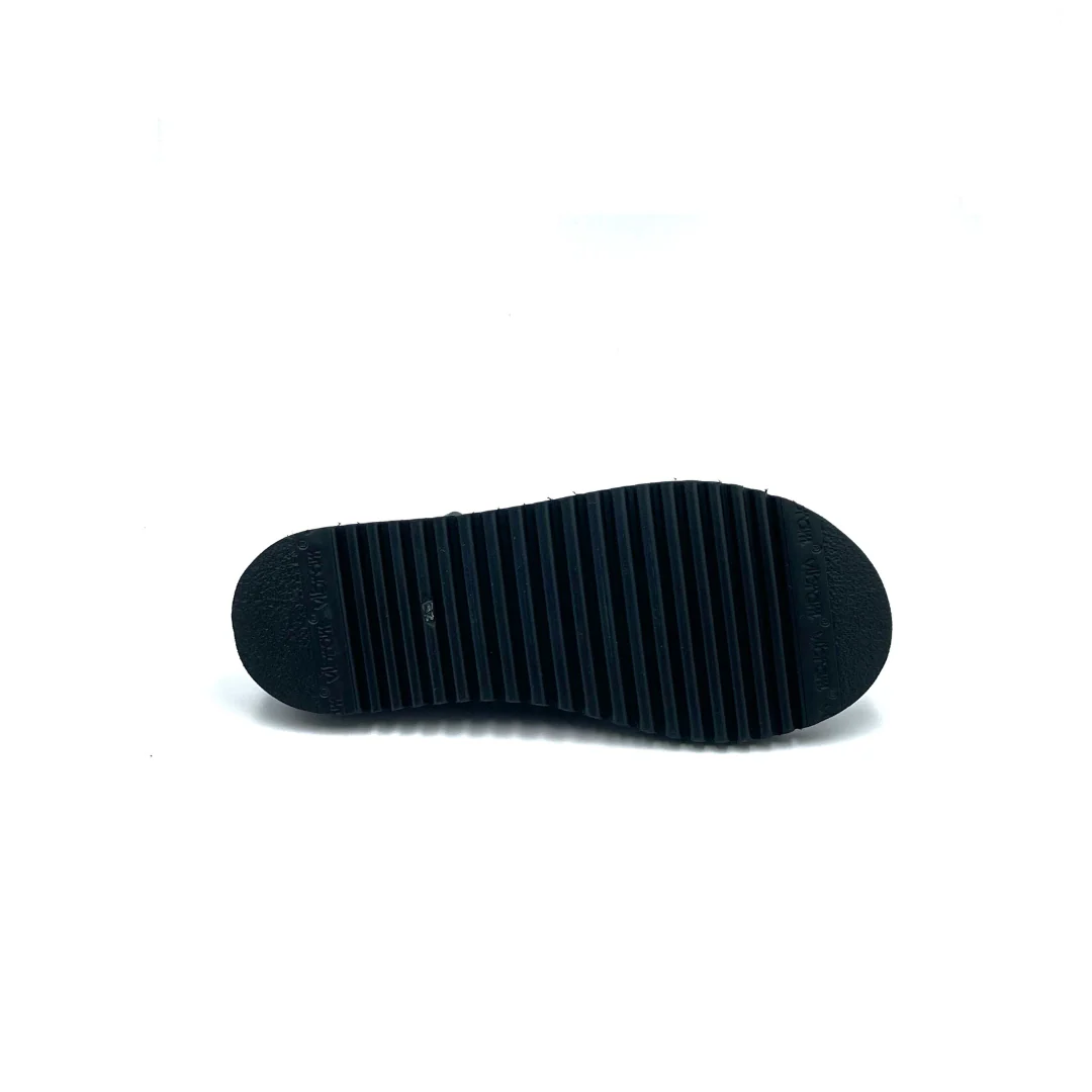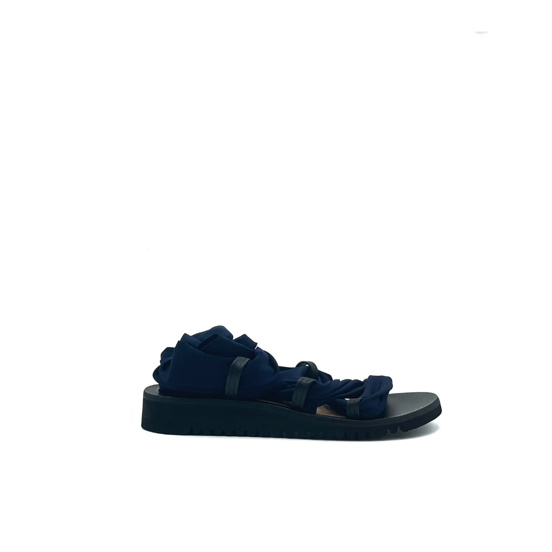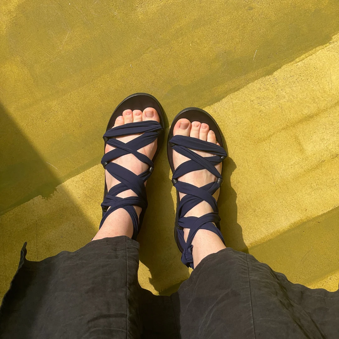Il Metasandalo nasce dalla collaborazione con le Clotilde, amiche e colleghe artigiane. Le fasce che riceverai insieme al sandalo sono in lycra, un materiale super pratico, facile da lavare e che si asciuga in pochissimo tempo: perfetto per l’estate insomma! Questo kit contiene una coppia di fasce blu navy, ma nulla ti vieta di seguire la creatività : puoi creare le tue fasce usando magliette vecchie, collant o tessuti come il pizzo. La suola in microporosa Vibram è estremamente leggera e ha un altezza di 3 cm sul tallone.