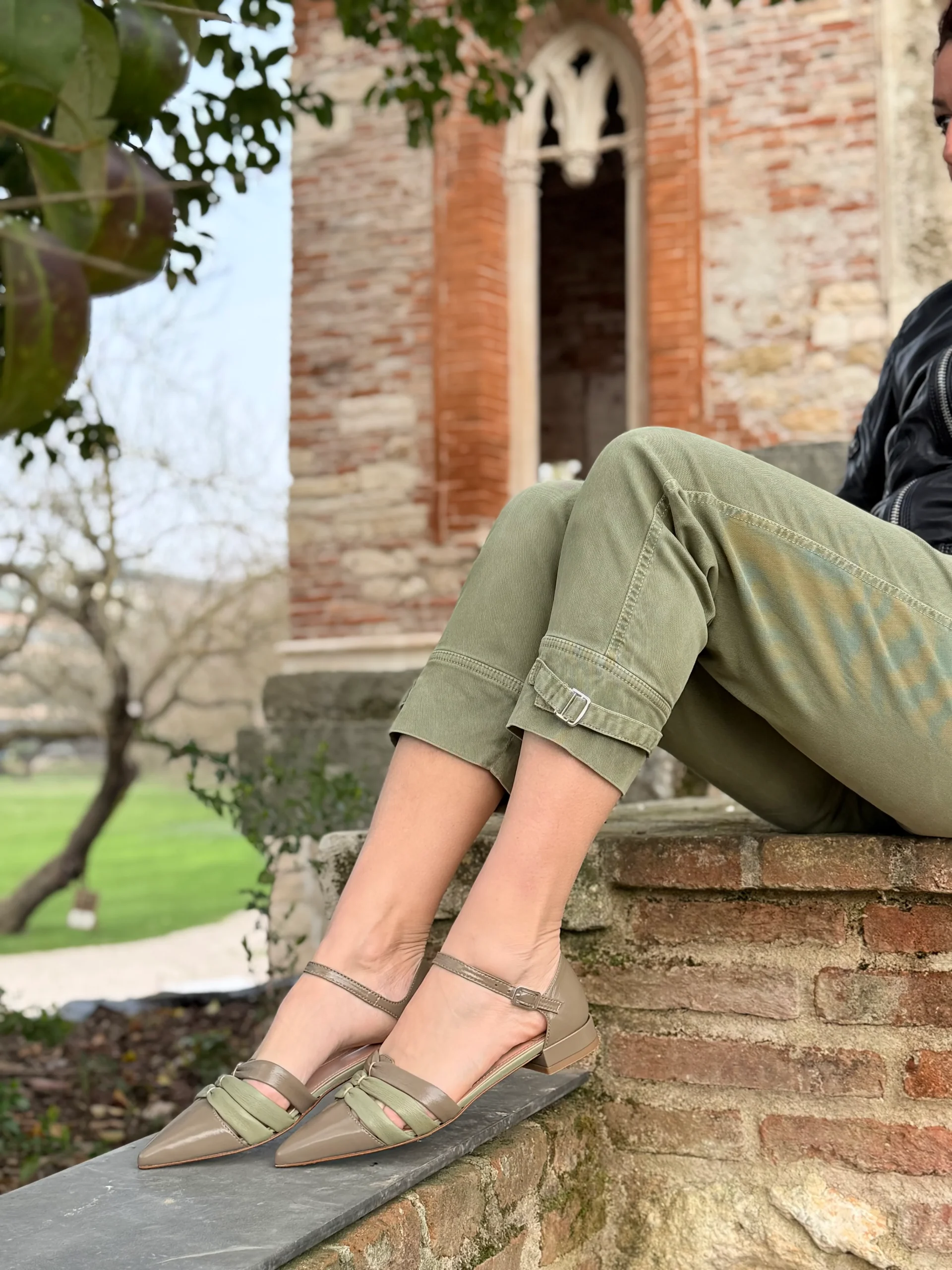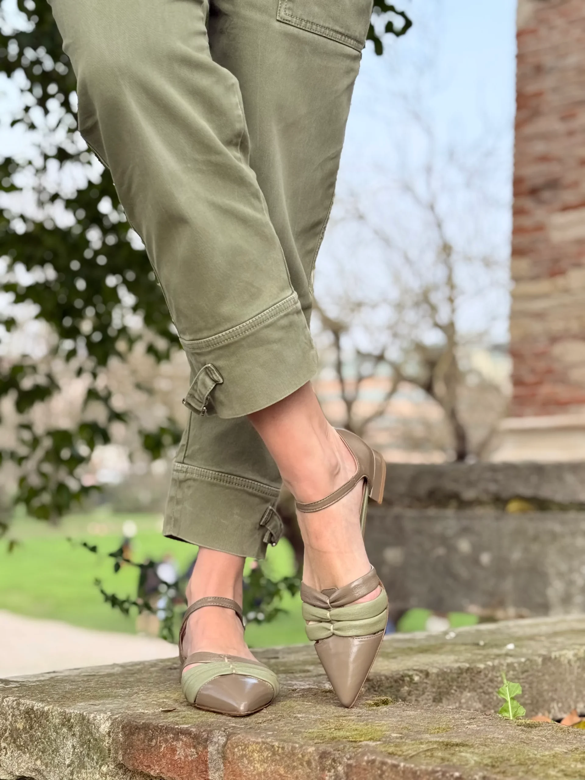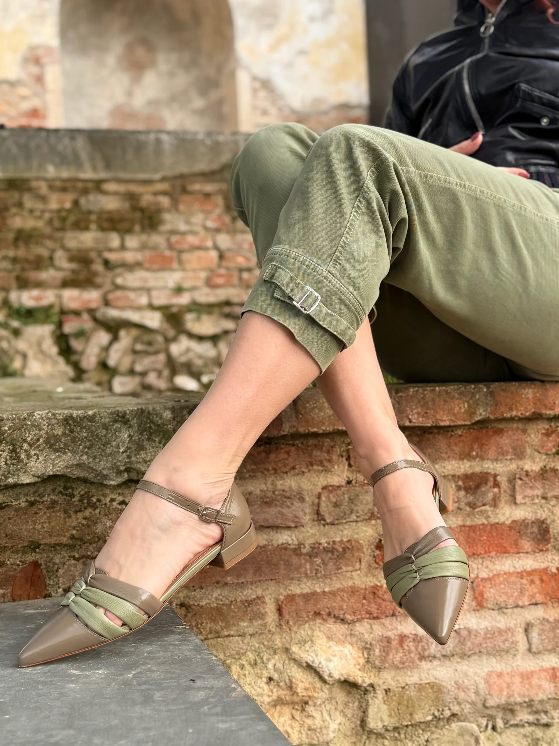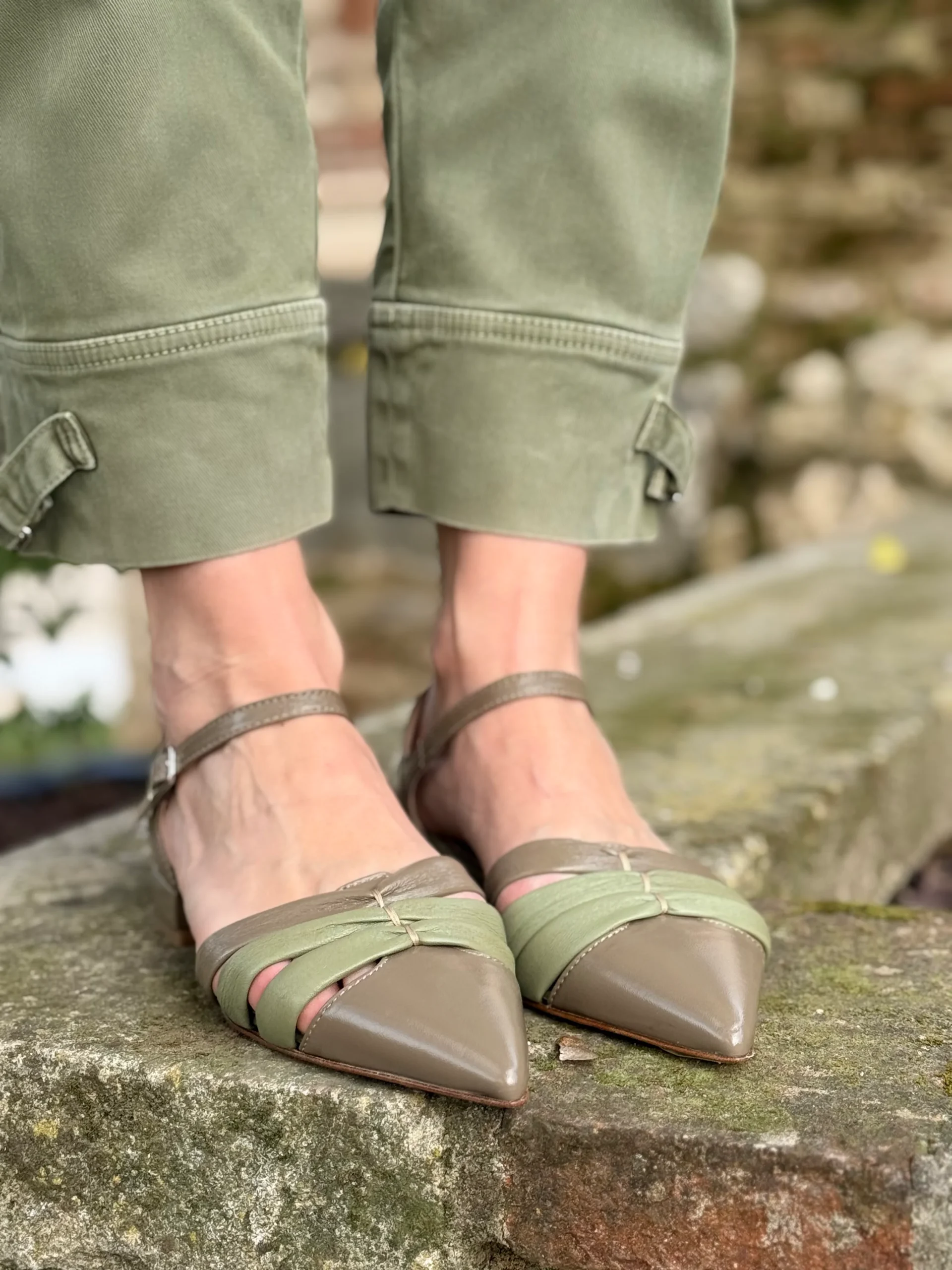 A renderla ancora più particolare ci pensano le tre fasce in nappa tubolare morbidissima, due delle quali in delicata tonalità verde salvia: un dettaglio originale e armonioso che avvolge il piede con dolcezza, seguendone i movimenti senza costringere.