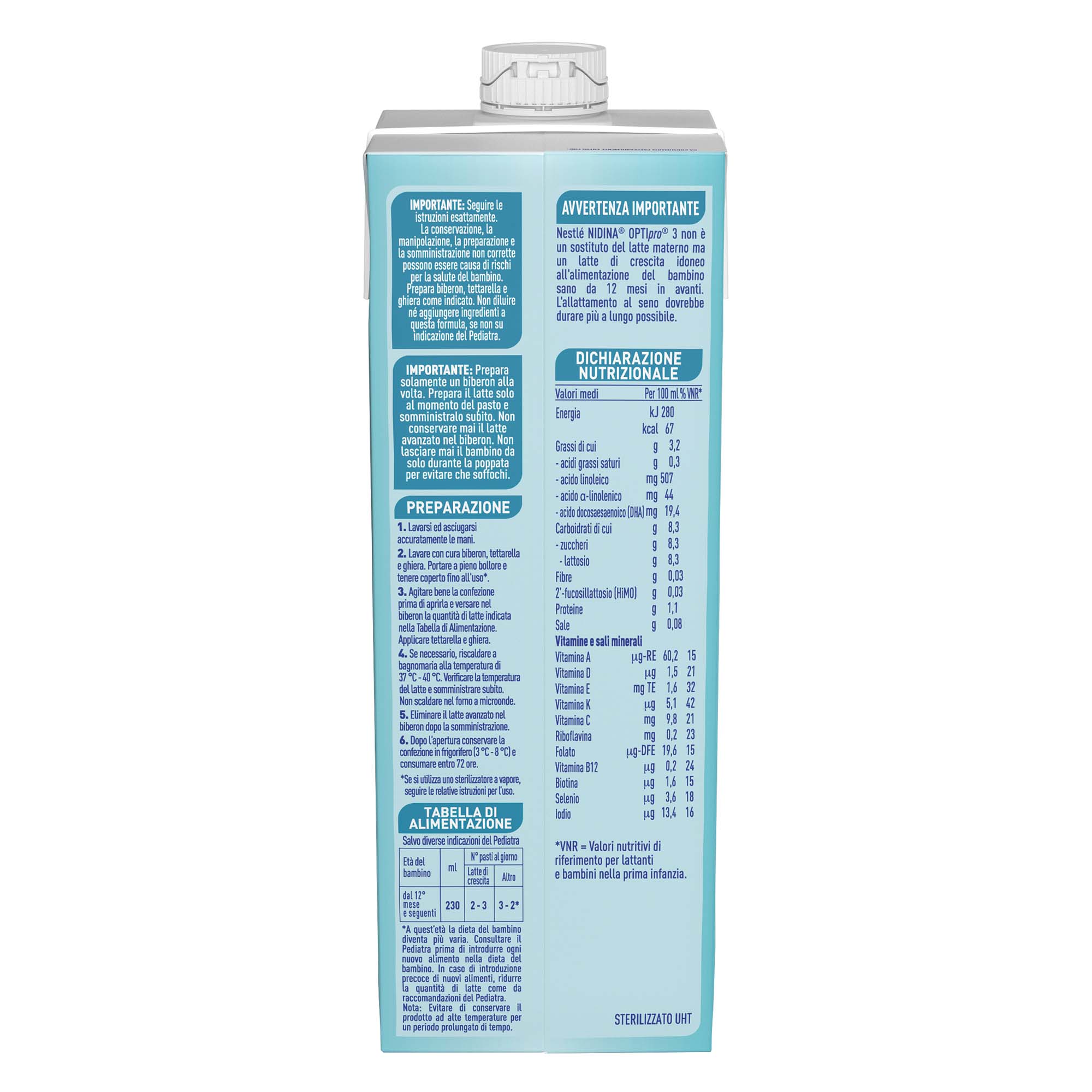 Nestlé® NIDINA® OPTIpro® 3 è un latte di crescita liquido indicato per l’alimentazione del bambino dai 12 mesi, nell’ambito di una dieta varia ed equilibrata e di uno stile di vita sano.