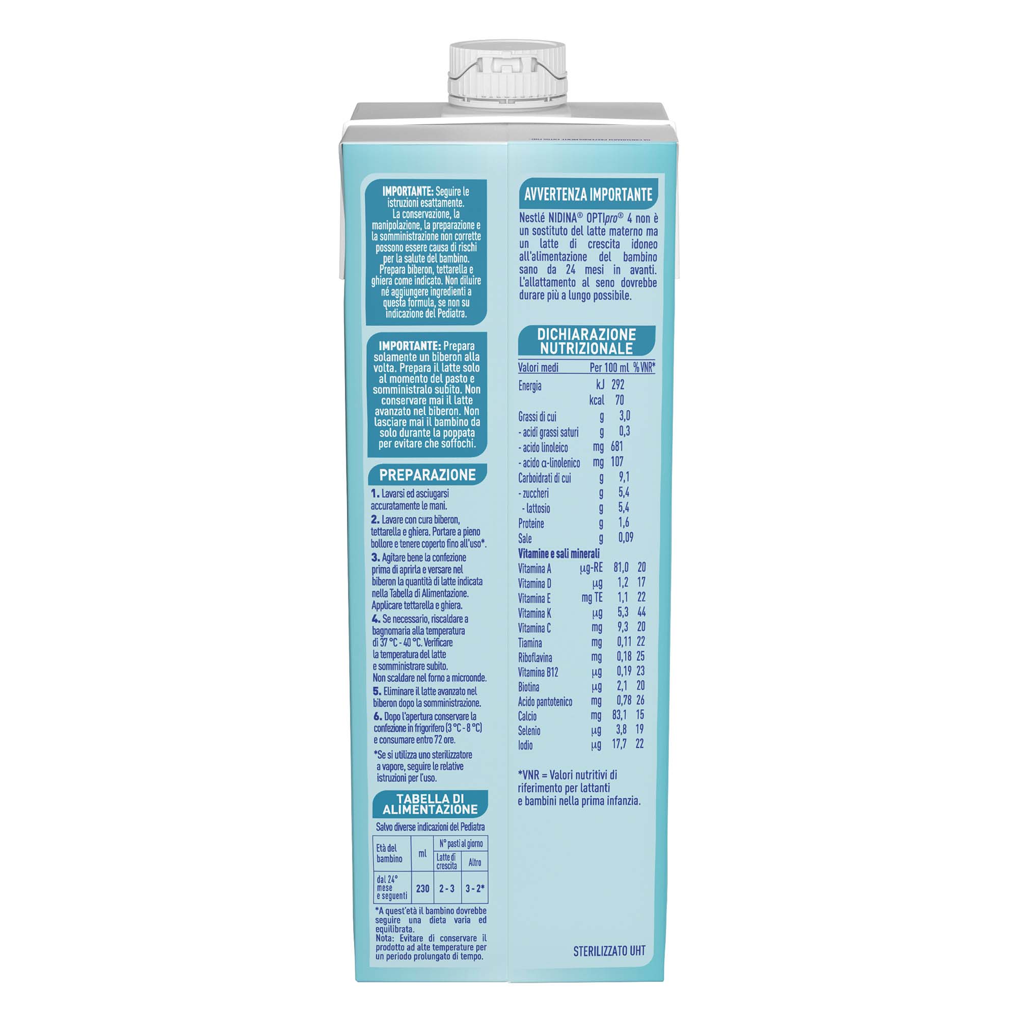 Nestlé® NIDINA® OPTIpro® 4 è un latte di crescita liquido indicato per l’alimentazione del bambino dai 24 mesi, nell’ambito di una dieta varia ed equilibrata e di uno stile di vita sano.