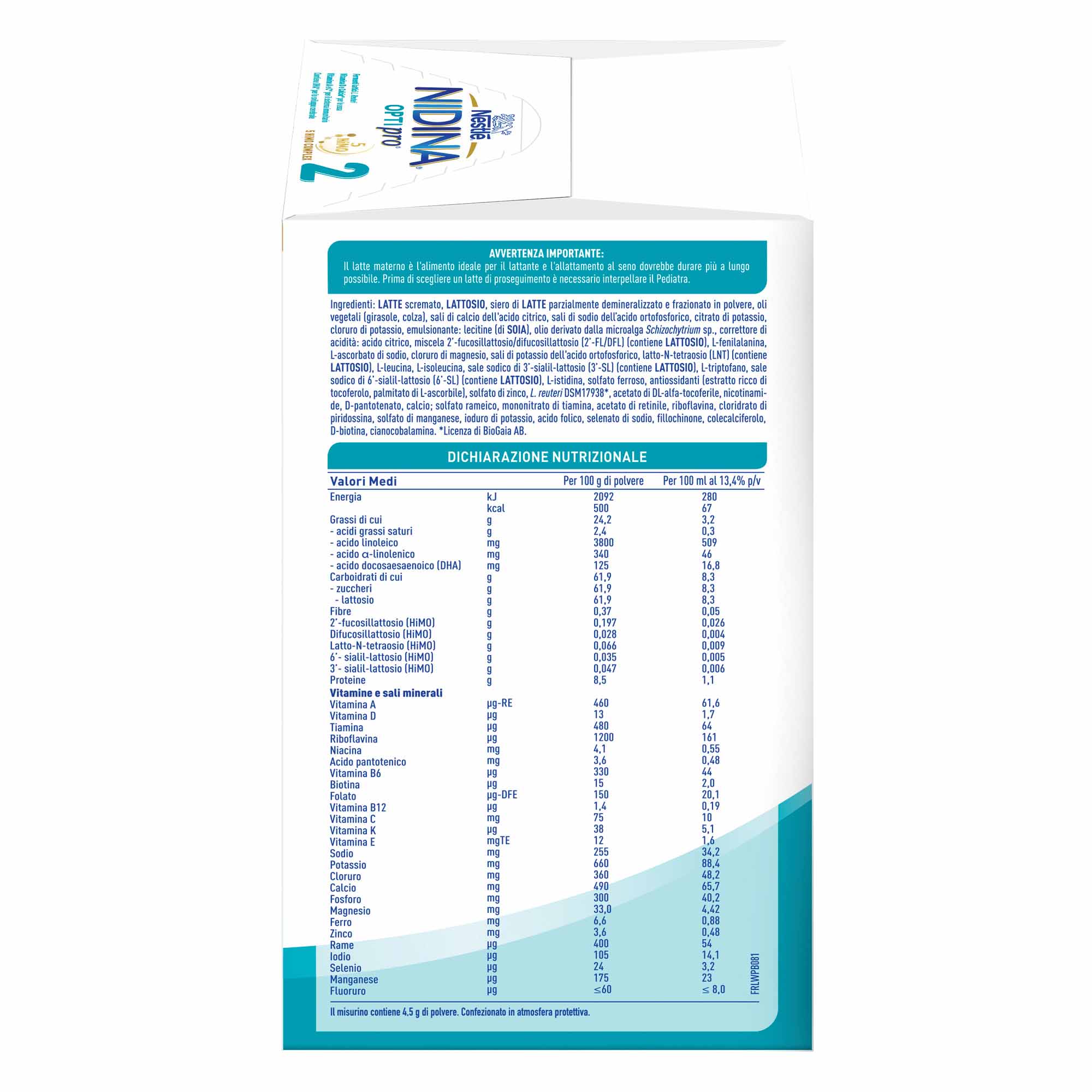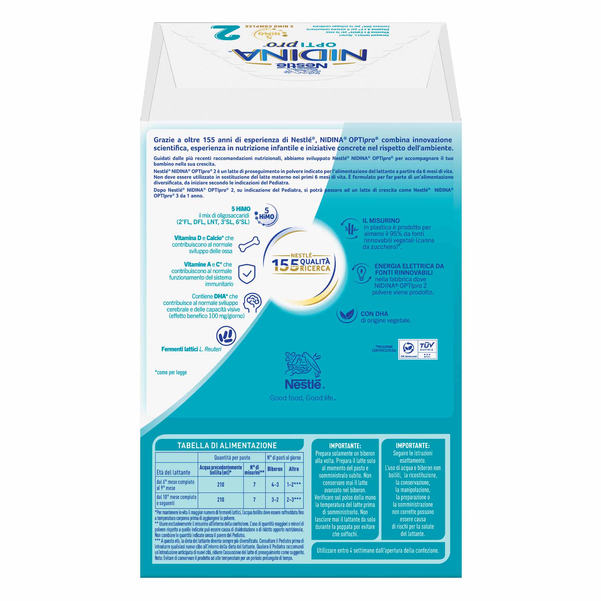 Nestlé® NIDINA® OPTIpro® 2 è un latte di proseguimento in polvere indicato per l’alimentazione del lattante a partire da 6 mesi di vita. Non deve essere utilizzato in sostituzione del latte materno nei primi 6 mesi di vita. È formulato per far parte di un’alimentazione diversificata, da iniziare secondo le indicazioni del Pediatra.