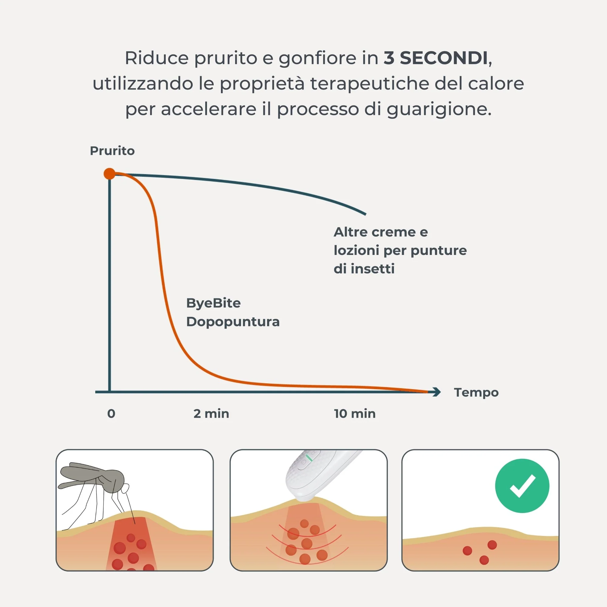 Tenendo il dopopuntura a contatto con la pelle per pochi secondi, il calore localizzato penetra sotto la superficie cutanea irritata dalla puntura dell’insetto neutralizzando la saliva ricca di enzimi degli insetti. Una volta dissolte le sostanze irritanti, la reazione immunitaria del corpo viene interrotta, garantendo un rapido sollievo da dolore, gonfiore e prurito in soli 3 secondi.