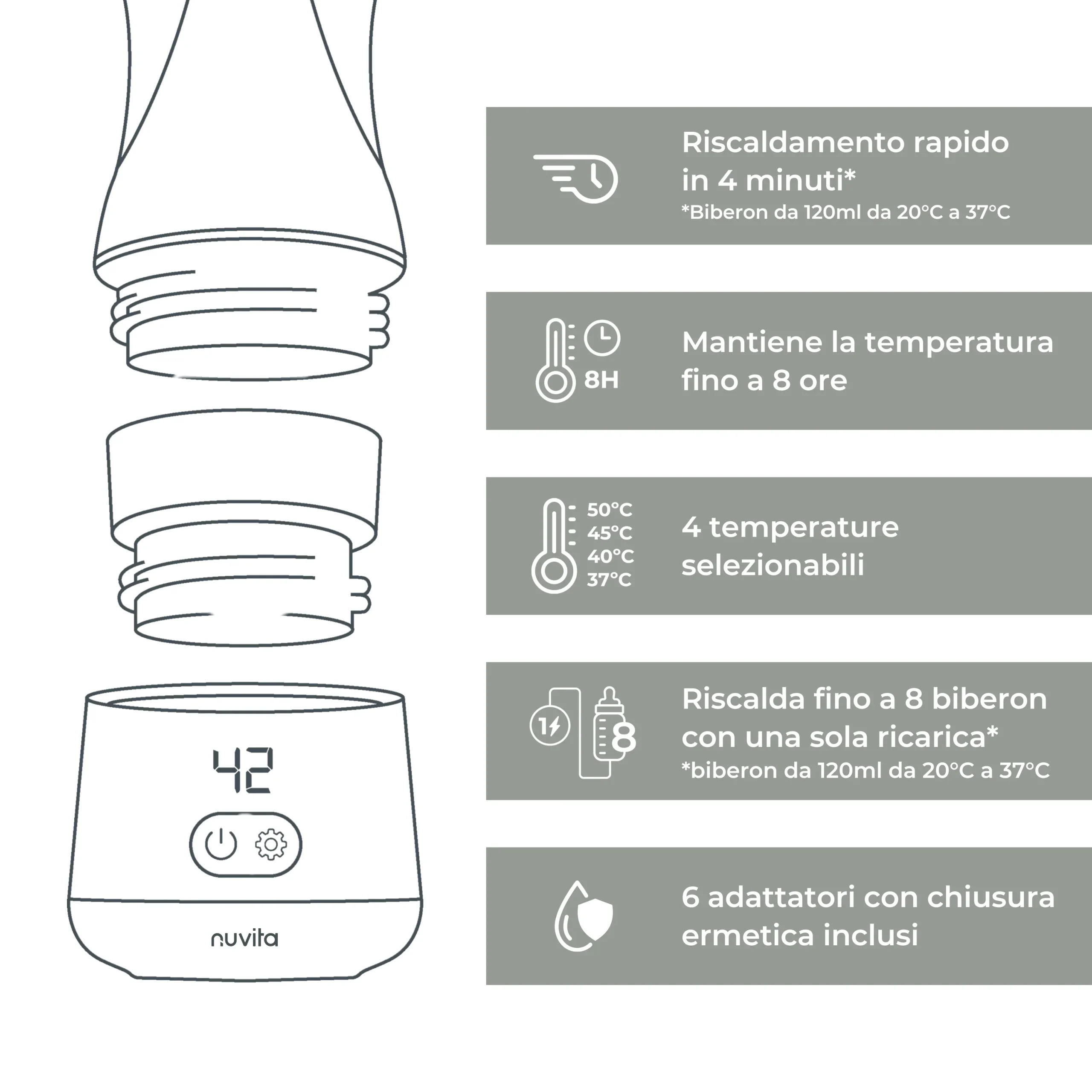 - Compatibile con tutti i modelli di biberon grazie ai 6 adattatori inclusi.