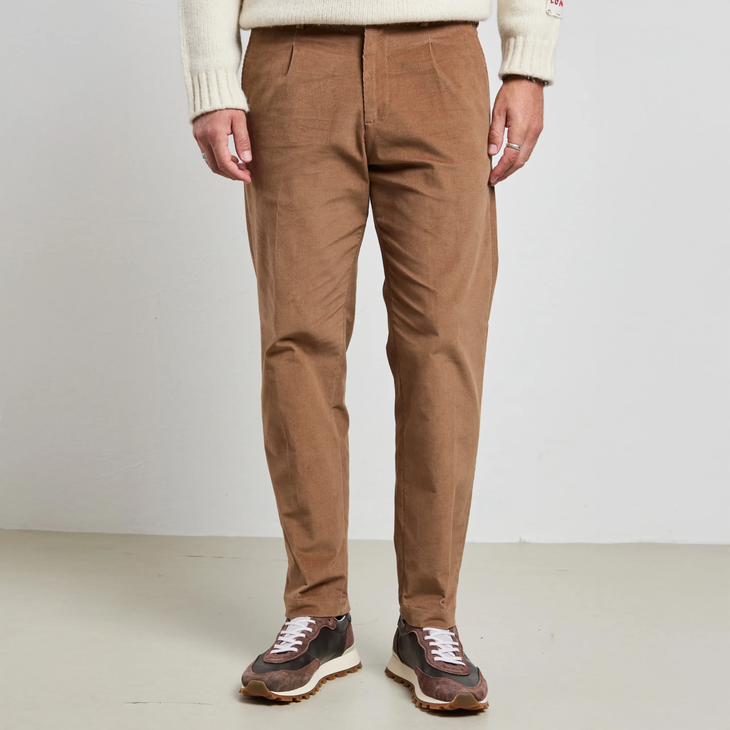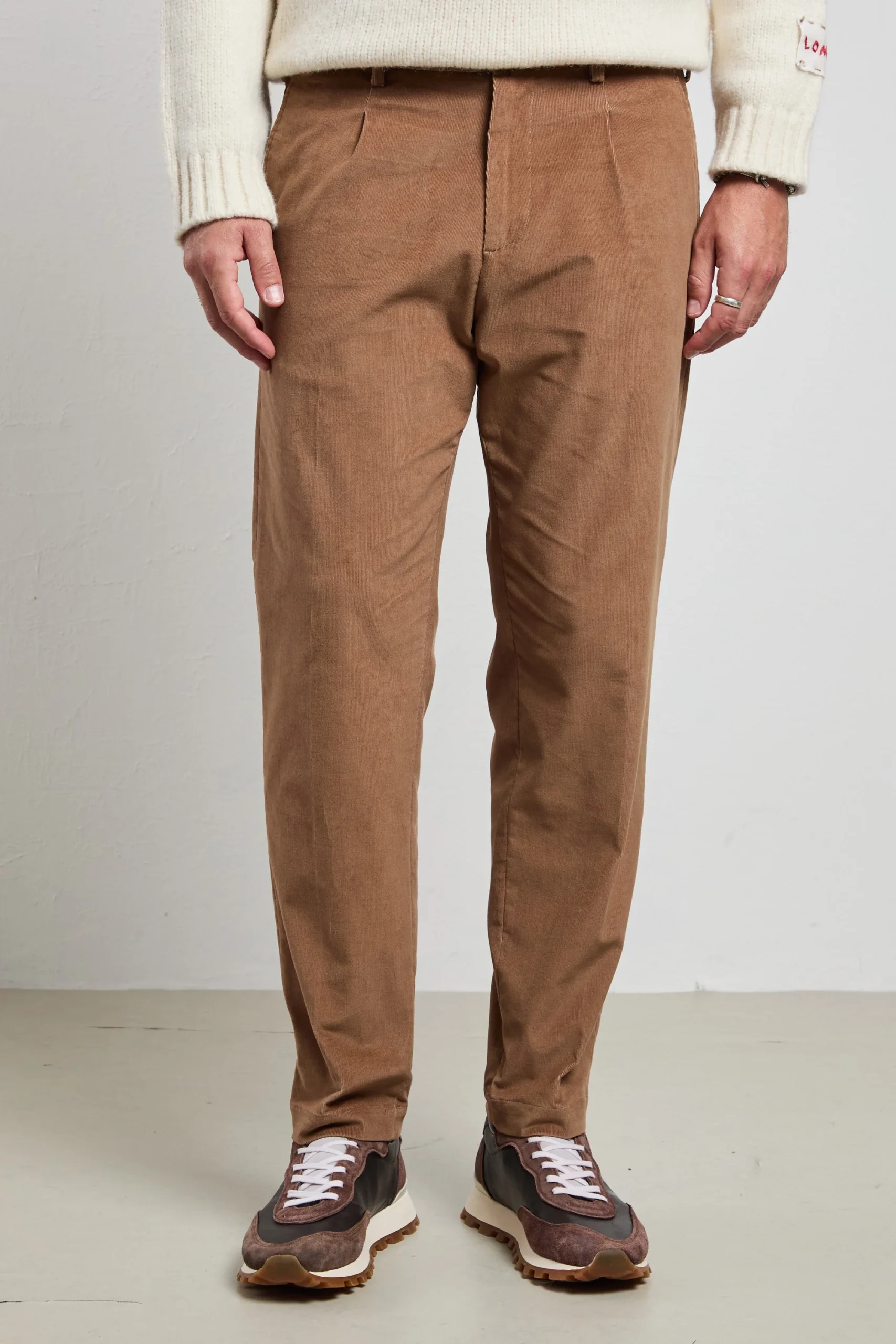 Questo pantalone è un capo sofisticato e versatile, realizzato in un morbidissimo velluto millerighe che aggiunge una texture raffinata. Le pinces donano una linea elegante, mentre l’inserto di elastico in vita rendono la vestibilità regolare comoda. Il loro colore neutro e la texture delicata li rendono facilmente abbinabili a una varietà di outfit. Stanno bene con un maglione in lana merino color nero per un look sofisticato, oppure con una camicia blu chiaro e mocassini per un’interpretazione più formale e raffinata. Per un look casual, prova a indossarli con una t-shirt bianca e un giubbotto di pelle per un contrasto moderno e grintoso.