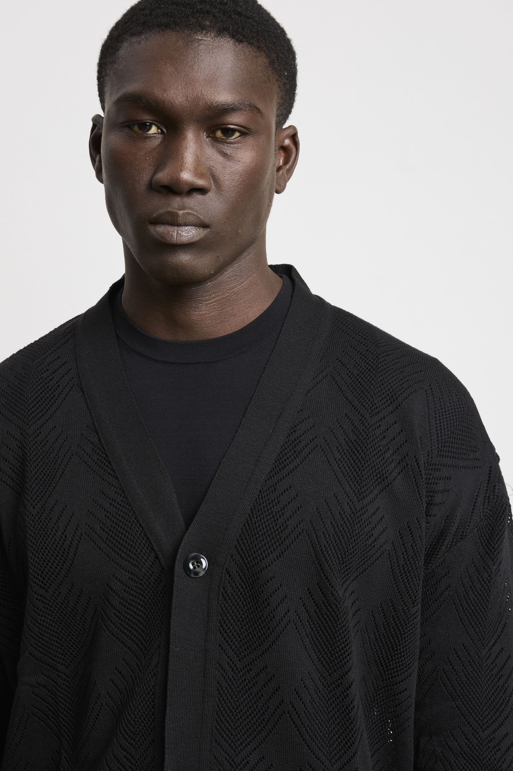Questo cardigan è realizzato con una trama traforata che conferisce leggerezza ed eleganza. Il nero intenso garantisce versatilità cromatica e si abbina facilmente a qualsiasi composizione di stile. La chiusura a bottoni permette molteplici modalità di indosso, dalla versione completamente chiusa a quella aperta per stratificazione. La vestibilità regolare mantiene proporzioni classiche e naturali. Il taglio dritto e la lunghezza non eccessiva creano una silhouette equilibrata e senza tempo. La costruzione italiana assicura solidità costruttiva e attenzione ai dettagli, rendendo questo cardigan un pezzo fondamentale per un guardaroba consapevole e duraturo.