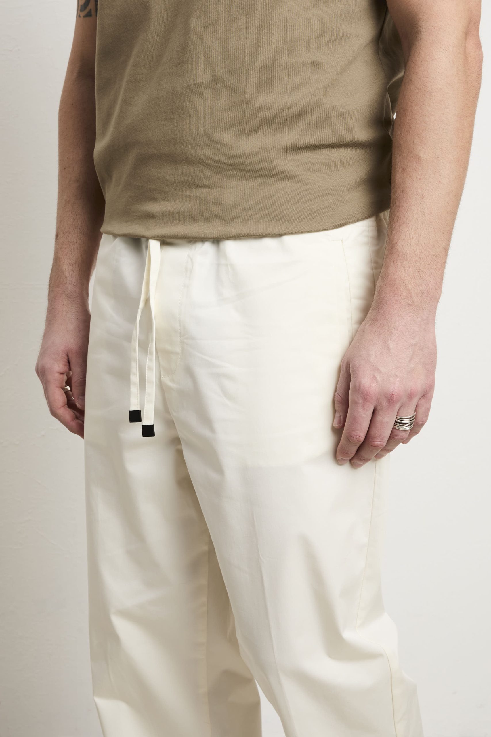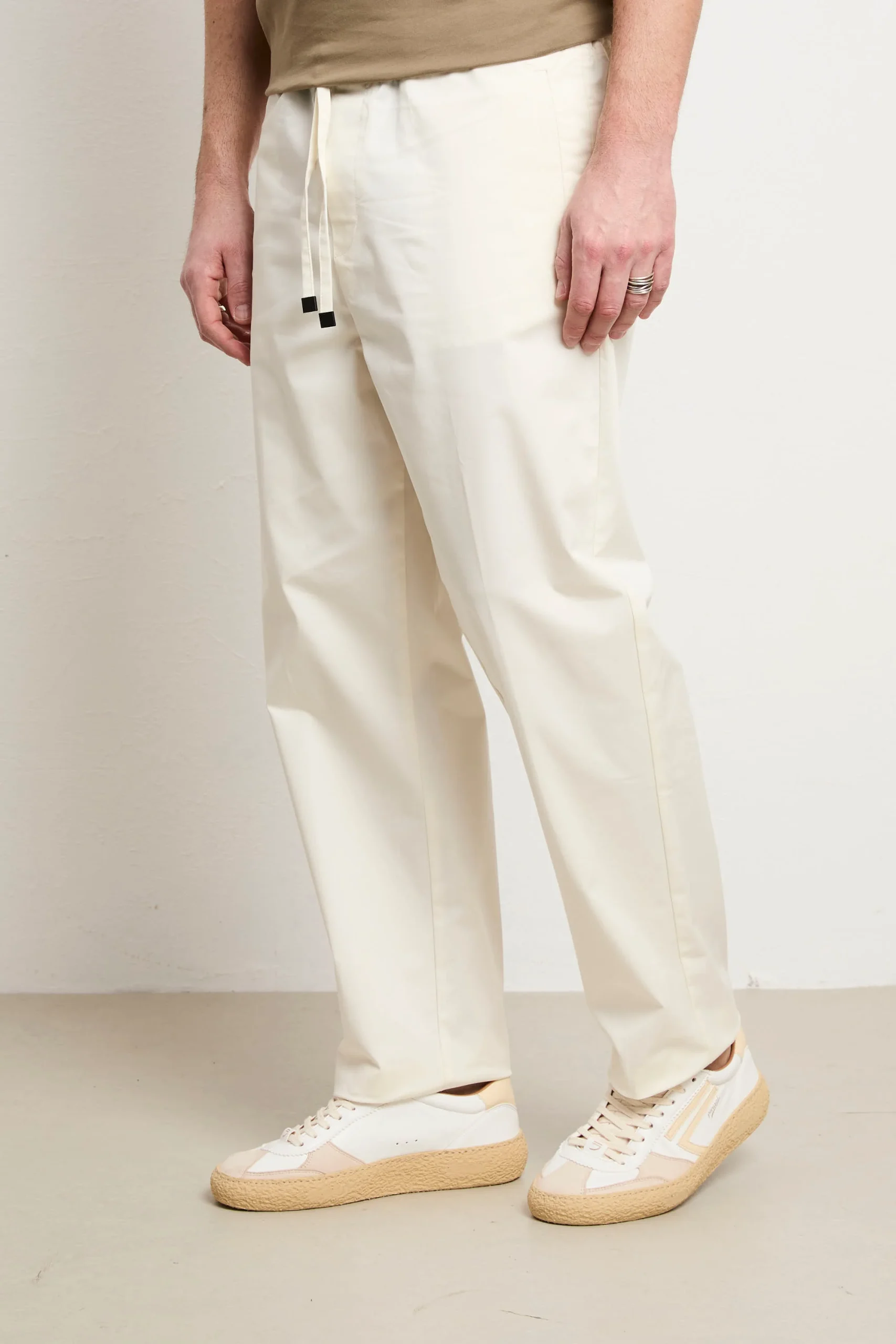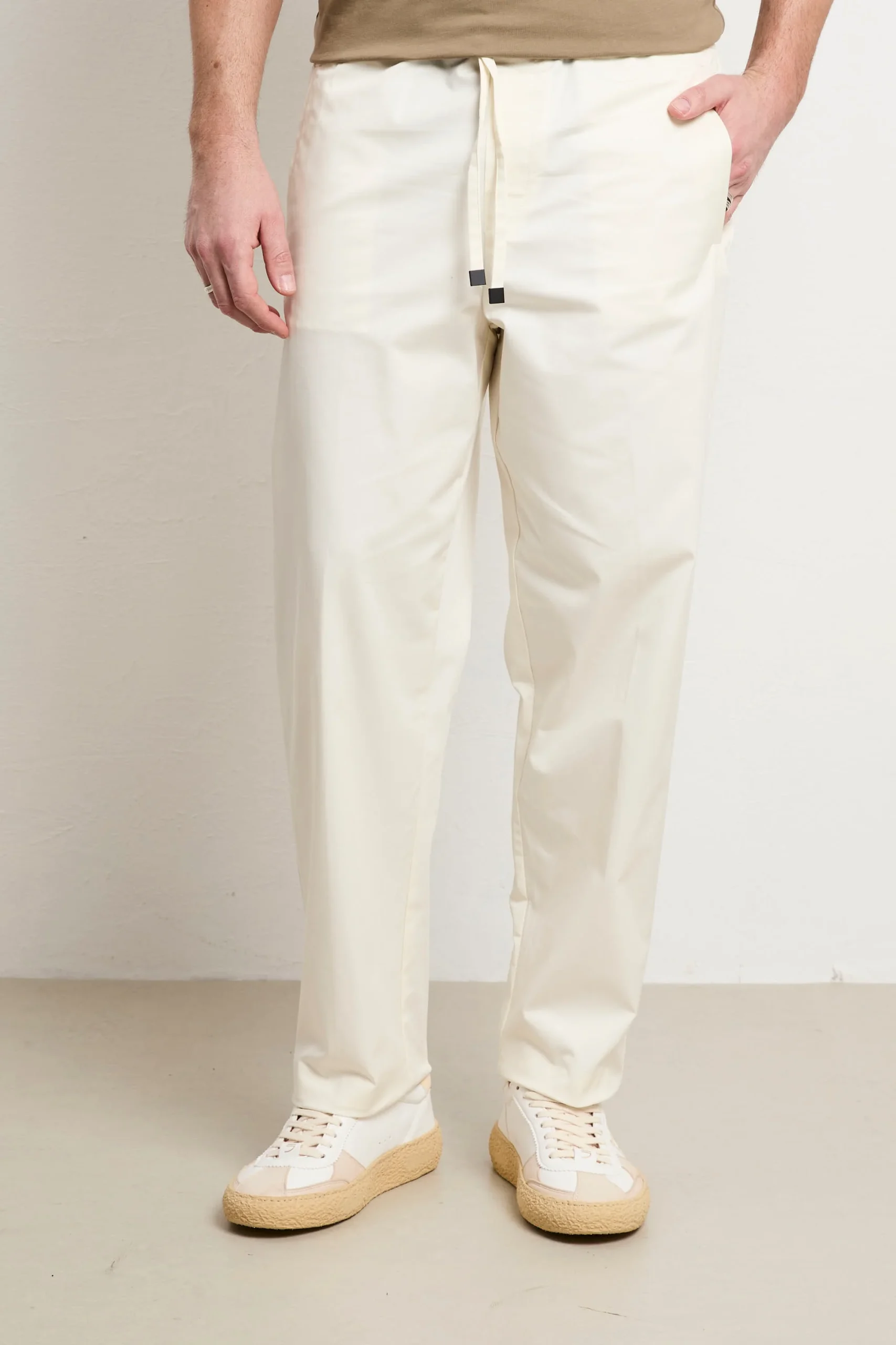 Pantalone in gabardina stretch leggera, progettato per chi non scende a compromessi tra stile e benessere. La composizione offre elasticità naturale e traspirabilità superiore, ideale per indossare tutto il giorno. Il loose fit e la vita normale creano una silhouette moderna e rilassata, perfetta per uno stile casual-smart versatile. Le tasche laterali oblique garantiscono praticità , mentre la tasca posteriore a patta aggiunge carattere autentico. La chiusura con elastico e coulisse permette una vestibilità personalizzabile e confortevole, adattandosi perfettamente al tuo corpo. Il colore panna neutro è un alleato versatile che si abbina facilmente a qualsiasi palette cromatica. Realizzato con orgoglio in Italia, questo pantalone è un investimento consapevole in qualità costruttiva e design essenziale che dura nel tempo.