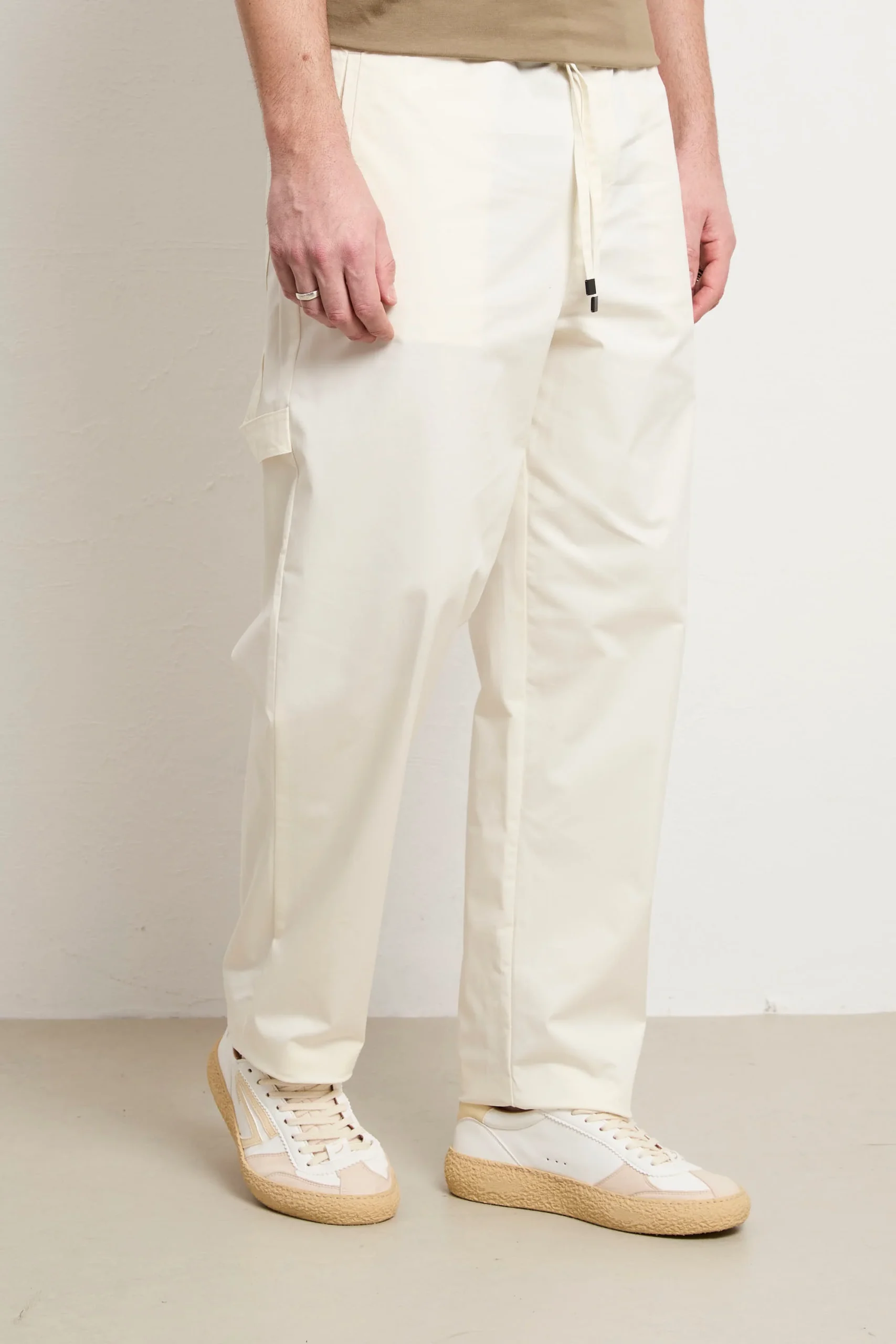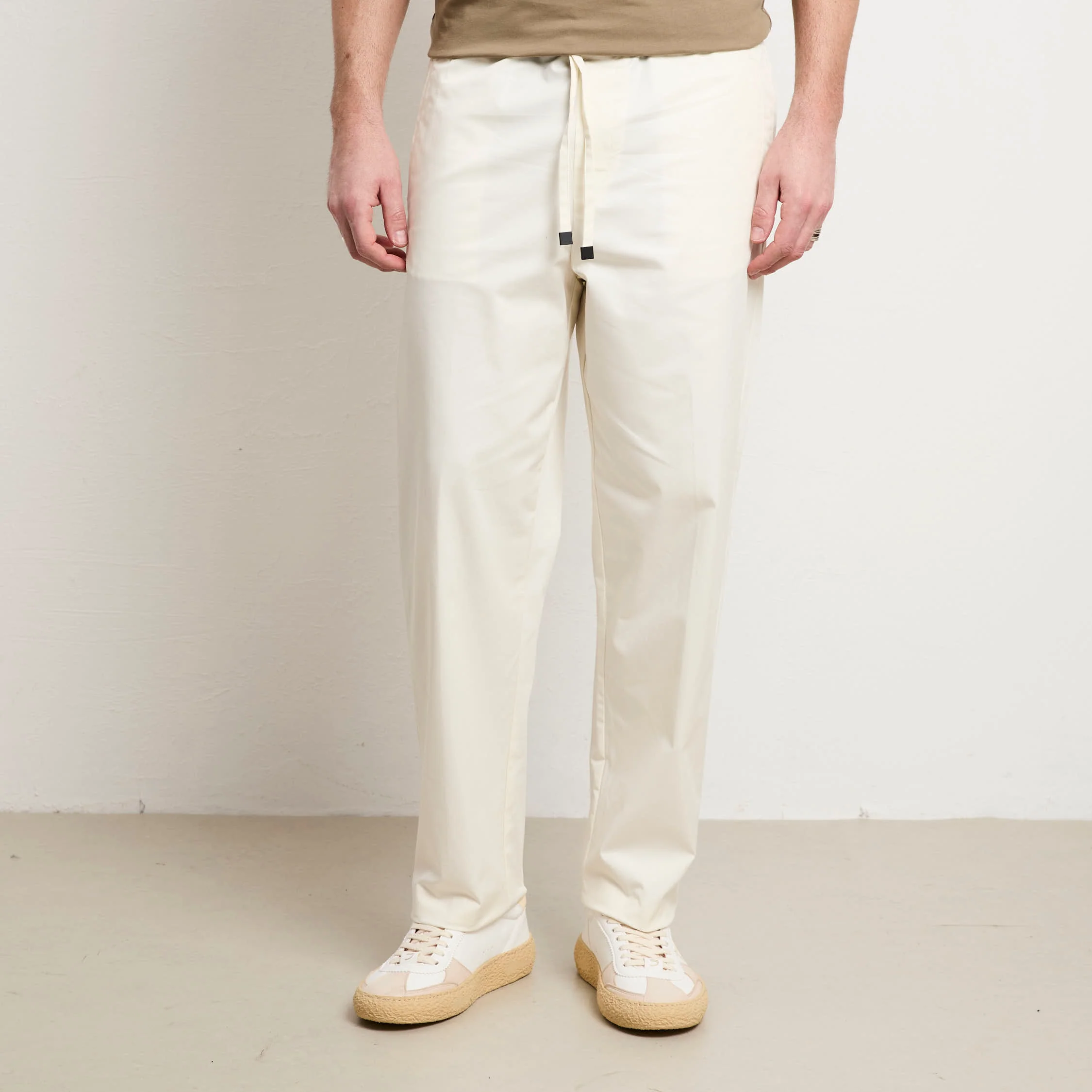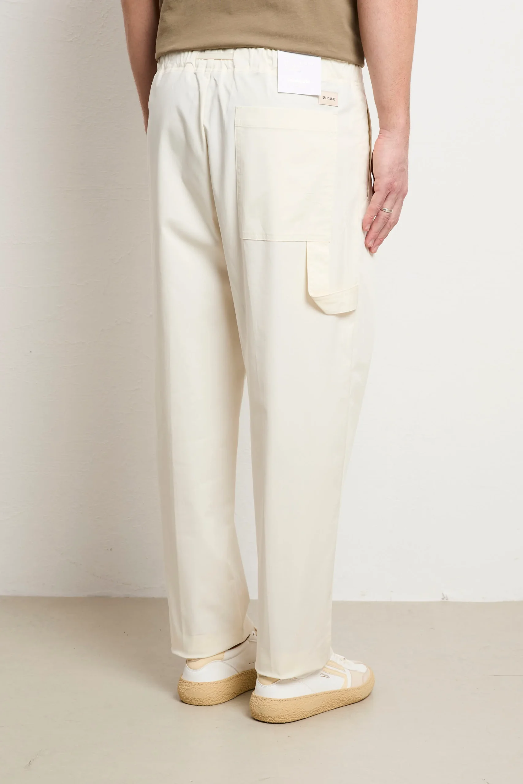 Pantalone in gabardina stretch leggera, progettato per chi non scende a compromessi tra stile e benessere. La composizione offre elasticità naturale e traspirabilità superiore, ideale per indossare tutto il giorno. Il loose fit e la vita normale creano una silhouette moderna e rilassata, perfetta per uno stile casual-smart versatile. Le tasche laterali oblique garantiscono praticità , mentre la tasca posteriore a patta aggiunge carattere autentico. La chiusura con elastico e coulisse permette una vestibilità personalizzabile e confortevole, adattandosi perfettamente al tuo corpo. Il colore panna neutro è un alleato versatile che si abbina facilmente a qualsiasi palette cromatica. Realizzato con orgoglio in Italia, questo pantalone è un investimento consapevole in qualità costruttiva e design essenziale che dura nel tempo.