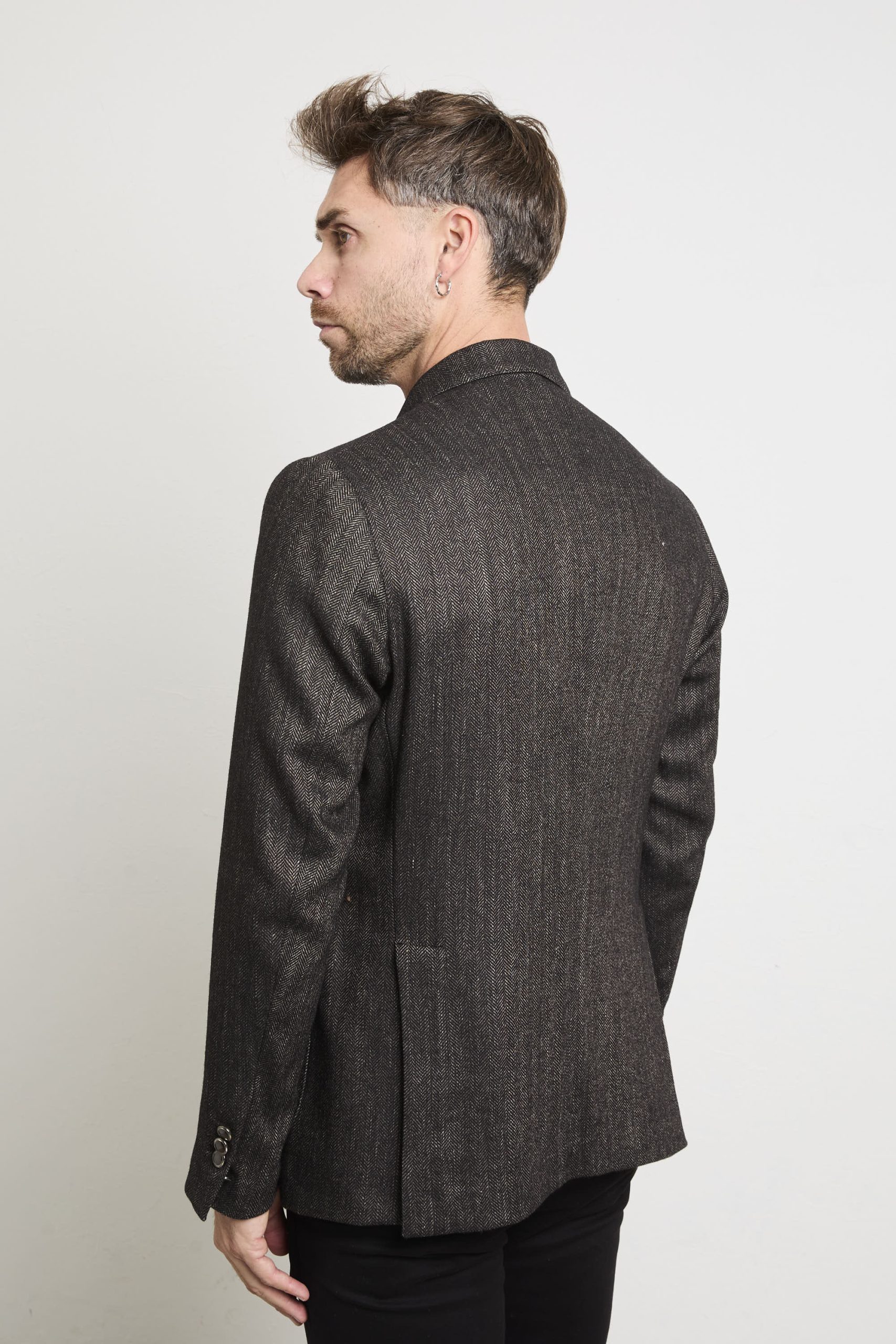 Giacca doppiopetto in lana dalla trama spigata, raffinata e contemporanea. Il colore marrone mélange dona profondità e carattere, ideale per chi ama uno stile elegante ma con personalità . Perfetta da indossare con dolcevita neri o camicie chiare, pantaloni in fustagno o denim scuro, e stivaletti in pelle per un look sofisticato e moderno.