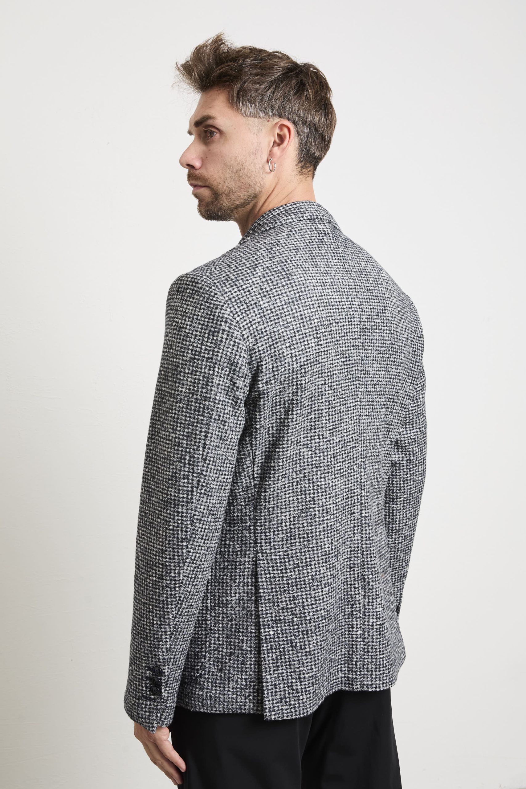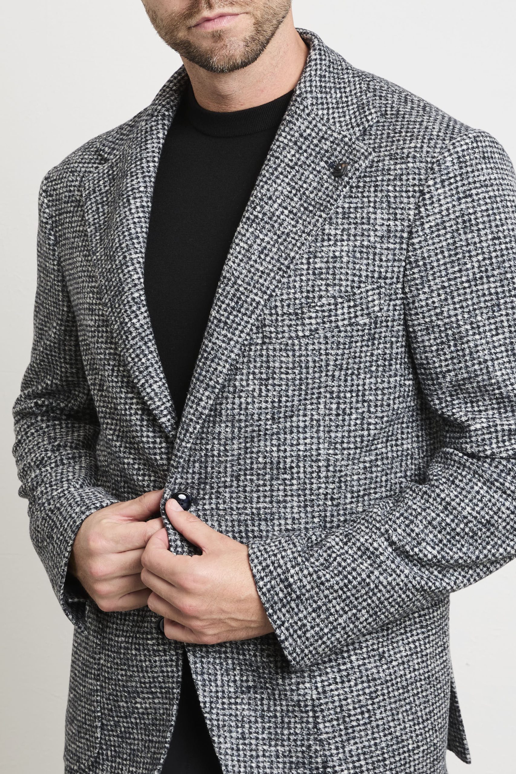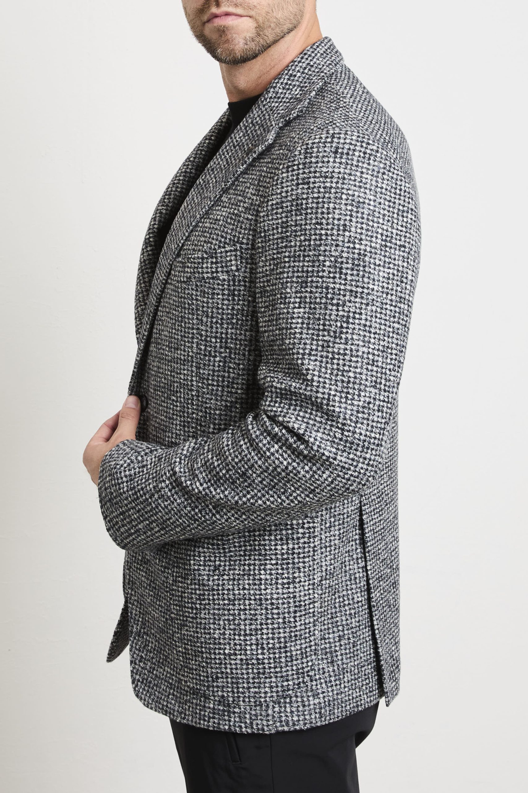 • Tessuto: lavorazione micro pied-de-poule mélange con effetto tridimensionale