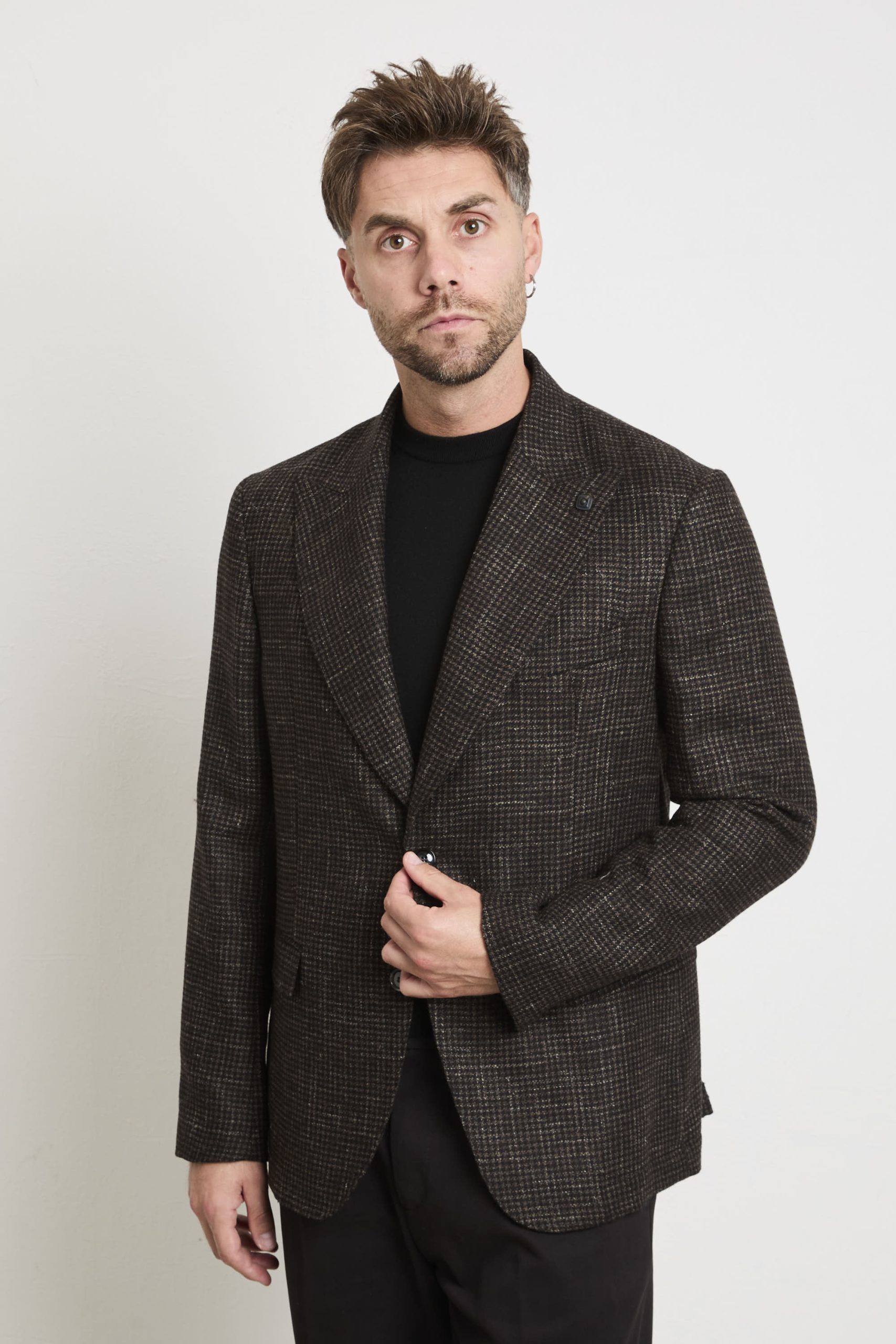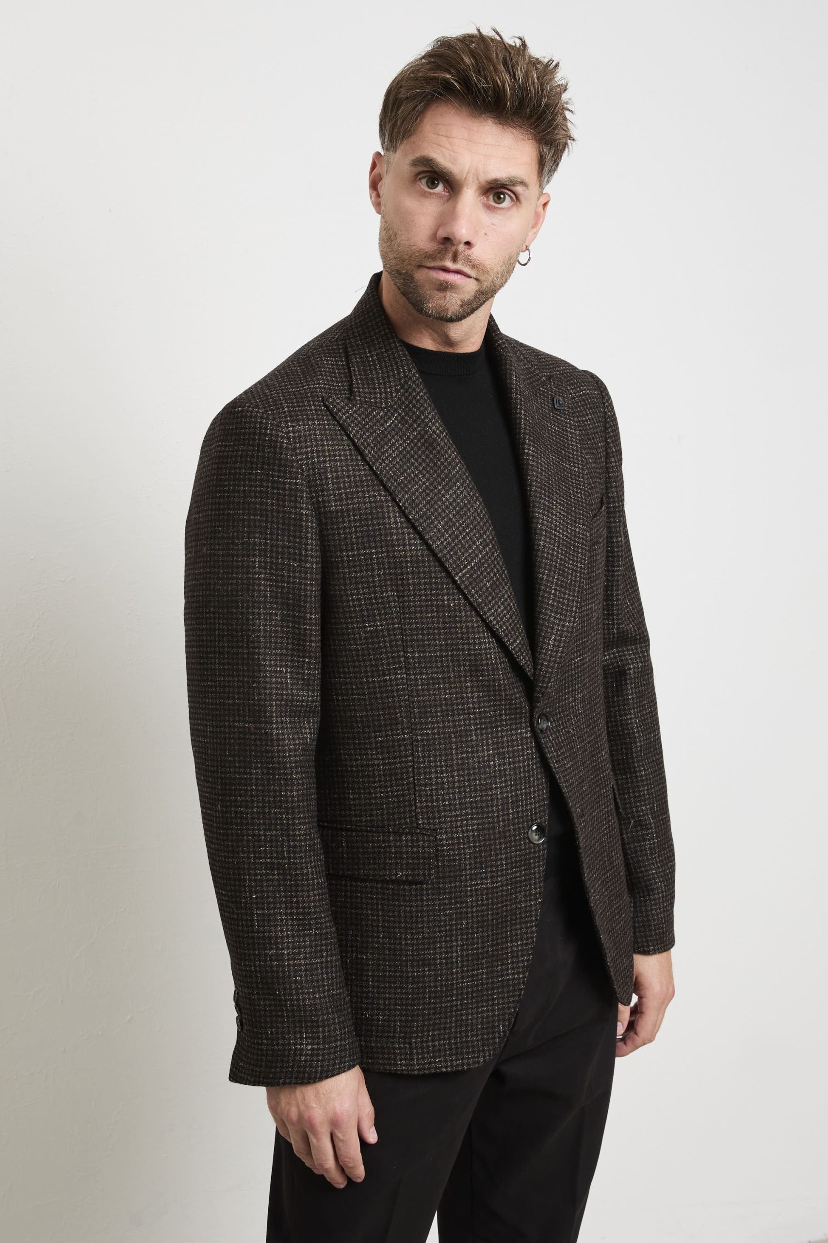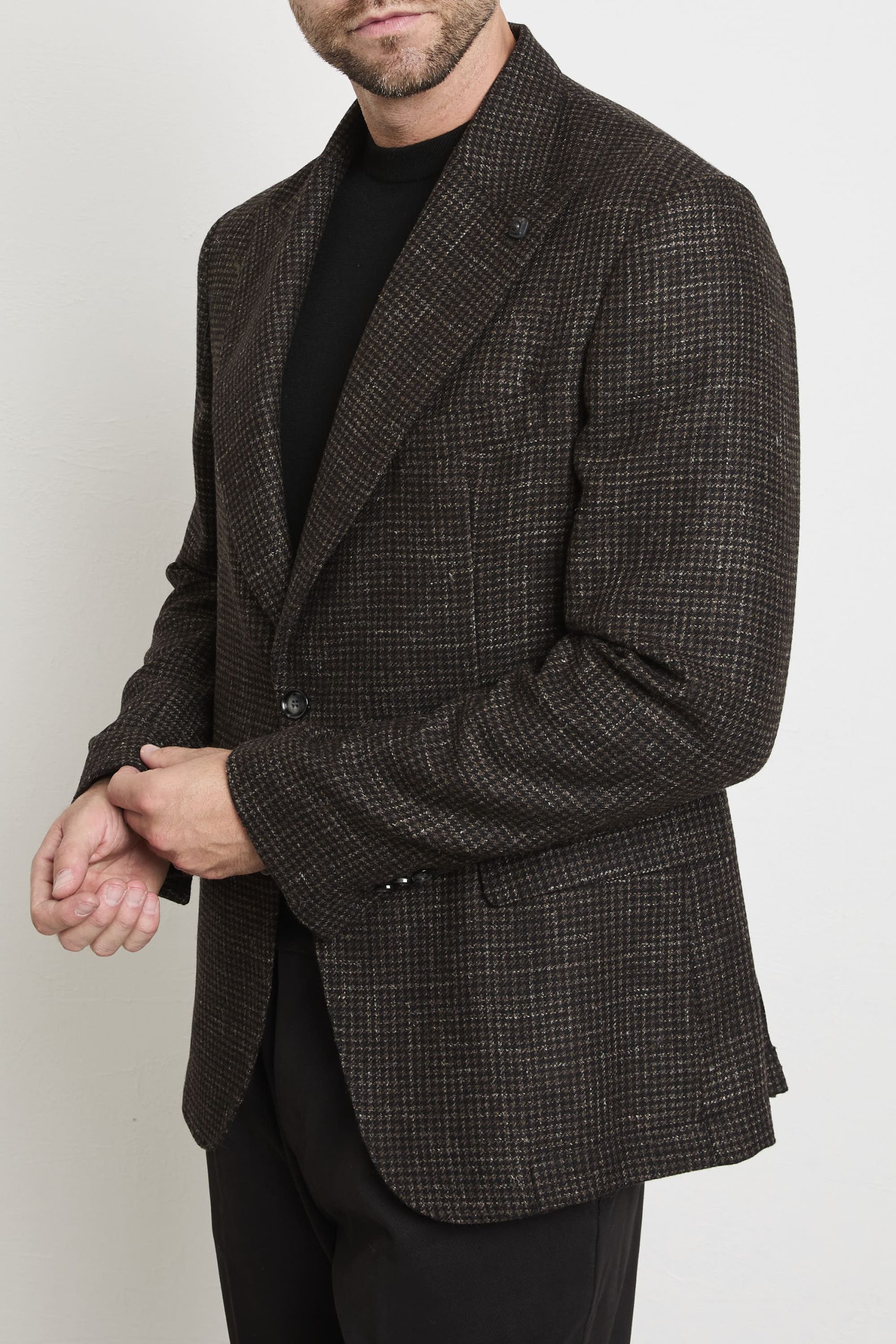 Giacca monopetto in lana con micro motivo pied-de-poule, dal fascino discreto e sofisticato. Il tono marrone con sfumature tabacco e nero la rende estremamente versatile, perfetta per chi ama uno stile raffinato ma quotidiano. Realizzata nelle tonalità marrone, nero e tabacco, viene creato un effetto ottico quasi “micro-check”. È ideale con dolcevita o camicia nera, pantaloni in lana o velluto e stivaletti in cuoio per un look autunnale elegante e deciso.