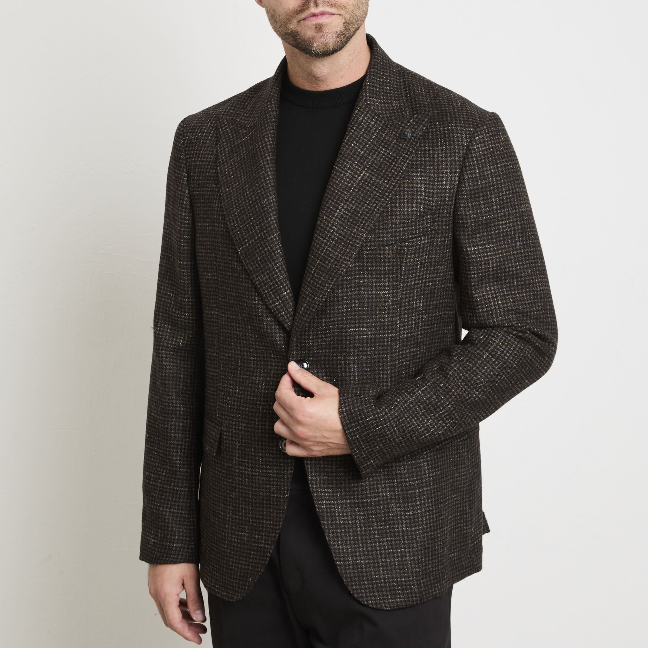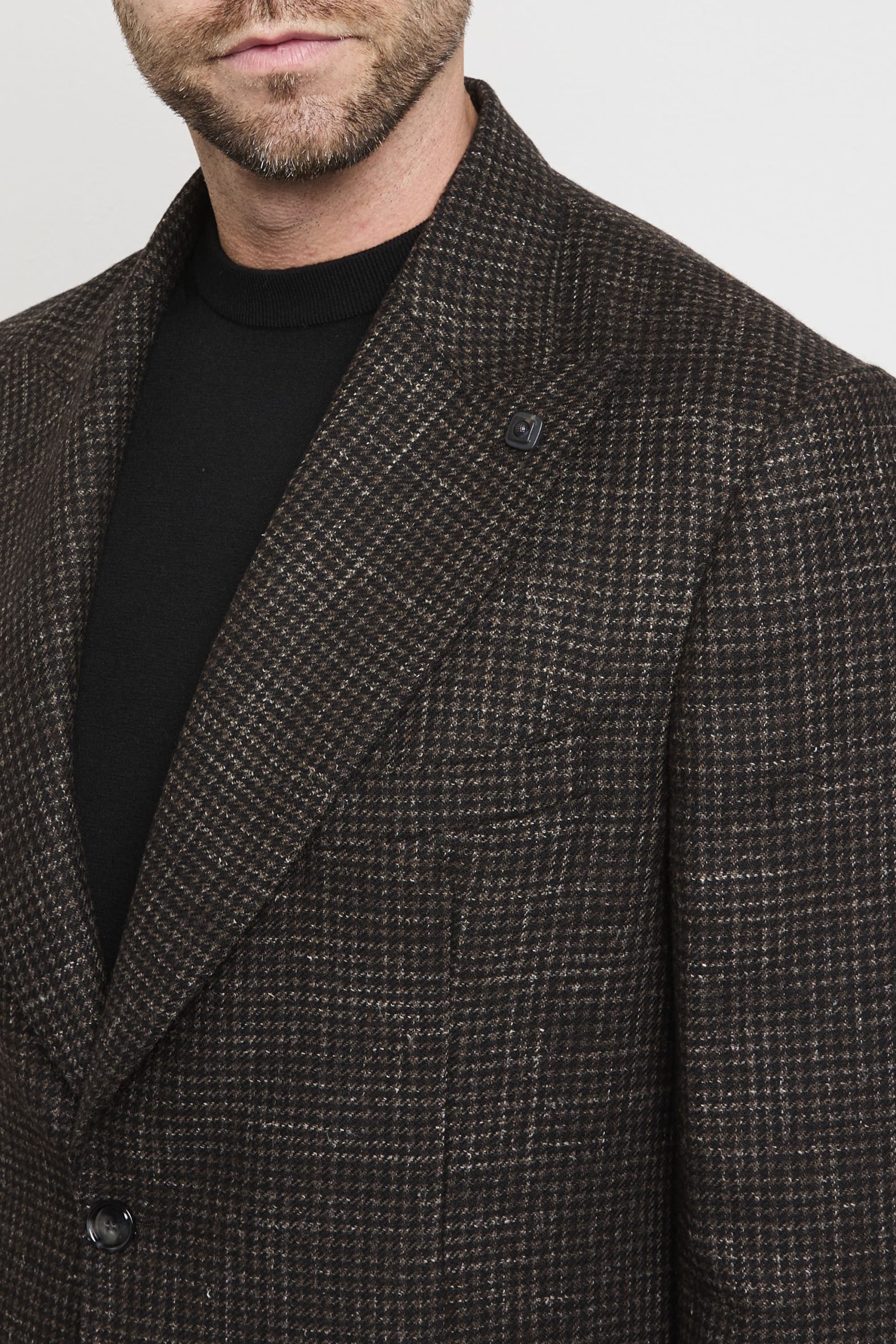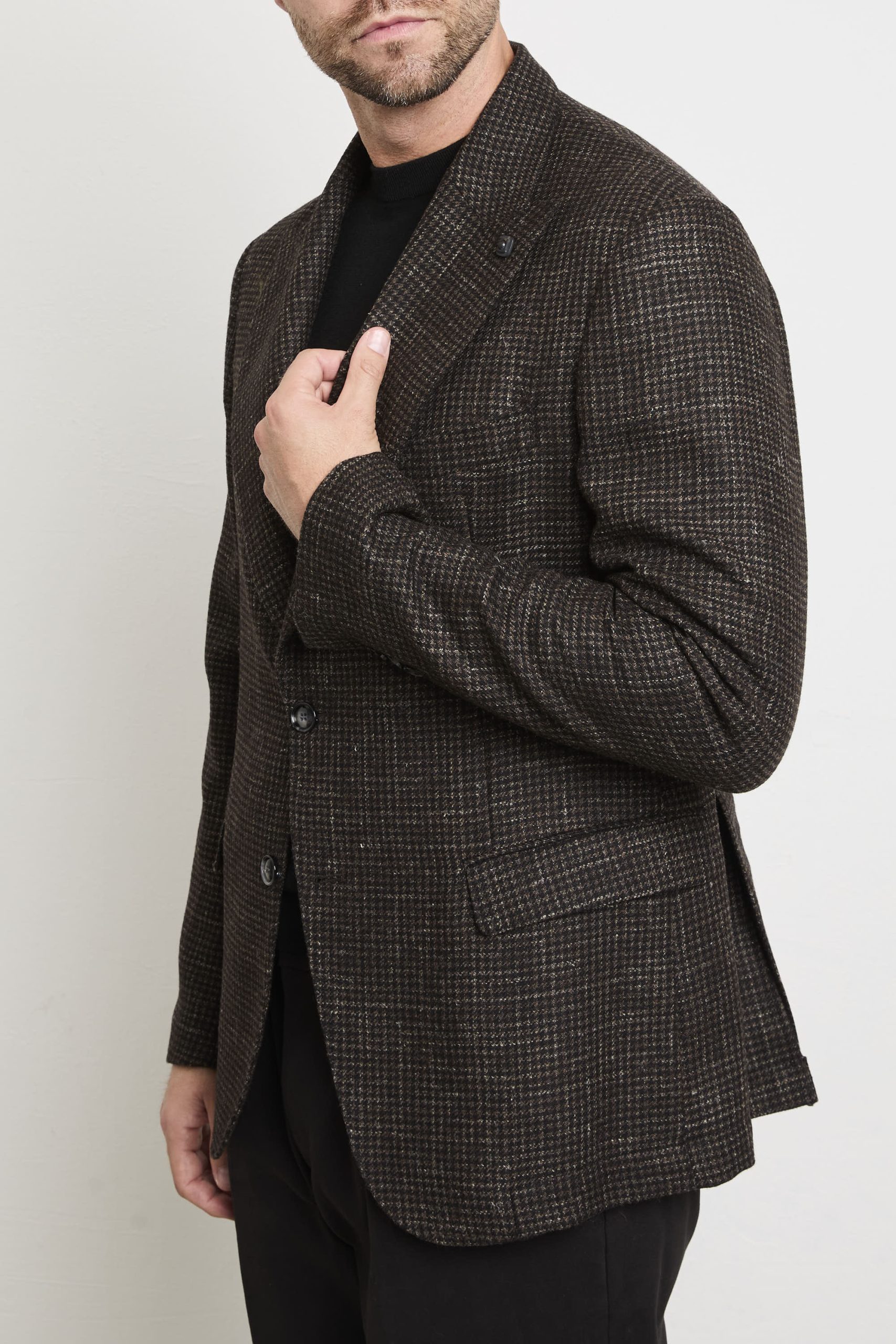 Giacca monopetto in lana con micro motivo pied-de-poule, dal fascino discreto e sofisticato. Il tono marrone con sfumature tabacco e nero la rende estremamente versatile, perfetta per chi ama uno stile raffinato ma quotidiano. Realizzata nelle tonalità marrone, nero e tabacco, viene creato un effetto ottico quasi “micro-check”. È ideale con dolcevita o camicia nera, pantaloni in lana o velluto e stivaletti in cuoio per un look autunnale elegante e deciso.