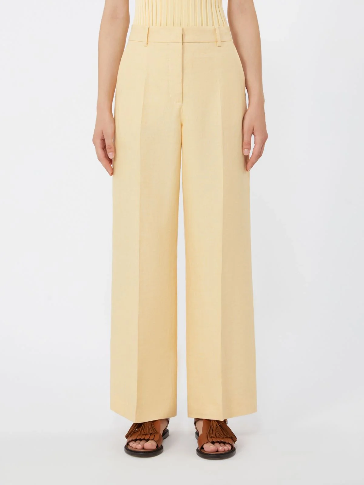 Pantalone wide leg con gamba dritta e piega stirata che definisce il volume.