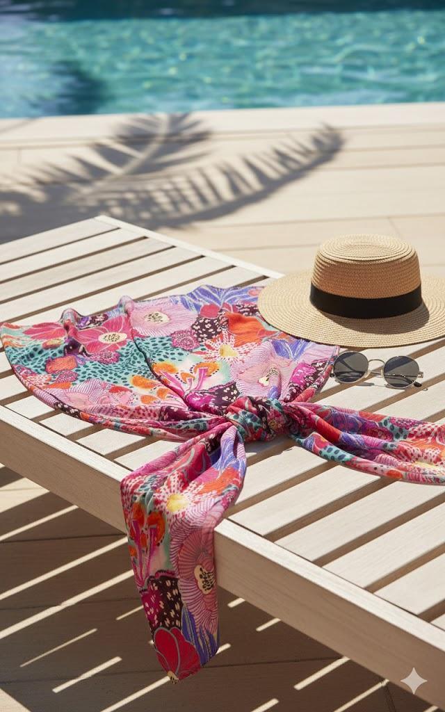 Un pareo leggero e colorato con un raffinato disegno Bali. Perfetto per le giornate estive e per un look elegante in spiaggia.