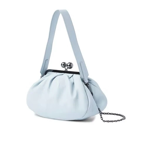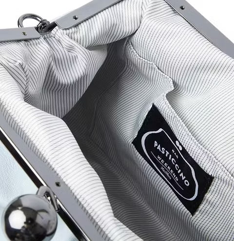 Pasticcino Bag Medium dalla forma destrutturata. Tracolla lunga a catena con spallaccio in pelle e tracolla corta in pelle, entrambe rimovibili con ganci a scomparsa, da portare a mano o crossbody.