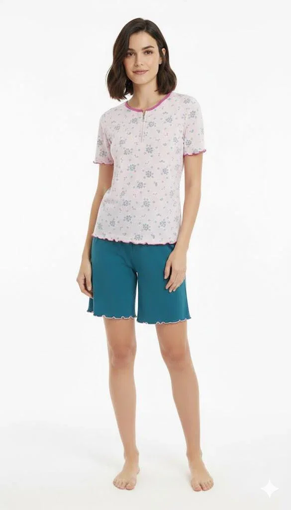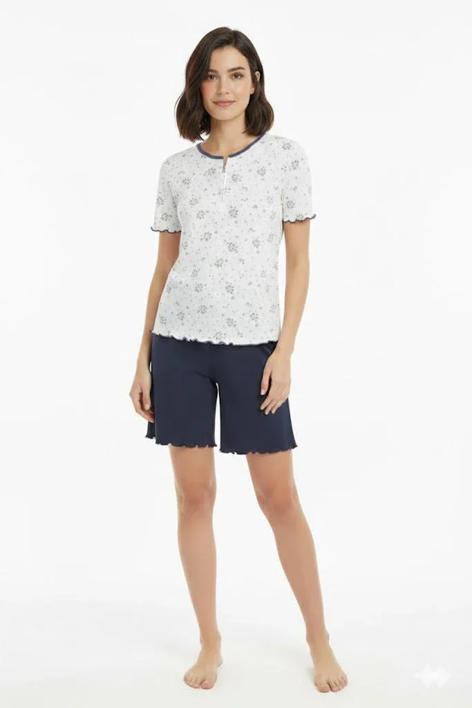 Eleganza e semplicità si incontrano in questo pigiama KiWear. Perfetto per il tuo comfort serale. Questo modello ha manica corta e pantalone al ginocchio.