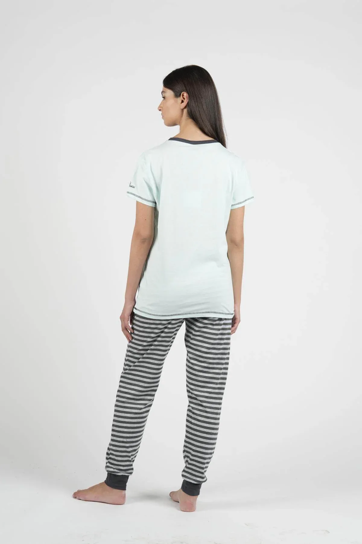 Un pigiama raffinato e avvolgente, ideale per chi cerca il massimo del comfort con un tocco di eleganza. Questo modello ha manica corta e pantalone lungo.