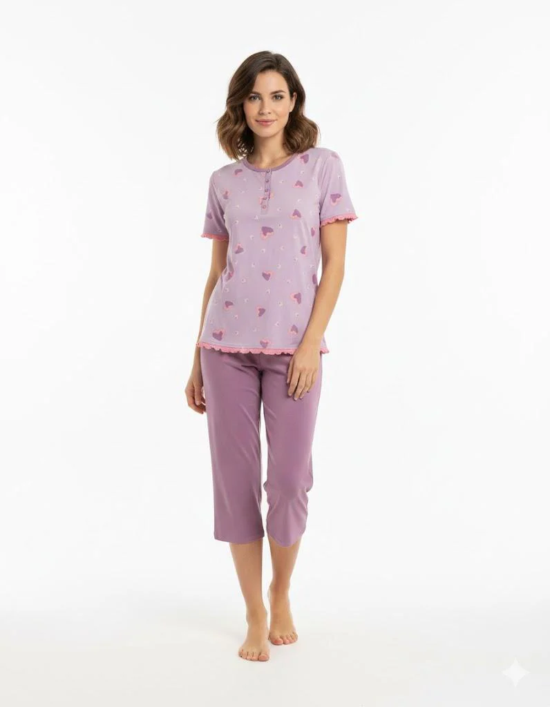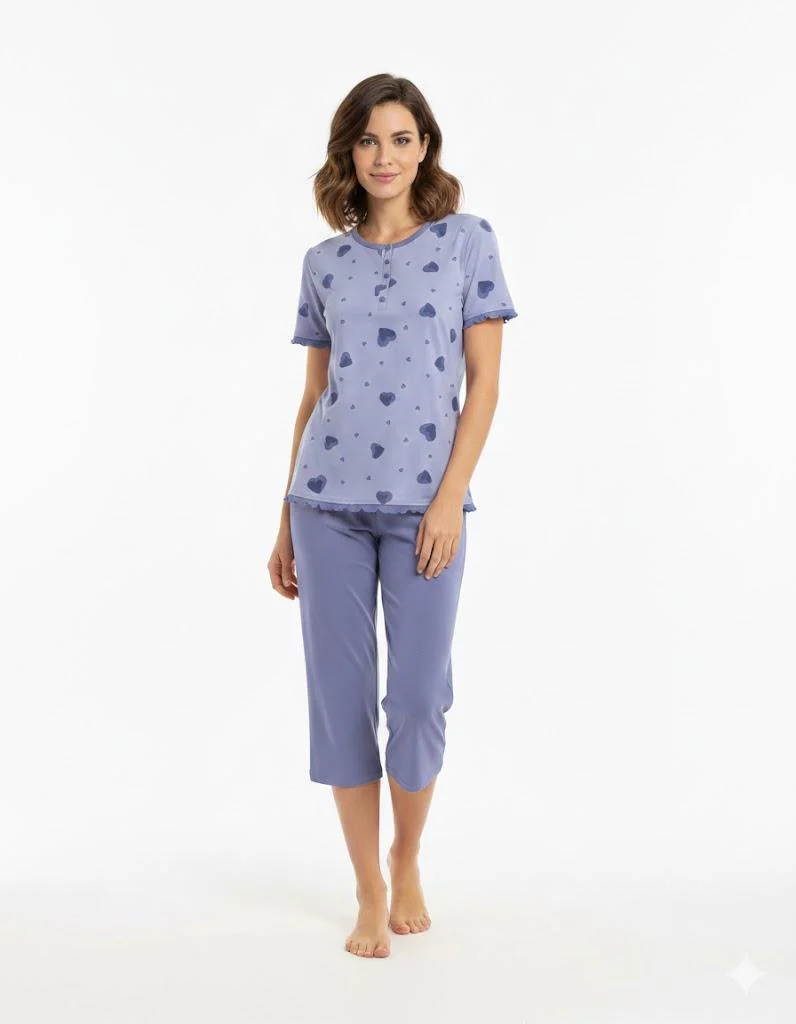 Eleganza e semplicità si incontrano in questo pigiama KiWear. Perfetto per il tuo comfort serale. Questo modello ha manica corta e pantalone pescatore.