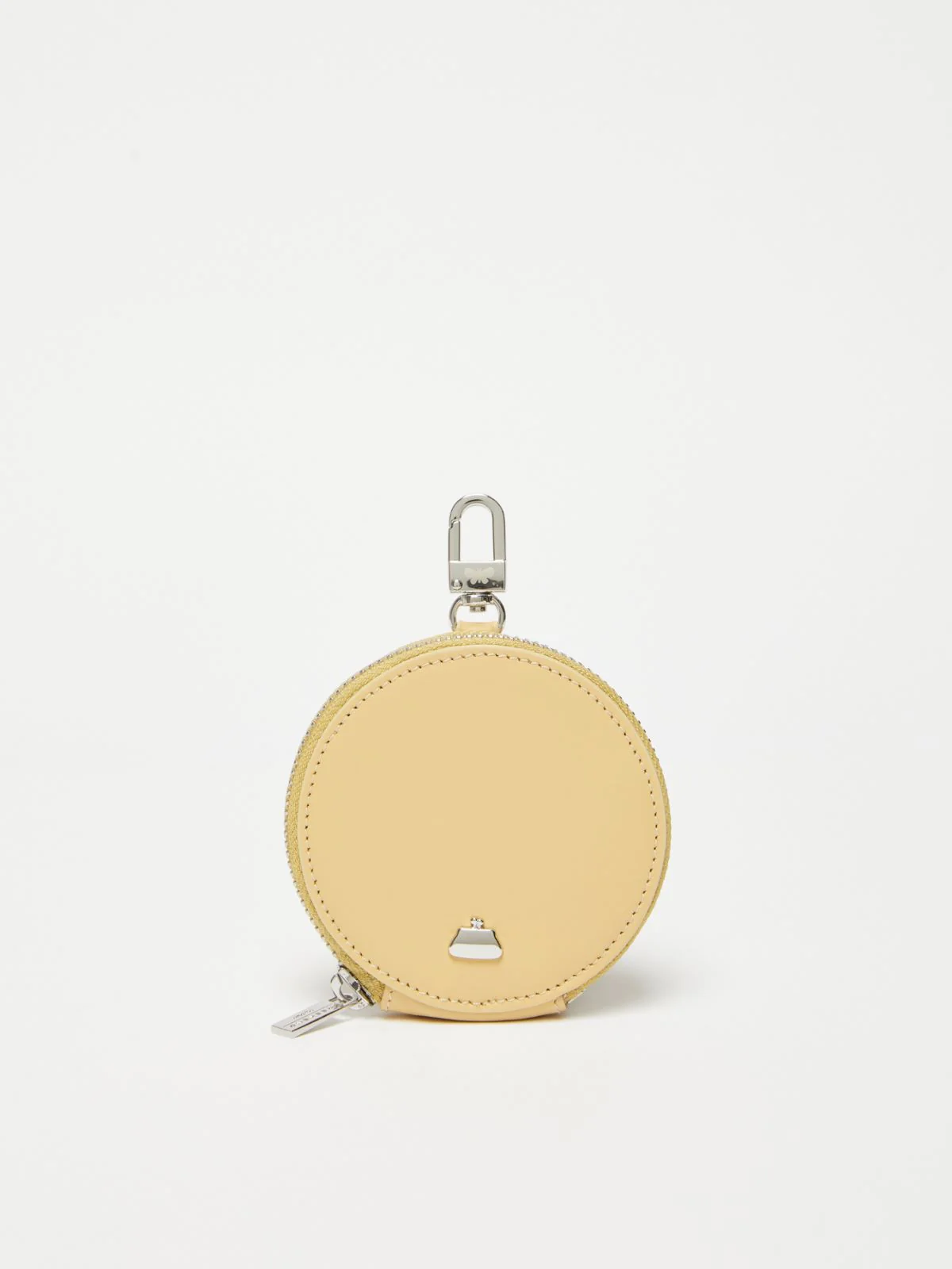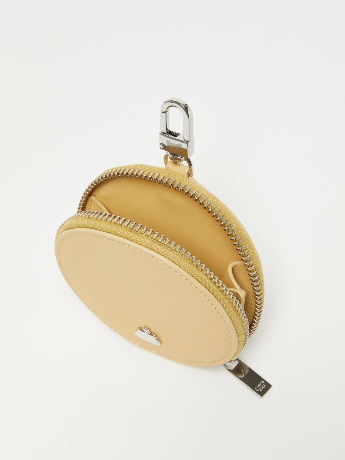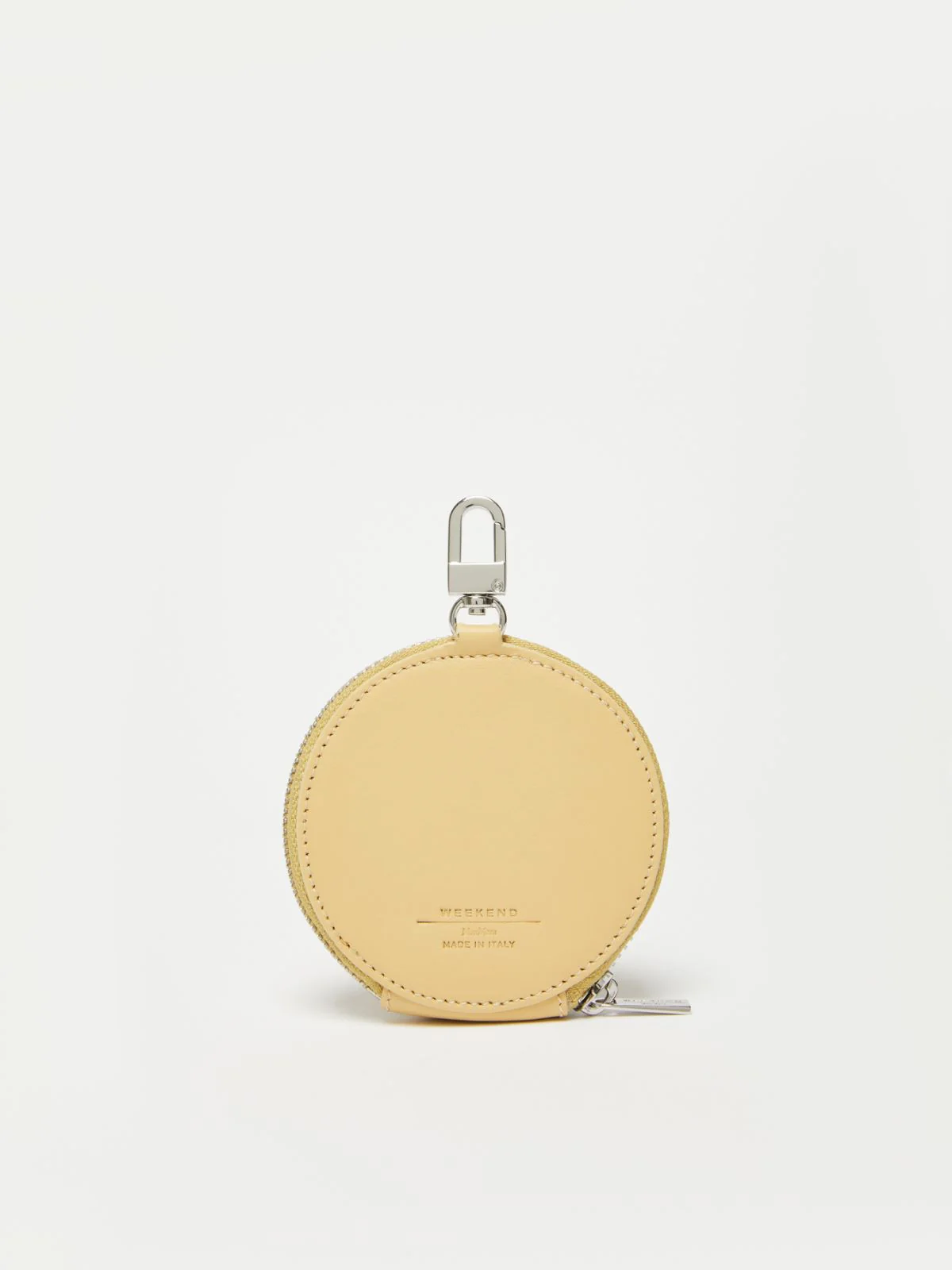 Portamonete in pelle dalla forma tonda, con tasca a soffietto, chiuso con zip around. Personalizzato con dettaglio Pasticcino Bag in metallo da un lato e lettering Weekend Max Mara dall’altro. Dotato di piccolo moschettone in metallo, per essere agganciato alle borse Weekend Max Mara.