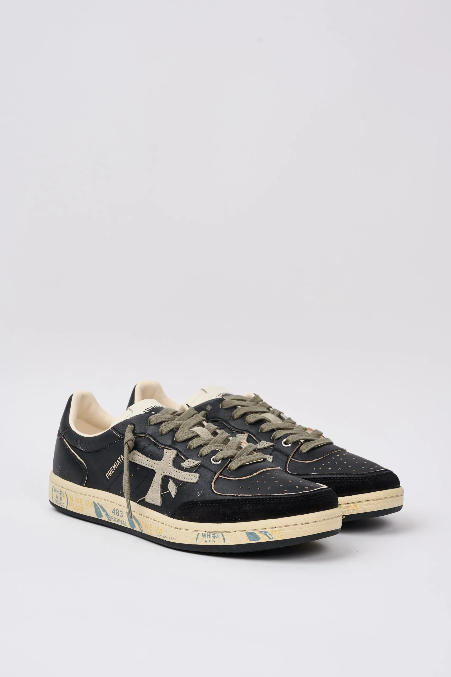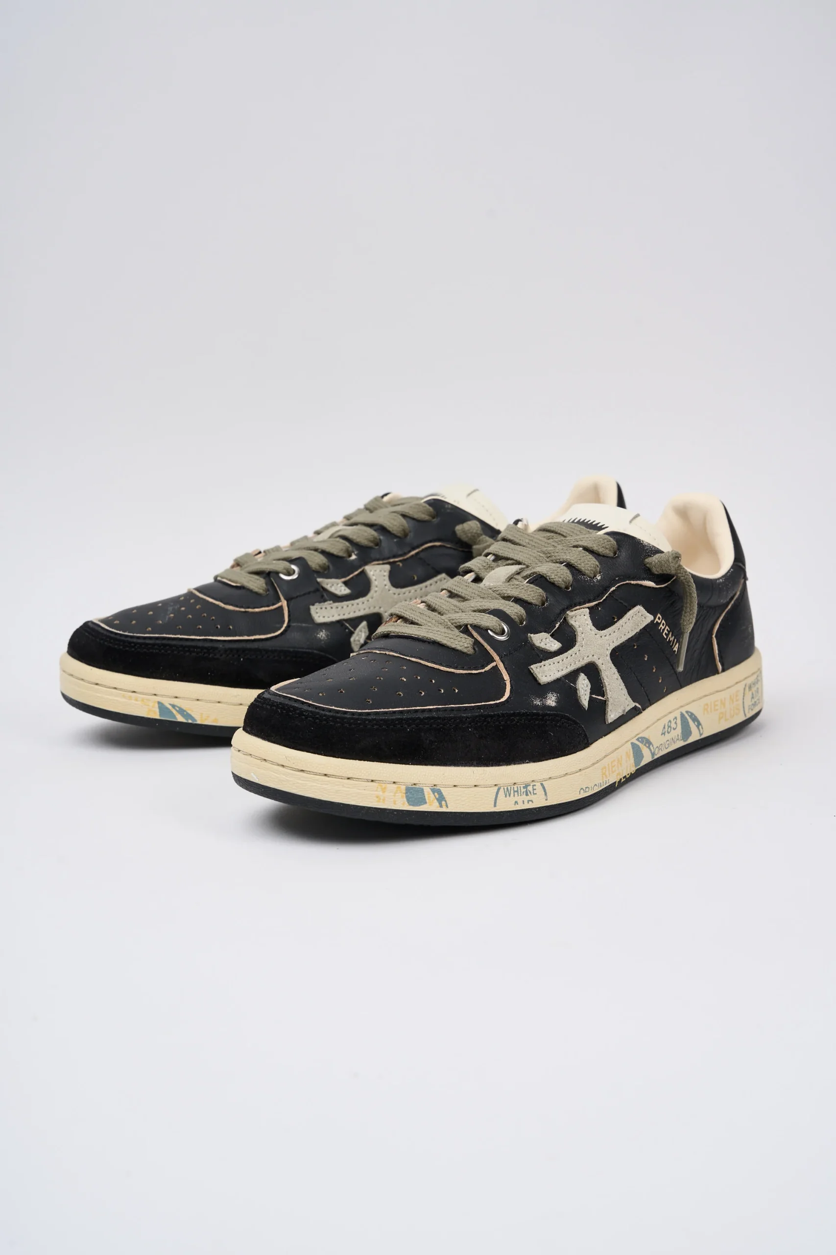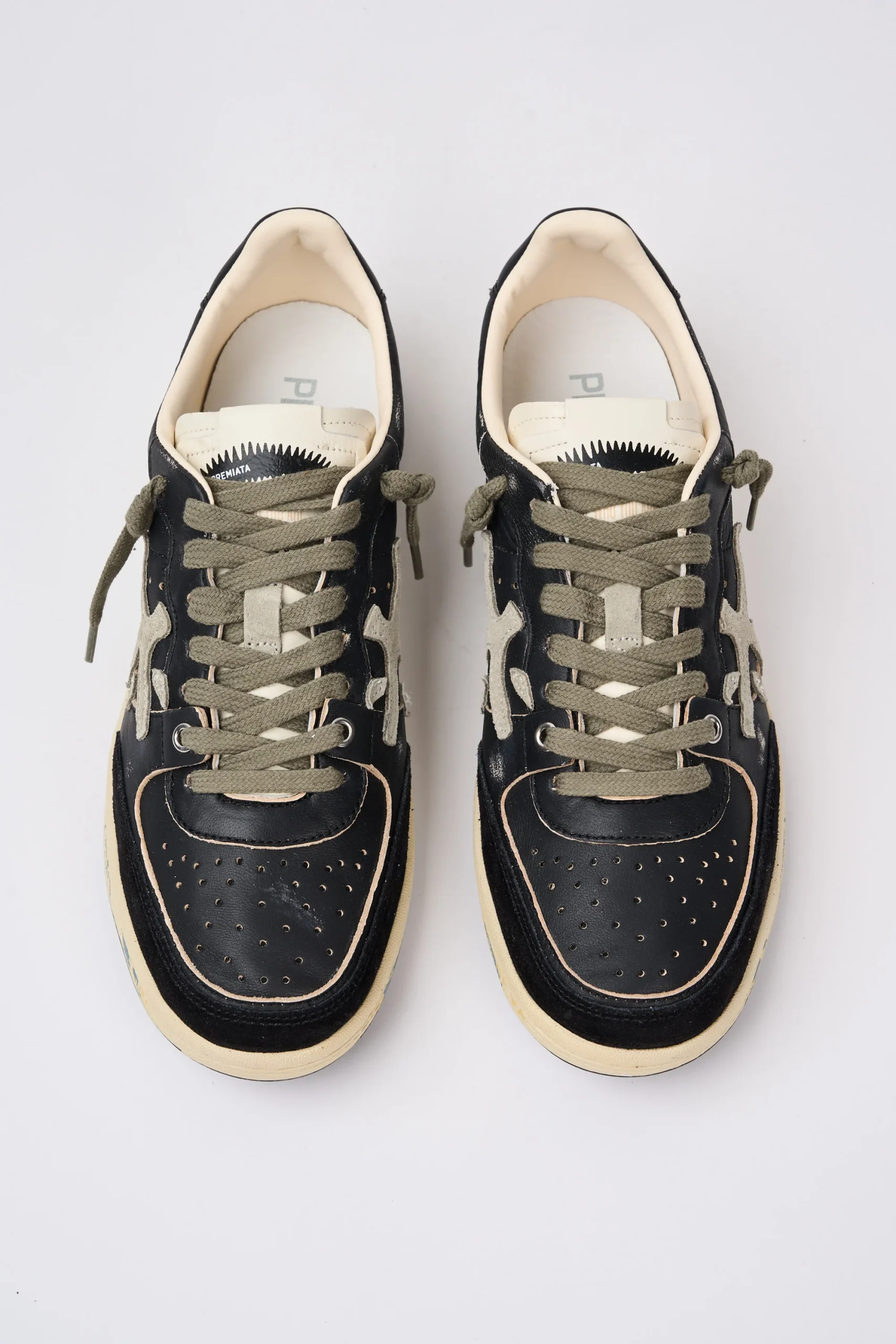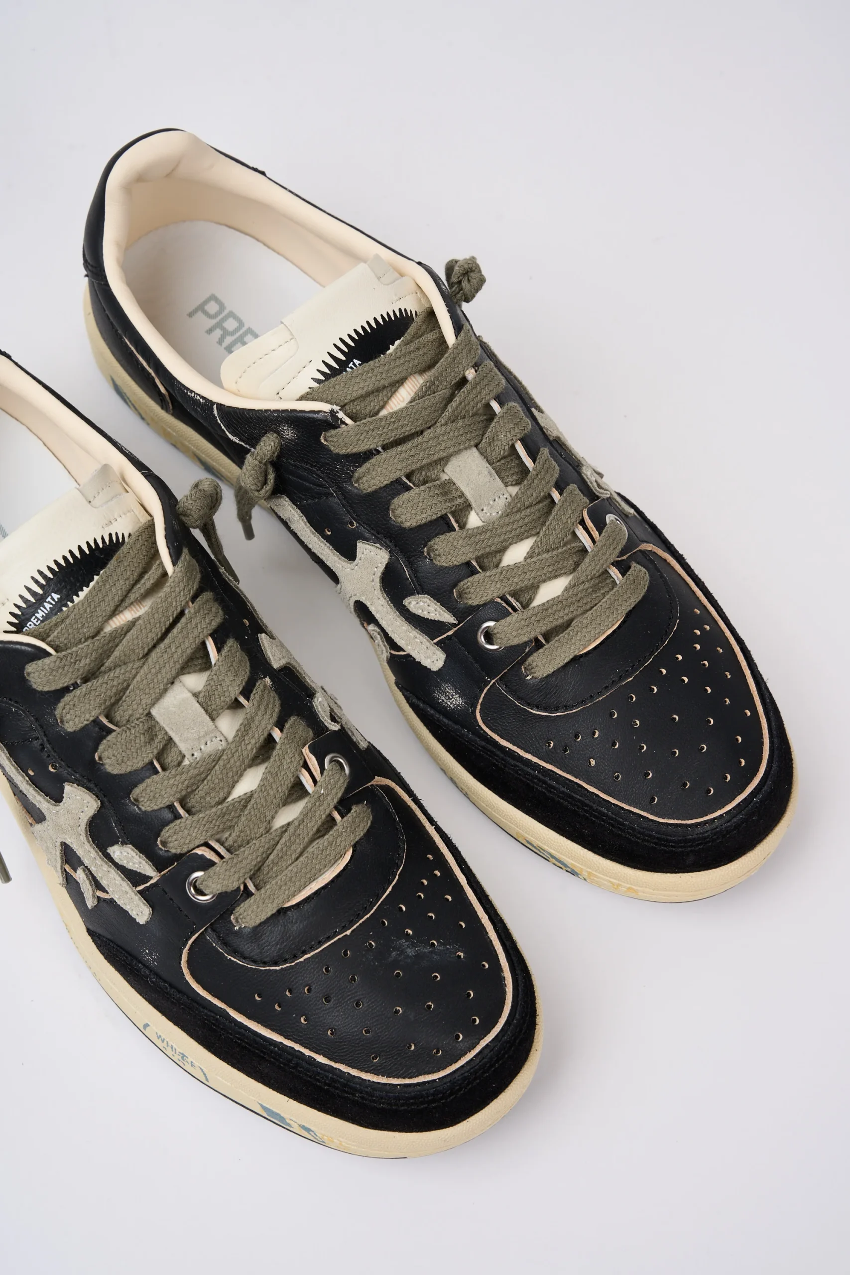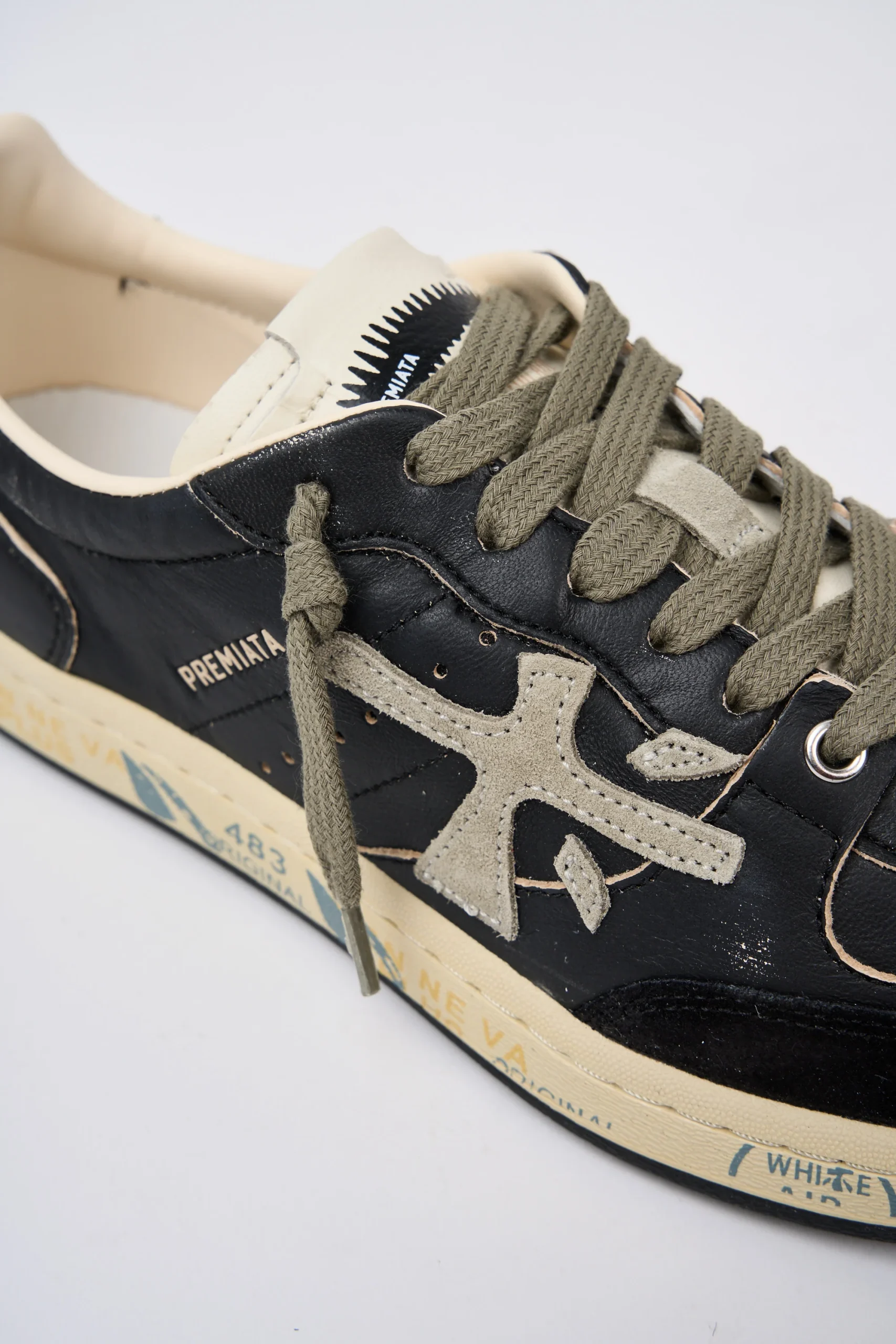 Dettagli: Modello basso; Tomaia in pelle e suede morbida e invecchiata; Lacci in cotone verdi; Punta tonda; Suola piatta in gomma; Linguetta panna con logo stampato; Talloncino è in pelle nero con il logo stampato in contrasto; Sul fondo sono presenti la classica scritta nome del brand; Soletta in pelle ergonomica ed estraibile con logo; Logo grande grigio in contrasto; Altezza tallone dal suolo: 2,5 cm; Var: 6909