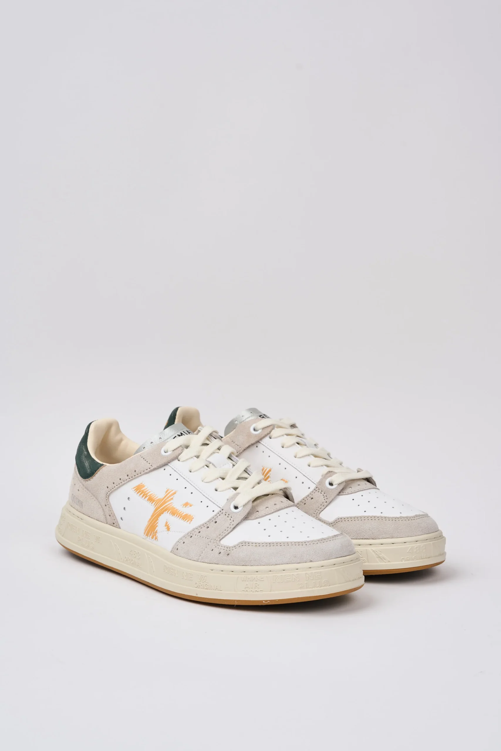 Dettagli: Tomaia in mix di materiali di alta qualità; Pelle e suede morbida; Talloncino è in pelle verde con il logo stampato in contrasto; Linguetta con logo stampato; Soletta in pelle ergonomica ed estraibile con logo; Punta tonda; Chiusura frontale con lacci; Suola piatta in gomma; Logo grande arancione di lato tono su tono; Modello basso; Altezza tallone dal suolo: 3 cm; Var: 6968
