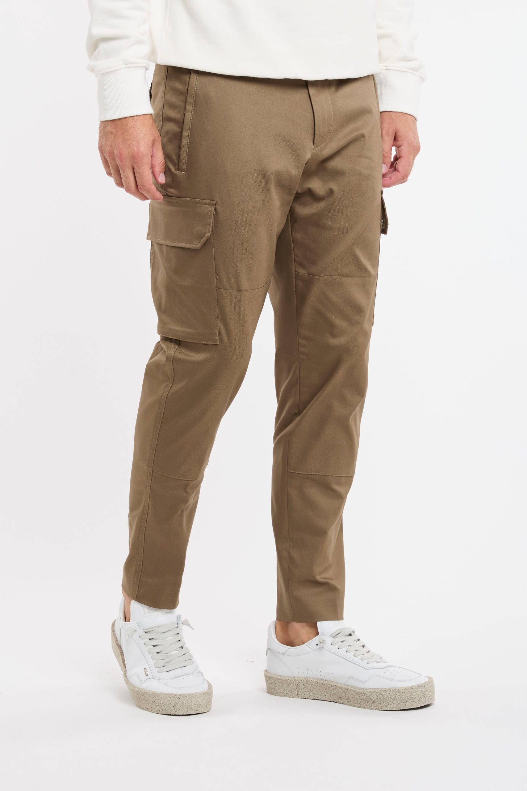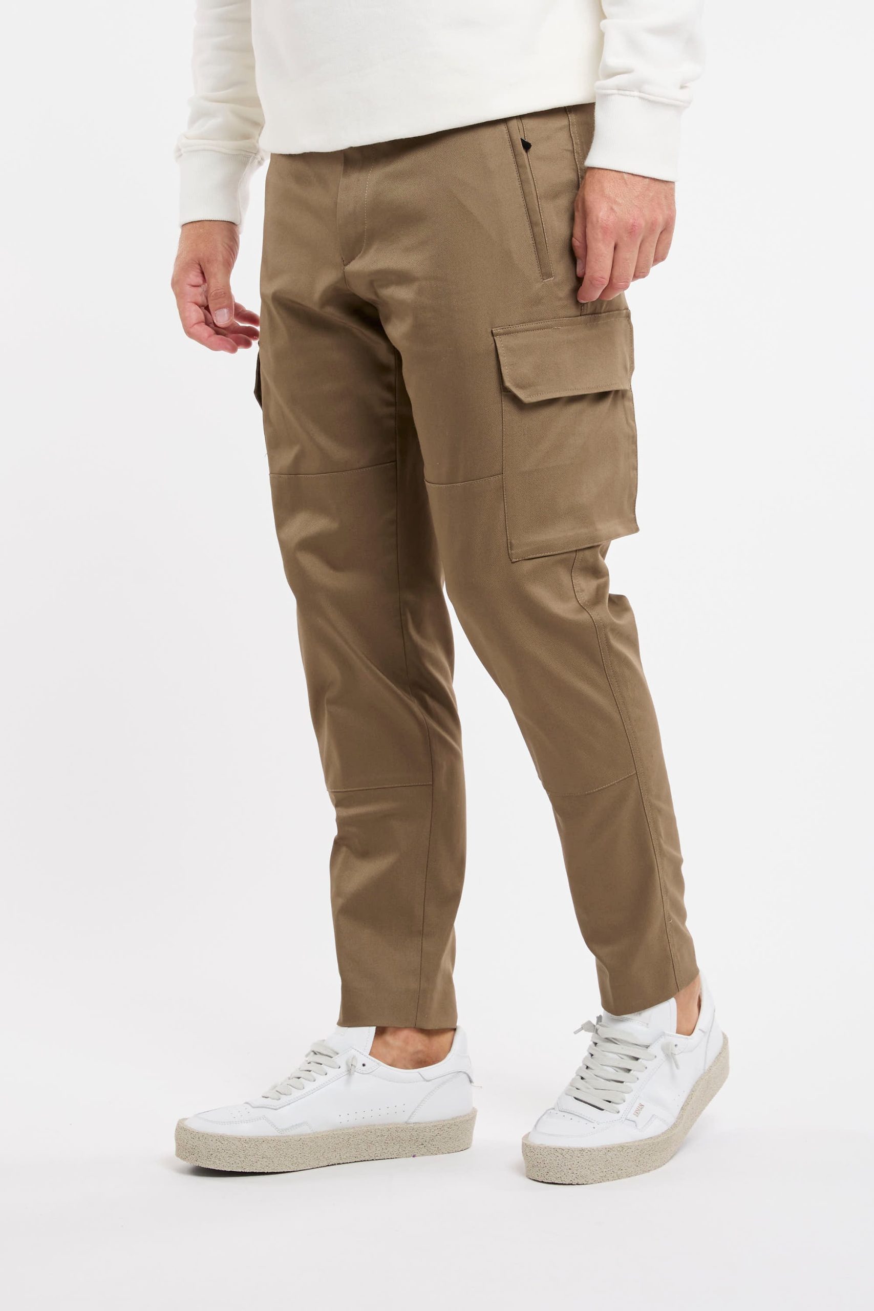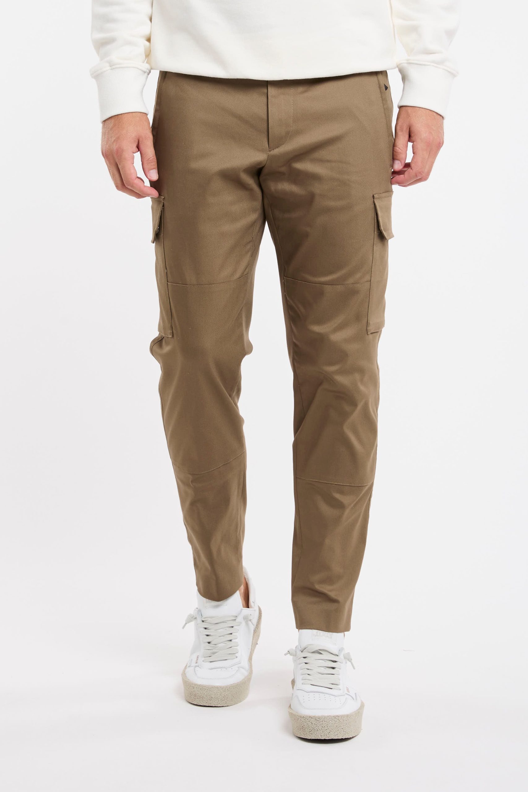 Pantalone tasconato in misto cotone; Tessuto stretch techno; Chiusura con zip e gancio metallico; Passanti per la cintura; Doppia tasca a filo co la zip e tasche posteriori con patta e bottoni automatici; Gamba dritta che si ristringe in fondo; Lunghezza alla caviglia; Logo in evidenza; Composizione: 60% Cotone, 36% Poliammidica, 4% Elastan; Larghezza fondo: 16,5 cm
