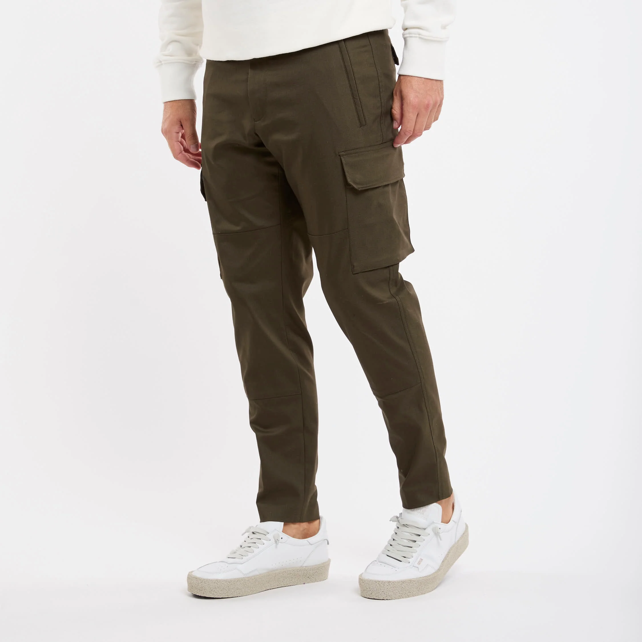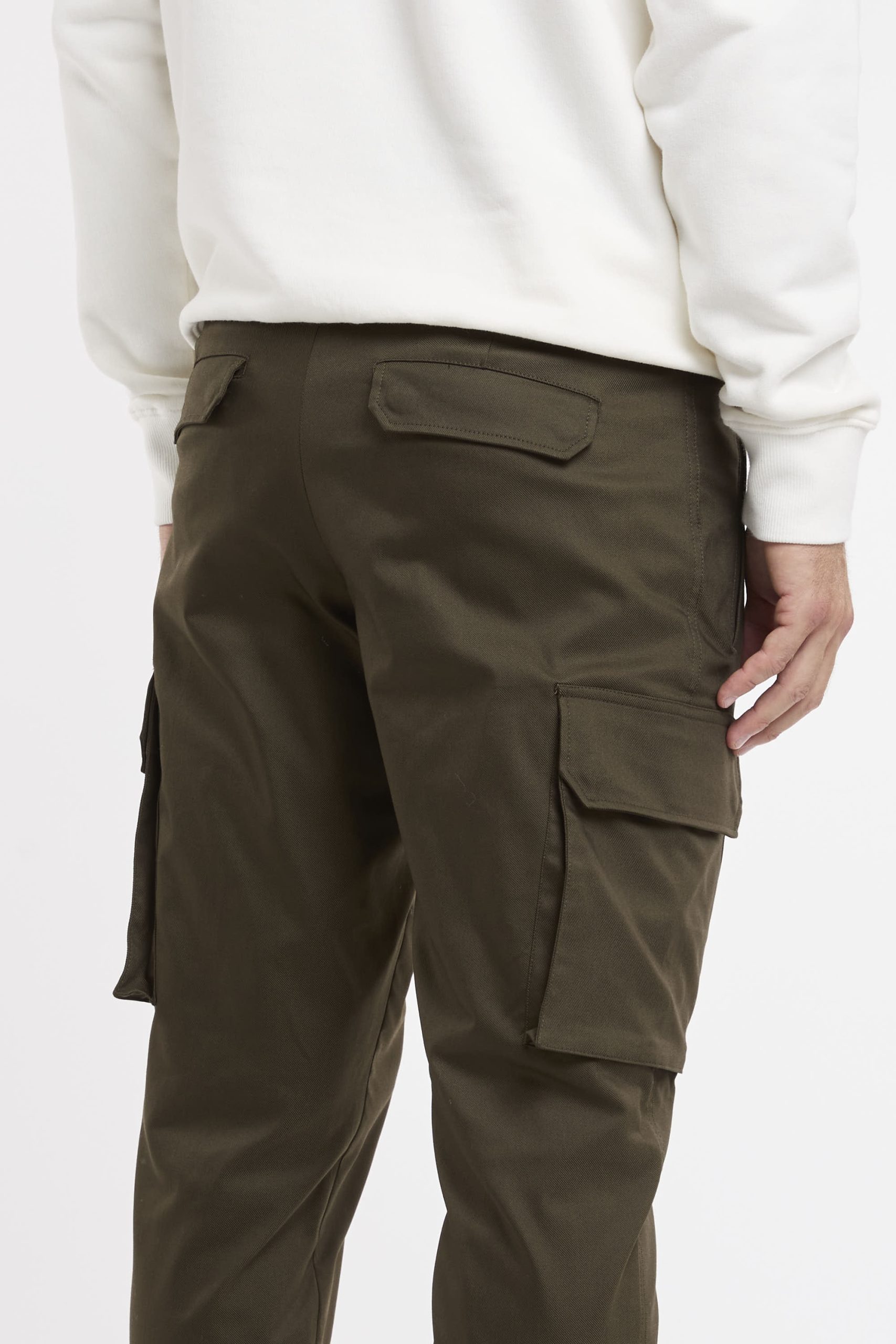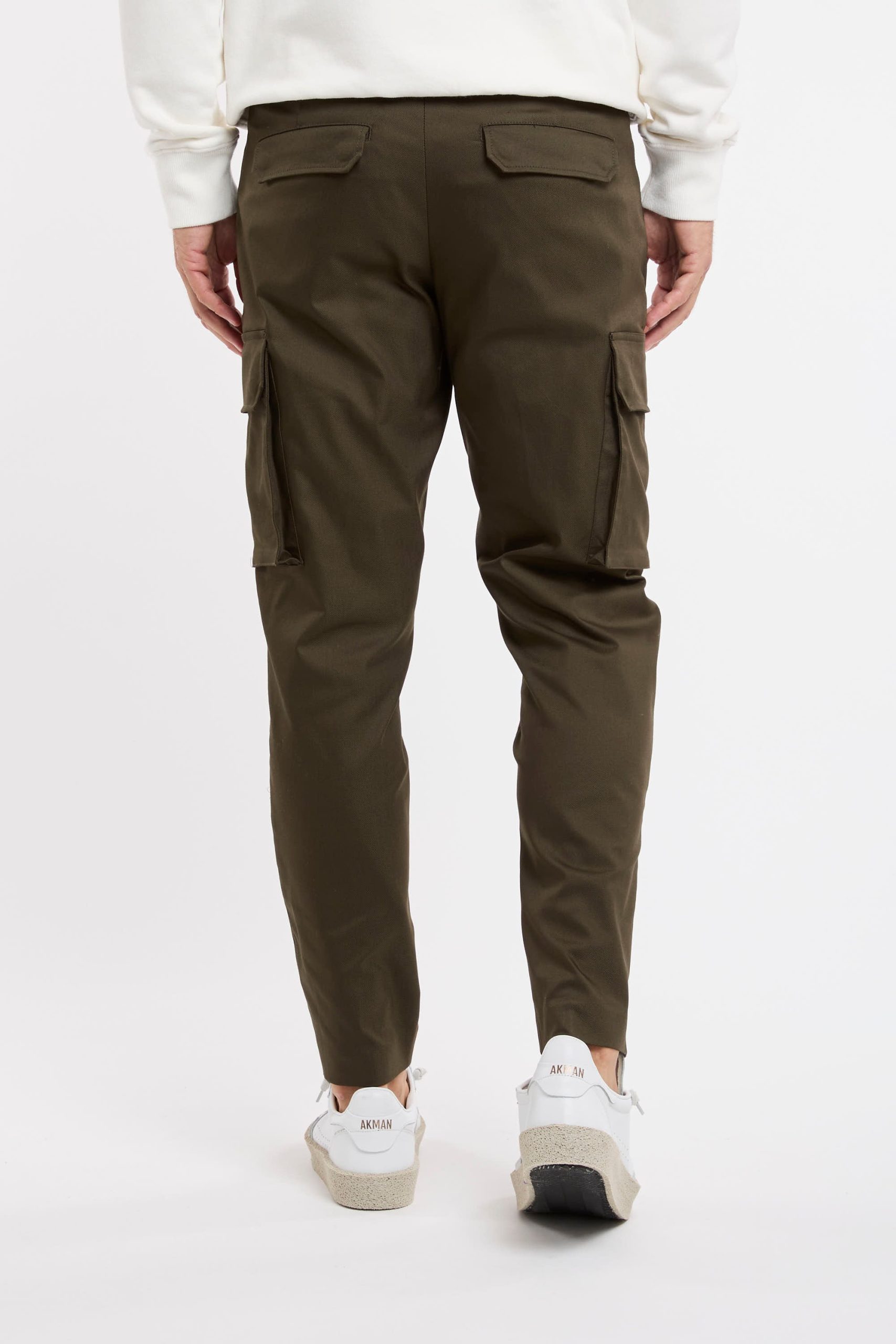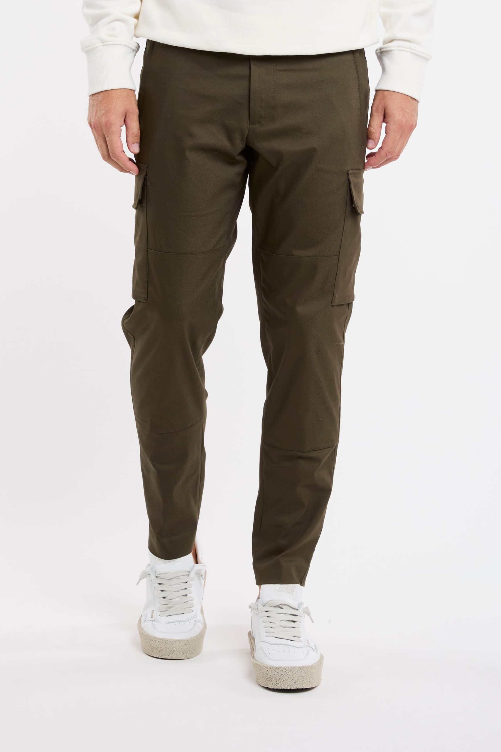 Pantalone tasconato in misto cotone; Tessuto stretch techno; Chiusura con zip e gancio metallico; Passanti per la cintura; Doppia tasca a filo co la zip e tasche posteriori con patta e bottoni automatici; Gamba dritta che si ristringe in fondo; Lunghezza alla caviglia; Logo in evidenza; Composizione: 60% Cotone, 36% Poliammidica, 4% Elastan; Larghezza fondo: 16,5 cm