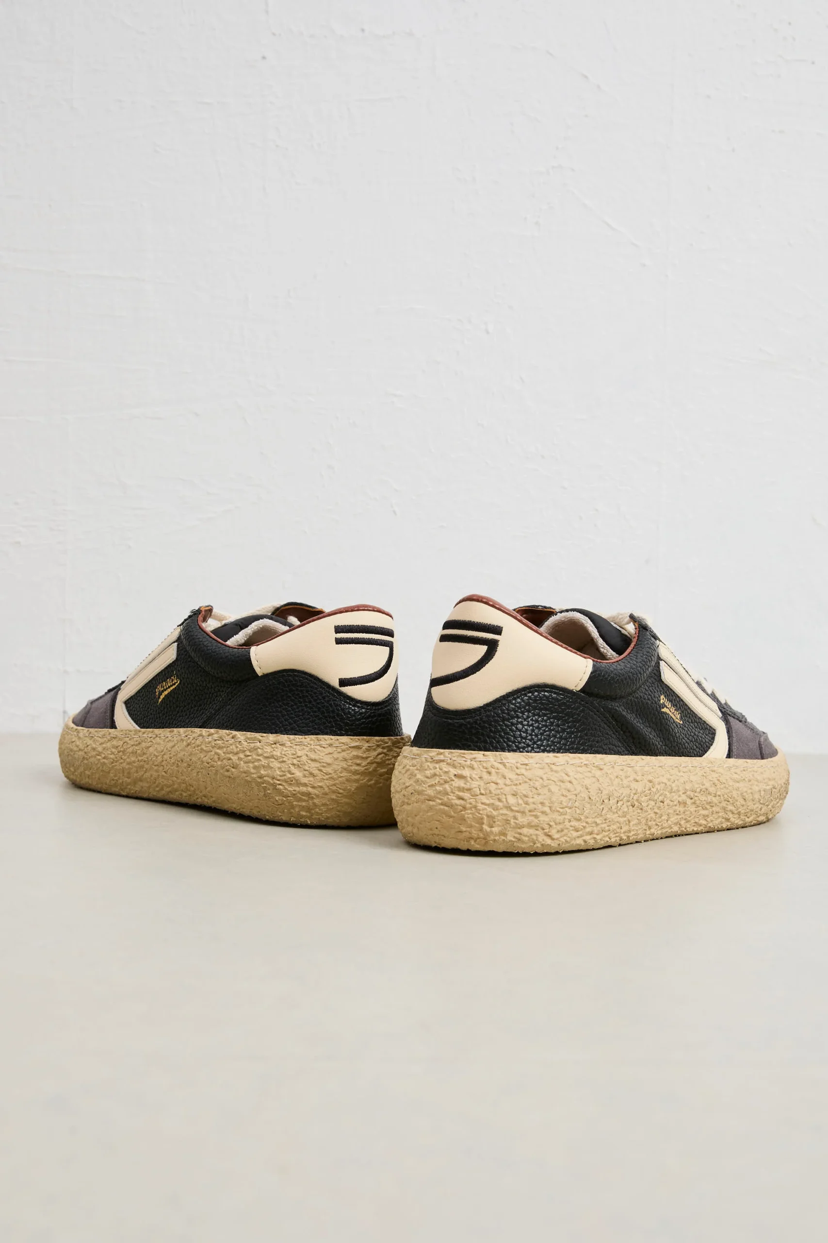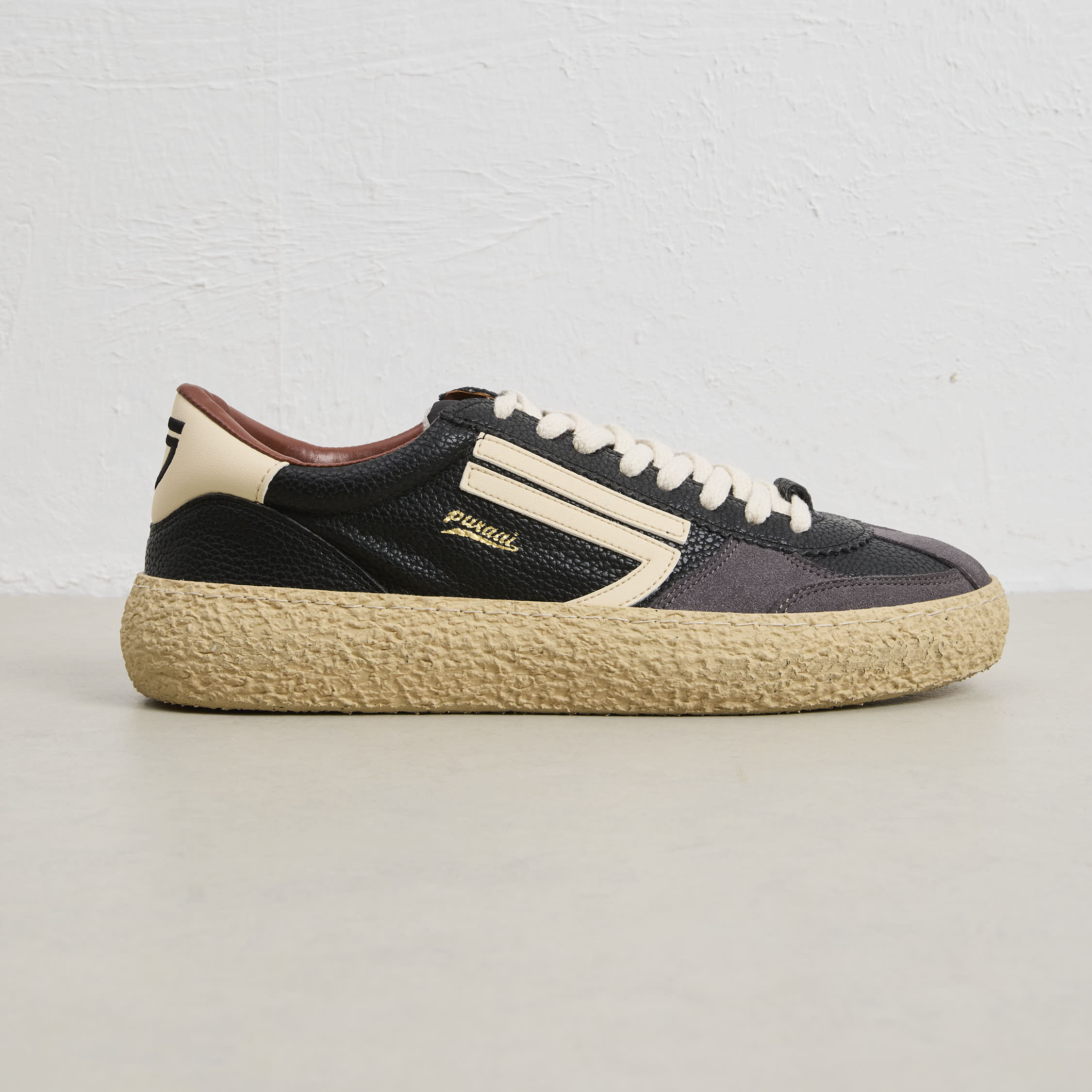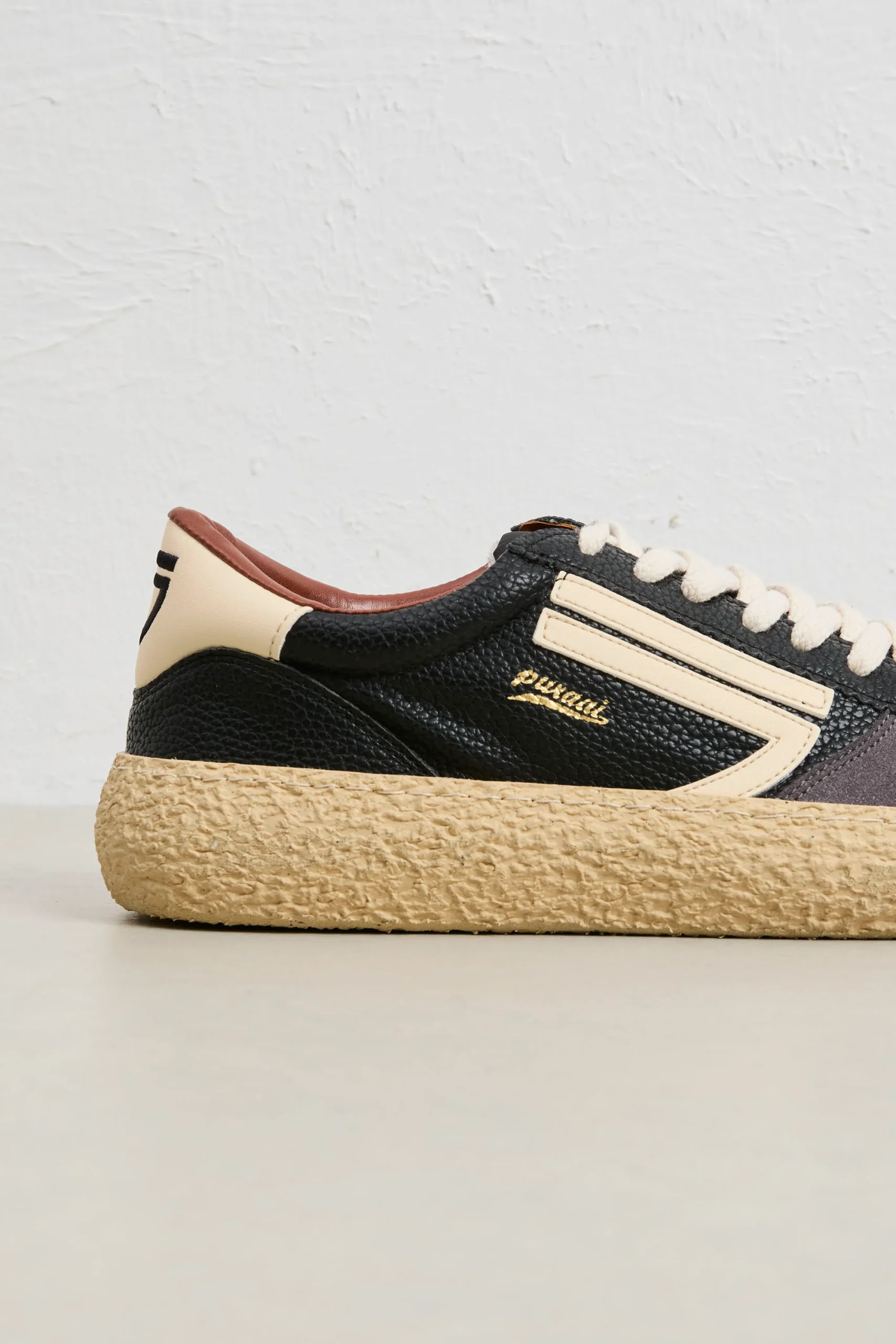 Questa Puraai esprime il perfetto equilibrio tra heritage sportivo e artigianalità contemporanea. Realizzata con materiali vegani e riciclati, unisce comfort e rispetto per l’ambiente, mantenendo un’estetica rétro dal fascino intramontabile. Il mix tra nero, beige e suola naturale la rende versatile: ideale con jeans scuro e maglione minimal, oppure con pantaloni cropped e giacca leggera per un tocco sofisticato.