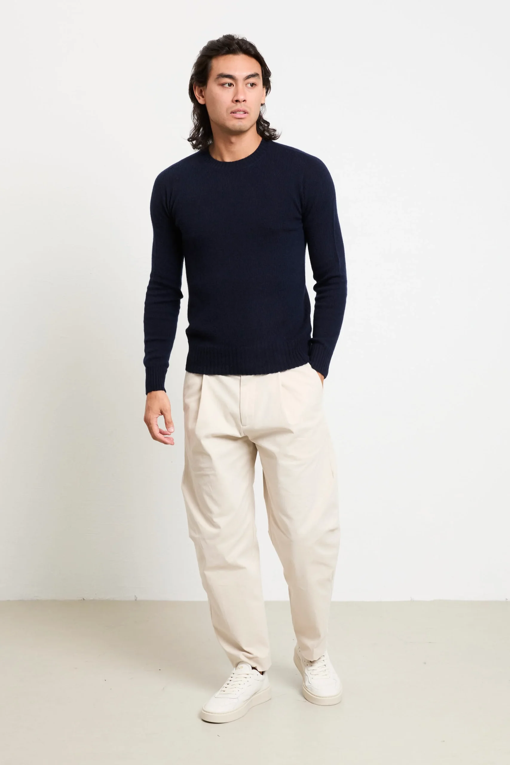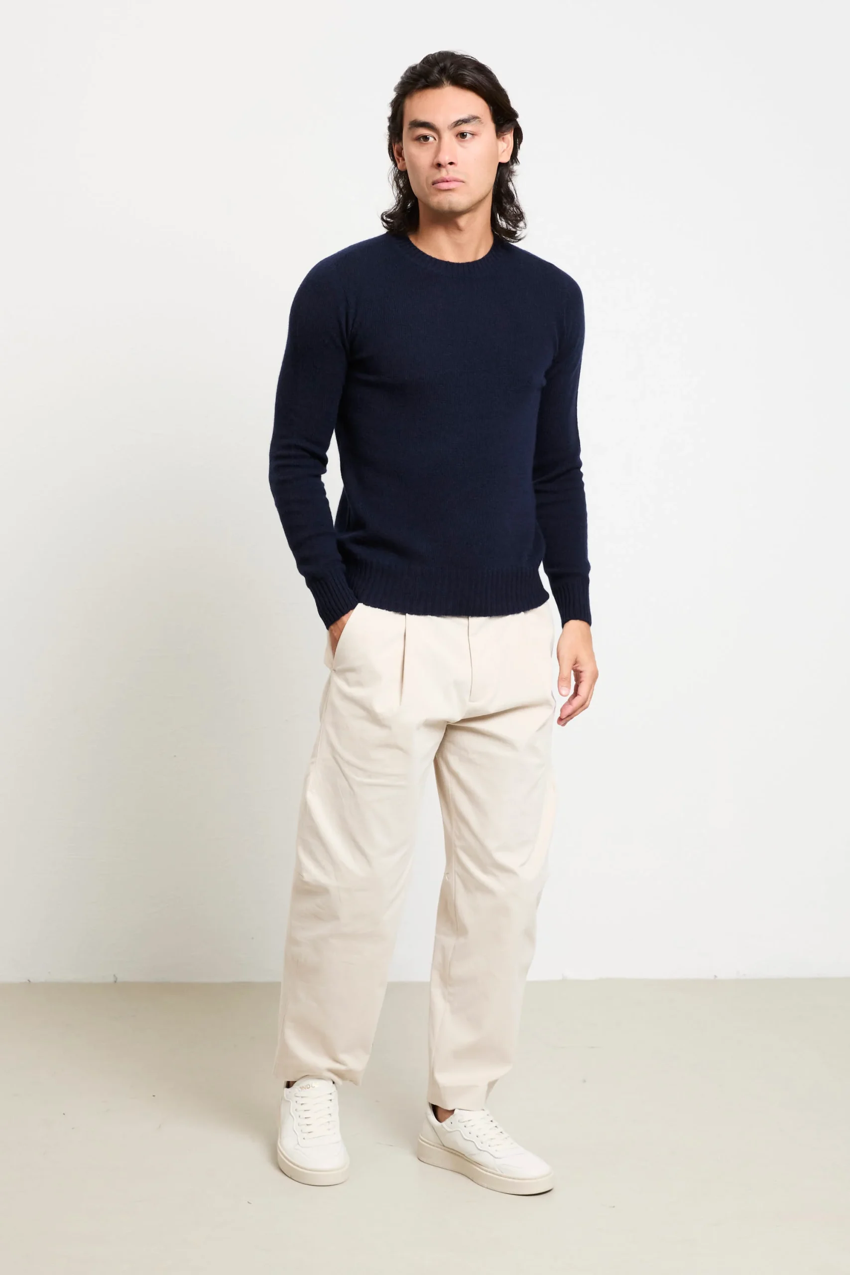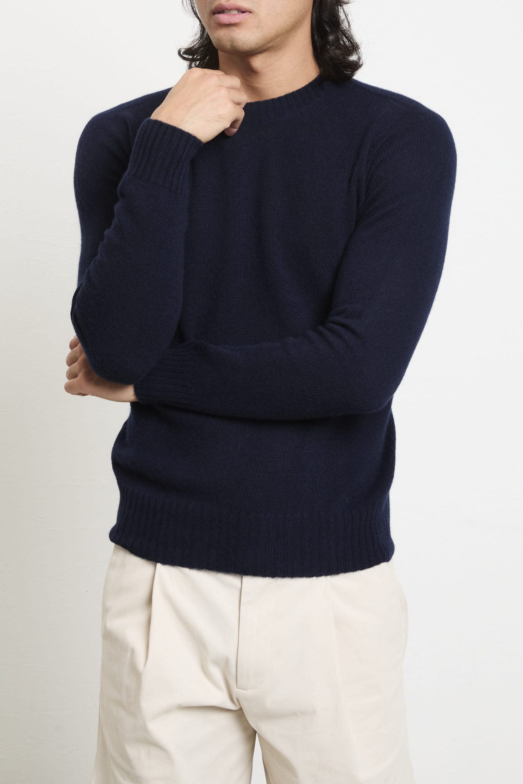 La maglia in puro cashmere di Retois sprigiona un’eleganza senza tempo grazie alla texture raffinata e alla tonalità blu notte, perfetta con pantaloni avorio e sneakers bianche oppure abbinata a un soprabito cammello per un contrasto deciso e sofisticato. Ideale sotto una giacca sartoriale o da sola in outfit informali ma curati.