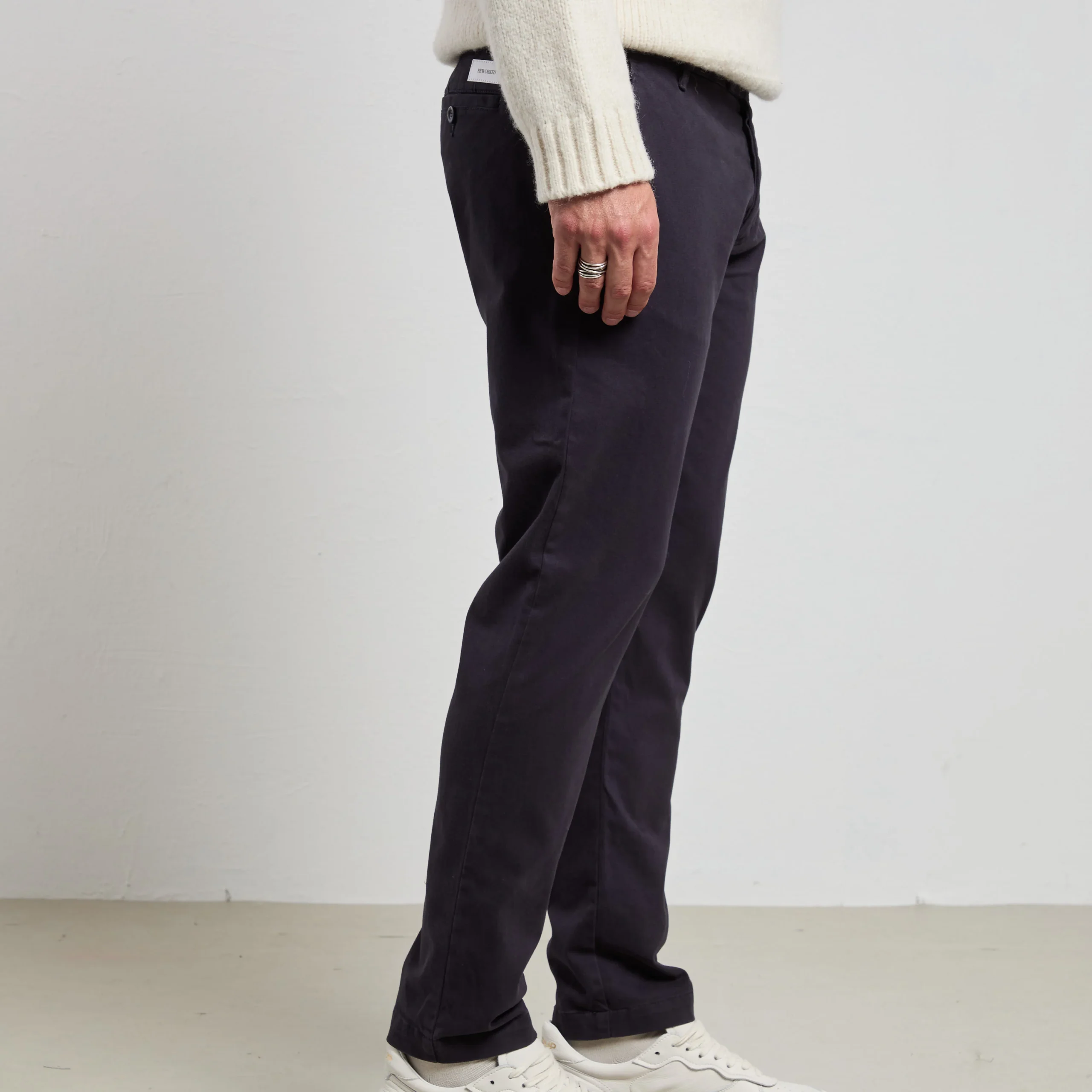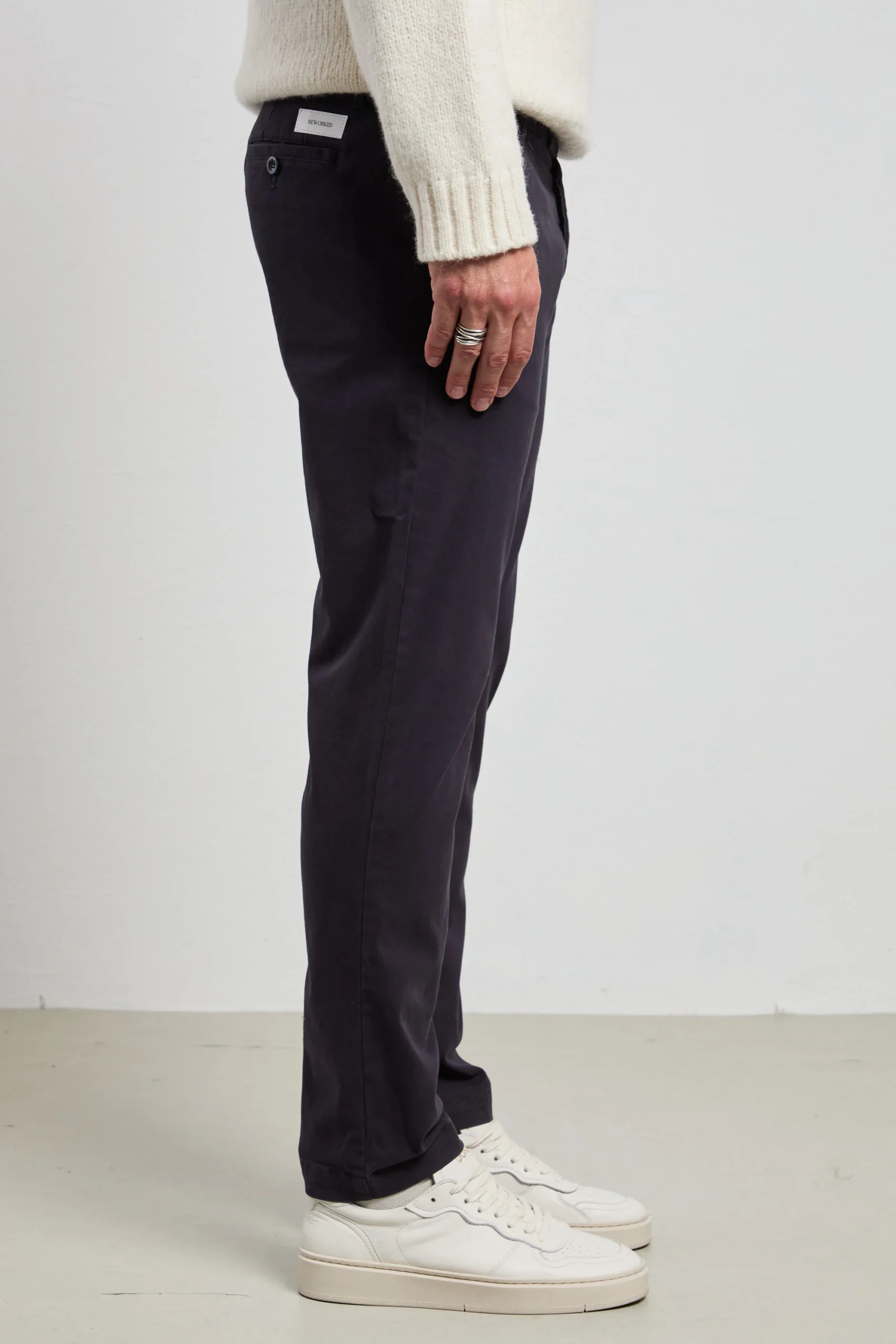 Chino blu navy in cotone dalla linea essenziale e raffinata. La tela medio-peso con un tocco di elastane assicura resistenza e comfort quotidiano, perfetti con t-shirt bianca e giacca di pelle per un look casual deciso o con dolcevita e cappotto grigio per un’eleganza metropolitana. Un capo versatile che si adatta a ogni occasione.