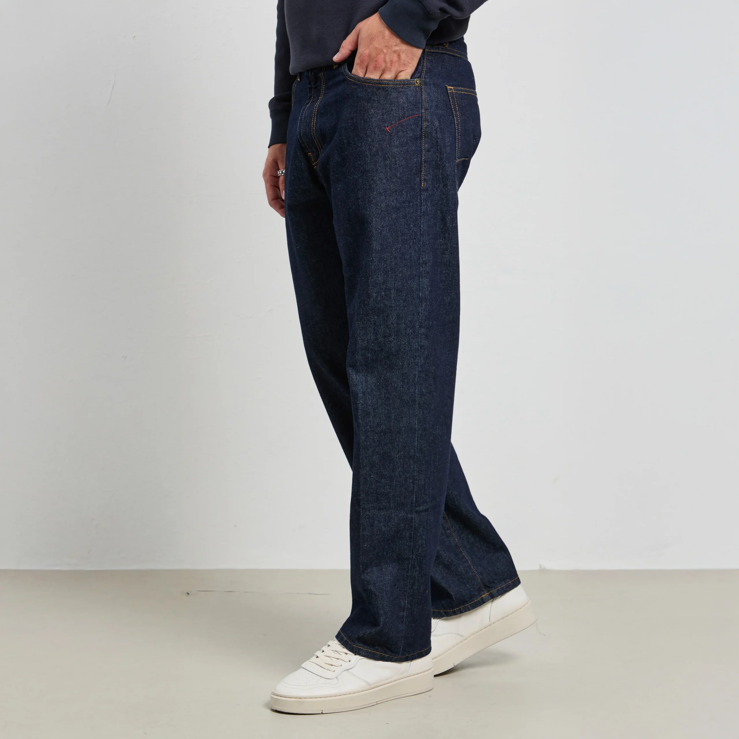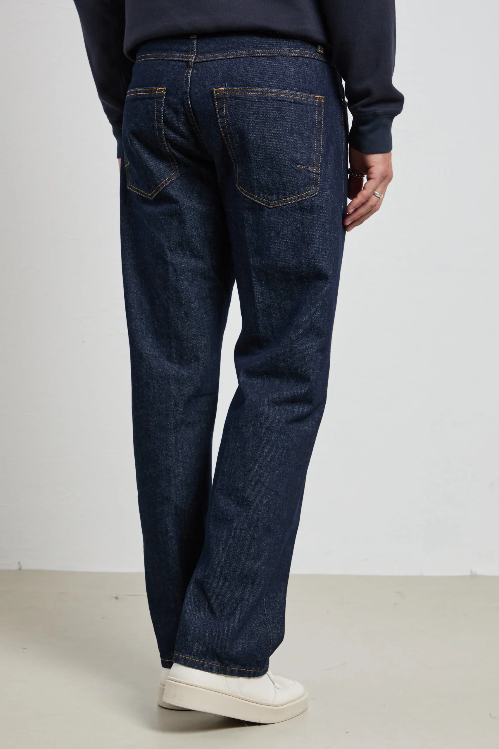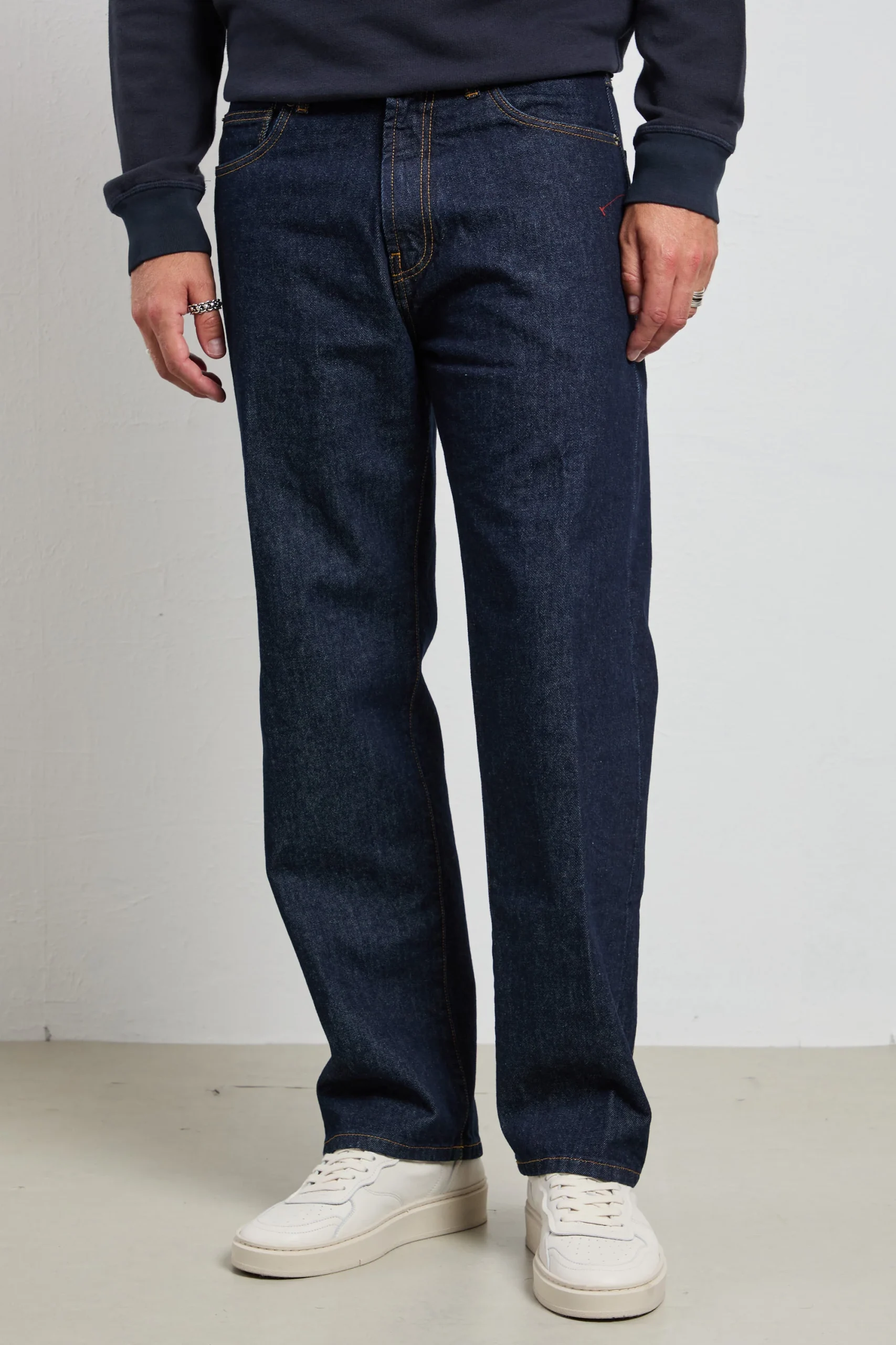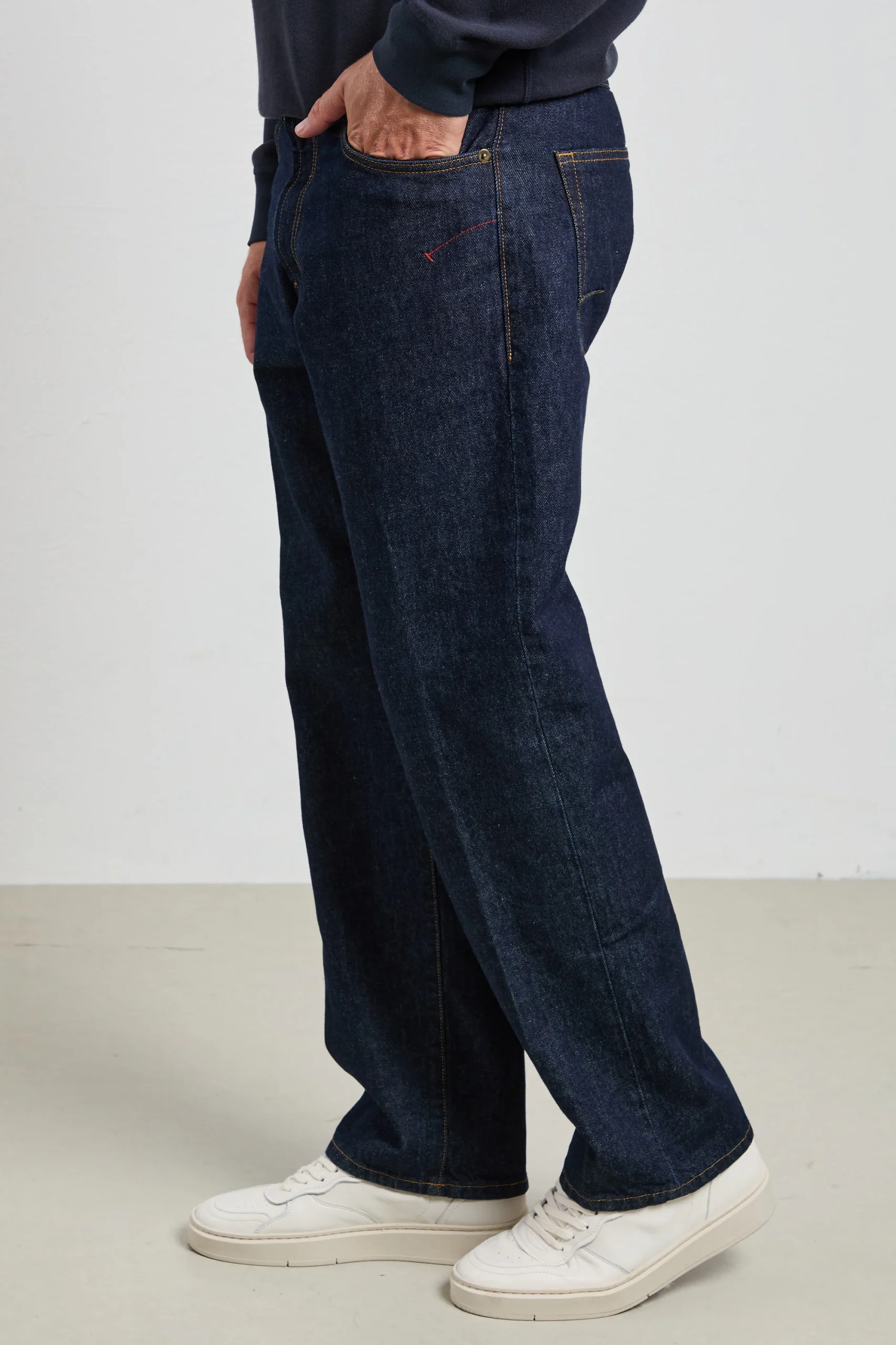 Colore: denim crudo blu scuro con cuciture a contrasto