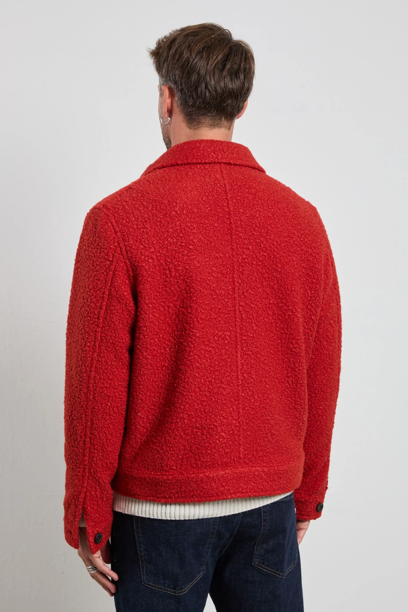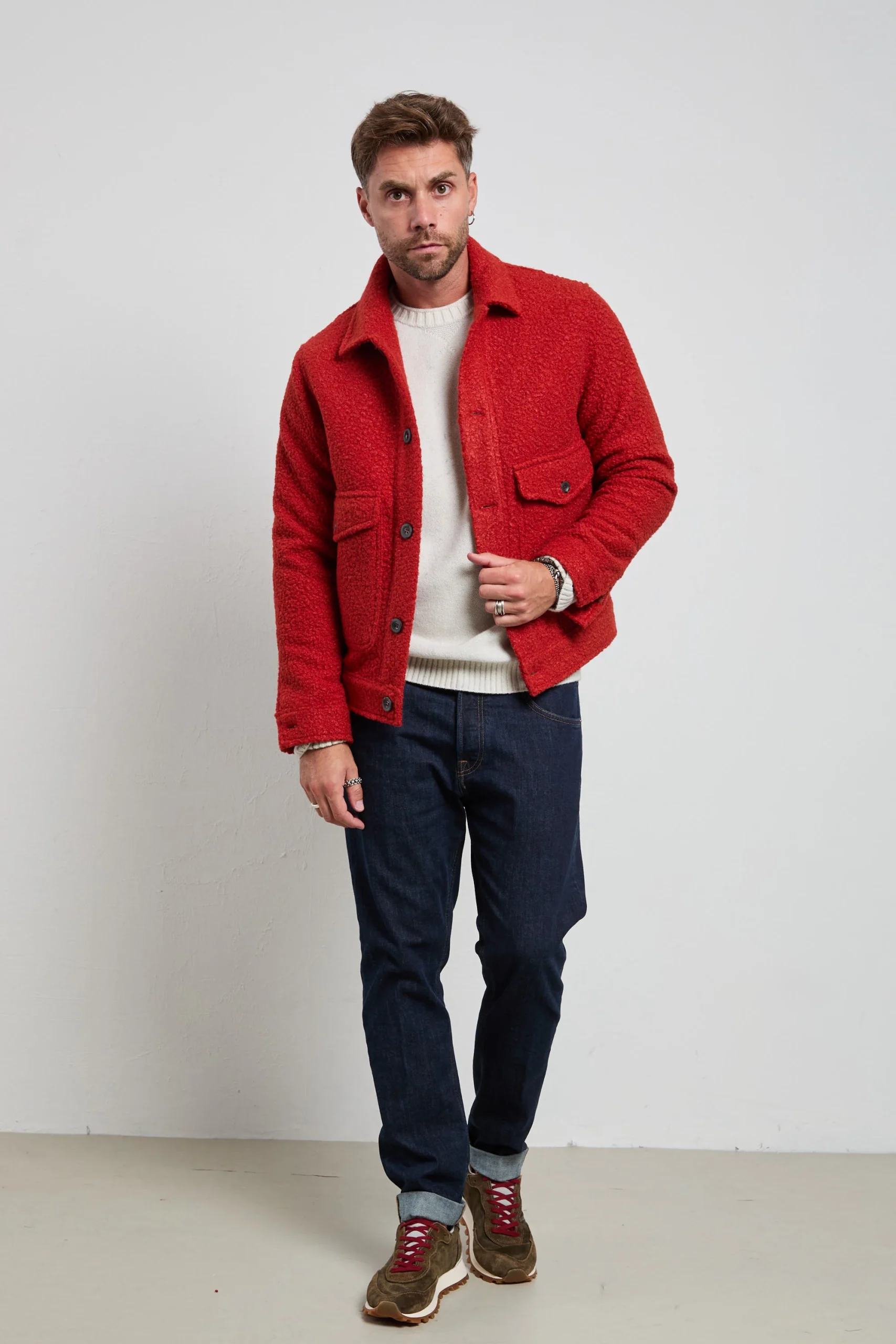 Giacca overshirt in tessuto bouclé foderato, dal carattere deciso e contemporaneo. La texture corposa e morbida la rende perfetta per la stagione fredda, mentre il taglio regolare garantisce comfort e stile. Da portare con denim scuro e stivaletti per un look casual sofisticato, o sopra un dolcevita neutro per un’eleganza metropolitana.