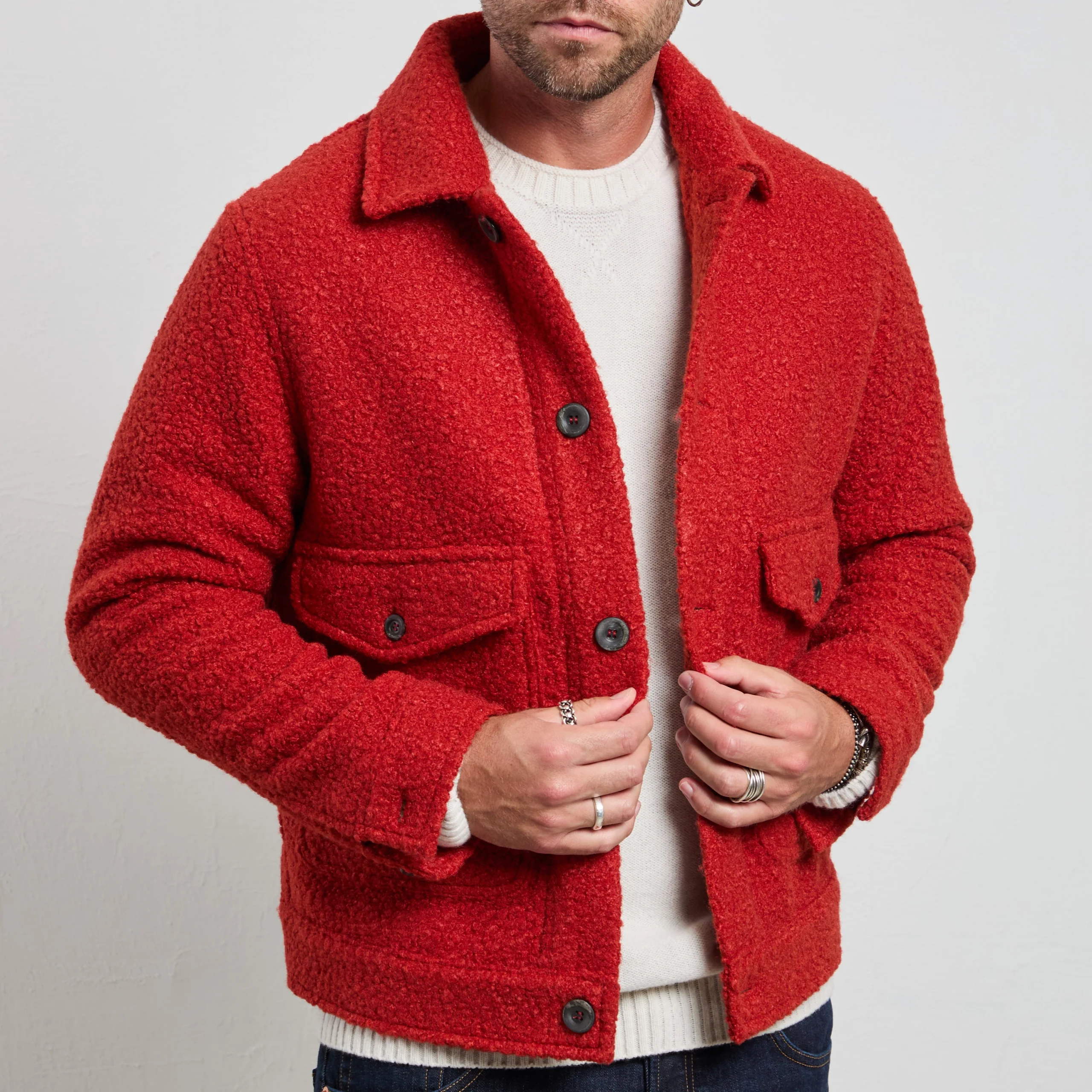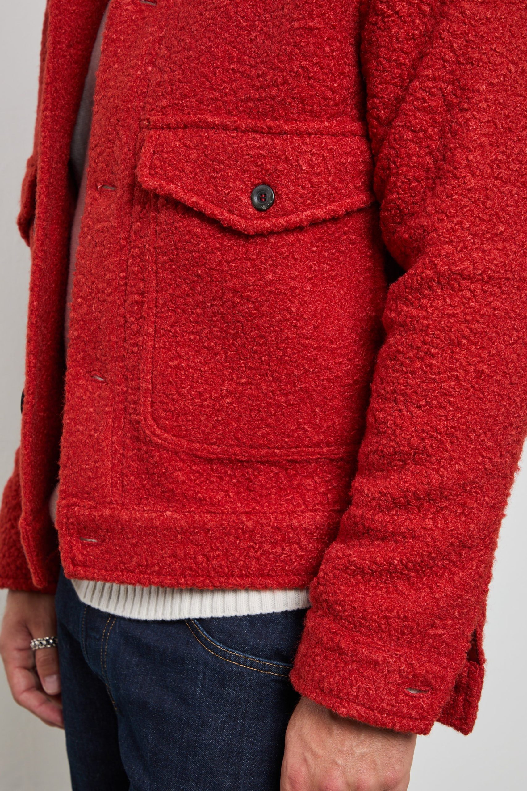 Modello: overshirt in tessuto bouclé con bottoni e tasche applicate