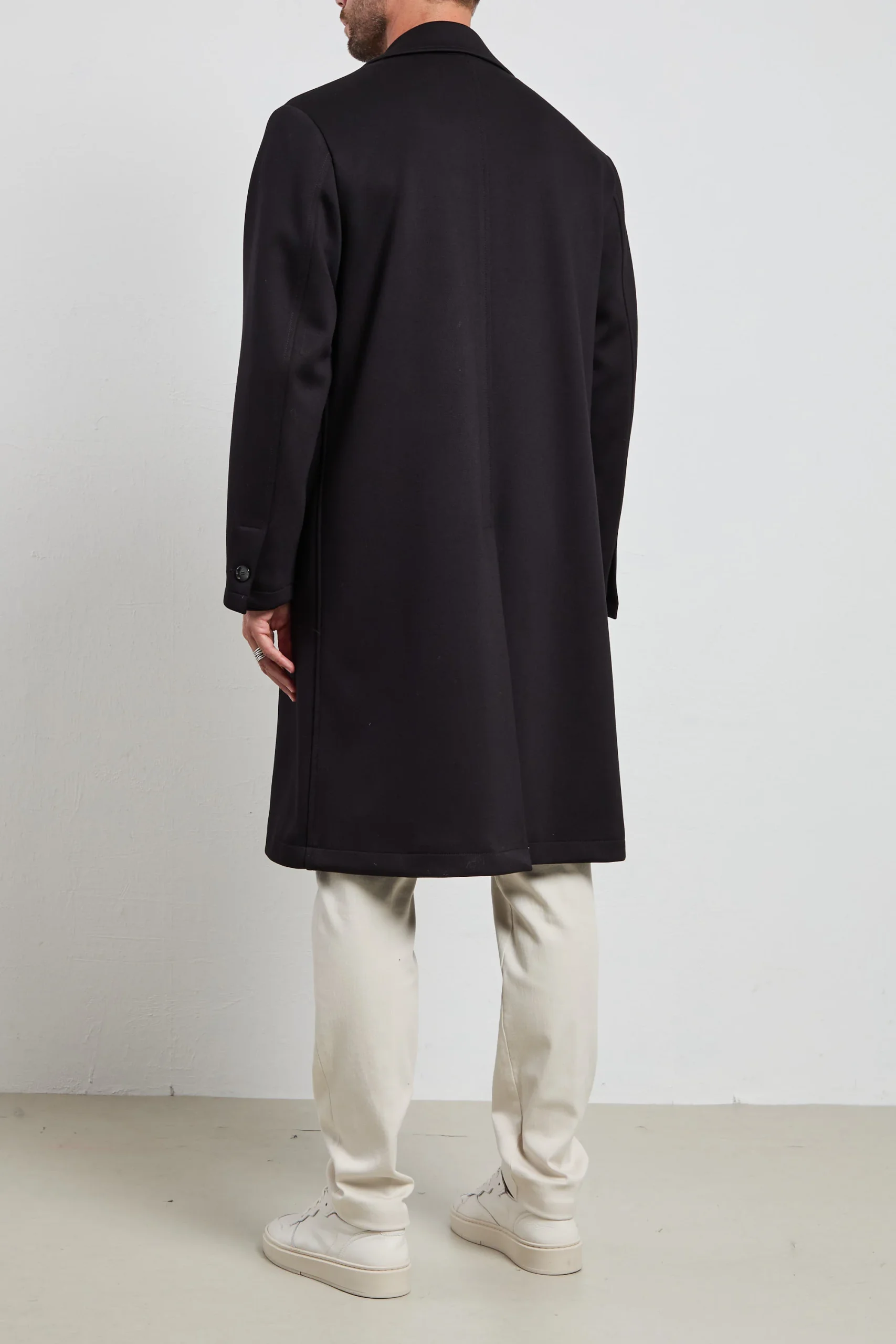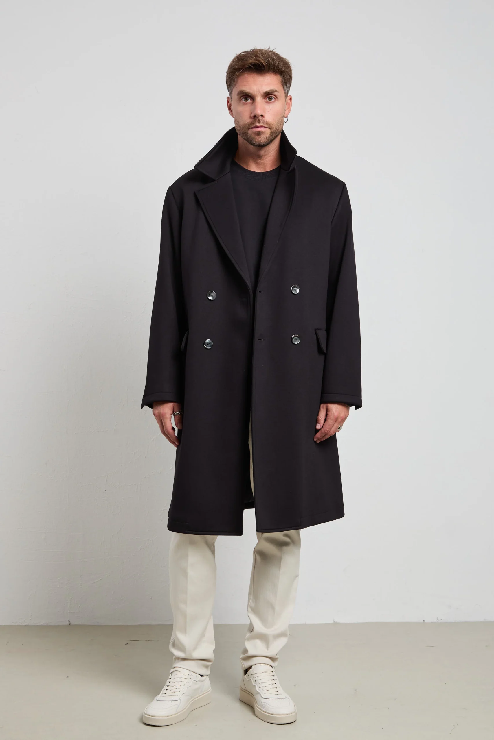 Cappotto doppiopetto in tessuto nero, un classico senza tempo rivisitato in chiave contemporanea. La linea regolare e il revers ampio donano eleganza e versatilità , ideale con pantaloni sartoriali e camicia per un look formale o con denim e dolcevita per un’eleganza metropolitana più disinvolta. Un capo essenziale per il guardaroba maschile.