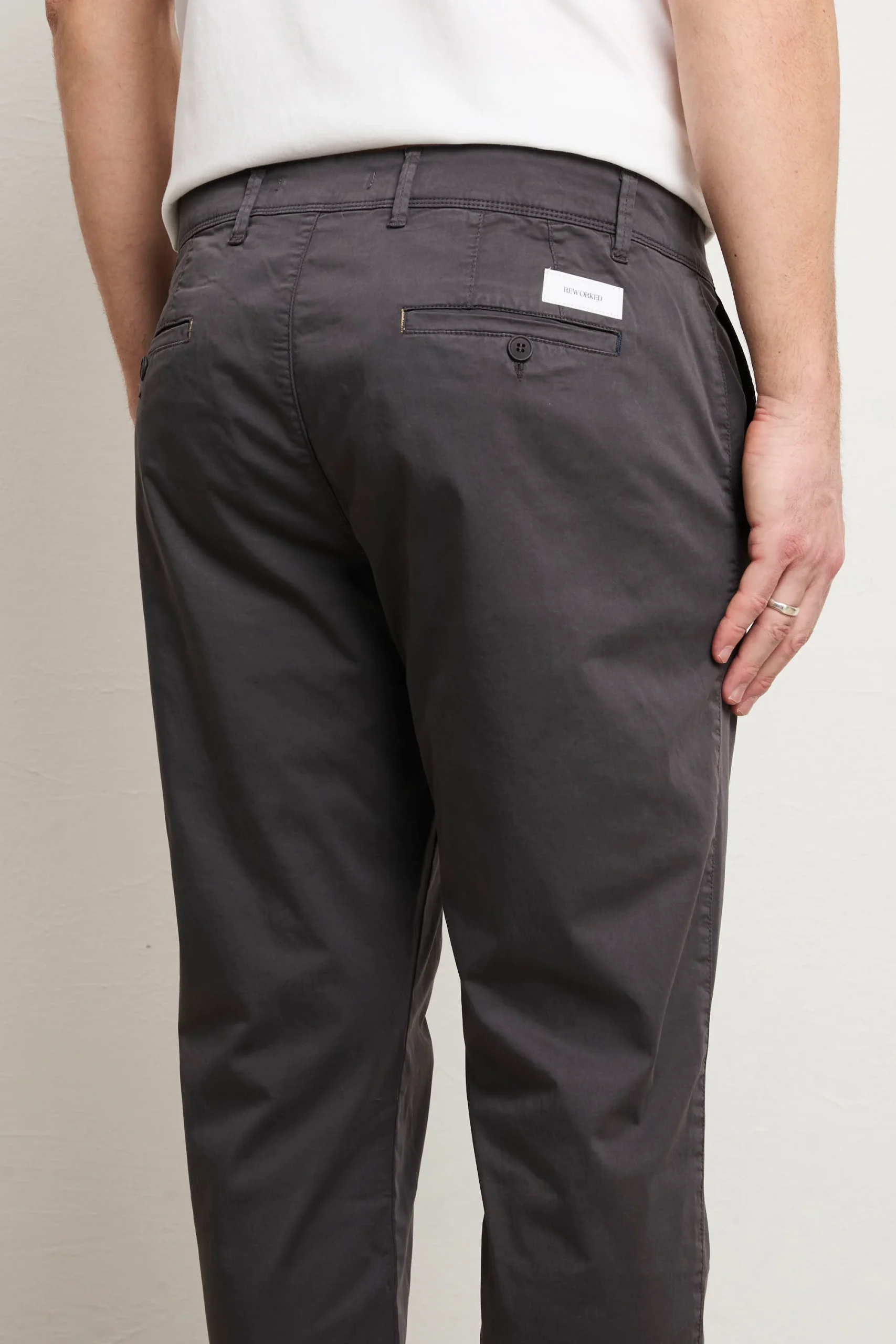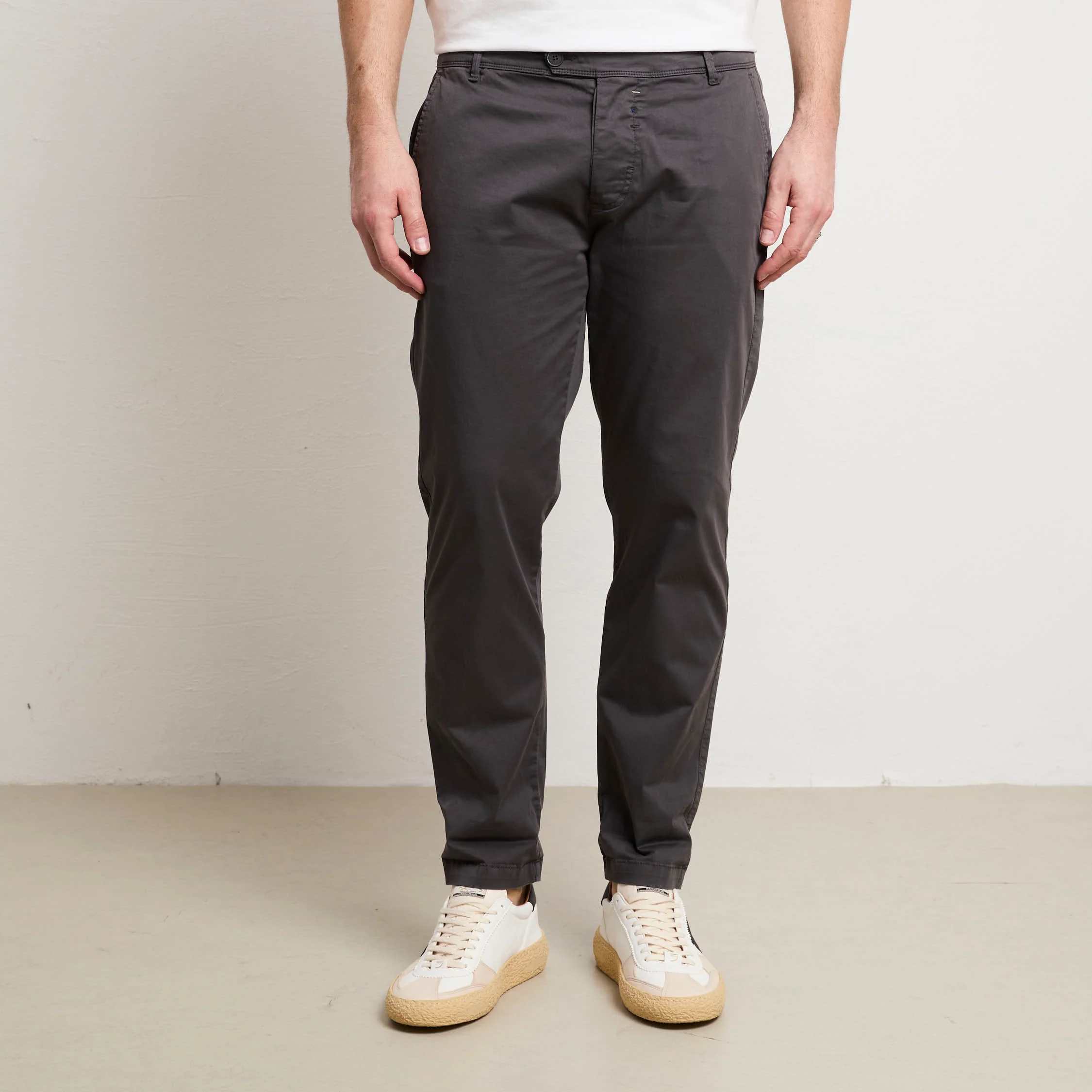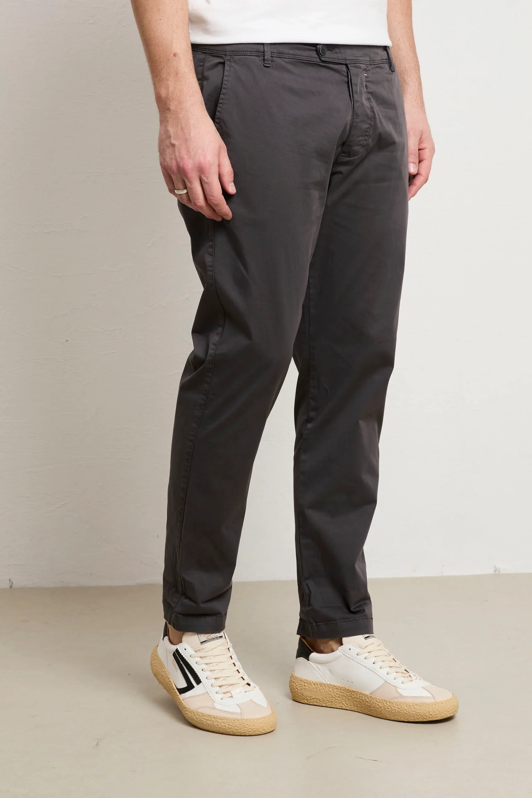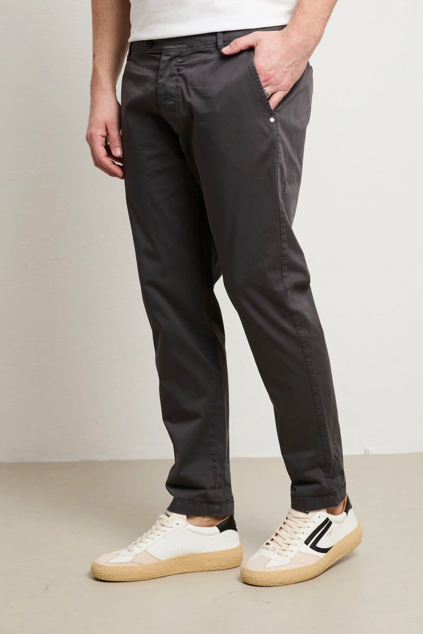 Pantalone in gabardina stretch leggera, il compagno ideale per chi ricerca comfort senza rinunciare allo stile. La composizione offre elasticità naturale e traspirabilità superiore, pronto per accompagnarti durante la giornata. La vestibilità slim e la vita normale creano una silhouette classica e senza pretese, versatile per molteplici occasioni e stili personali. Le tasche laterali oblique garantiscono praticità quotidiana, mentre le due tasche posteriori a filo chiuse da bottoni mantengono proporzioni pulite e moderne. La chiusura a bottoni assicura semplicità e affidabilità nel tempo. Il colore grigio si abbina facilmente a qualsiasi tonalità nel tuo guardaroba, dalle nuance naturali ai colori più audaci. Con un fondo di 16 cm le proporzioni sono calibrate per un look contemporaneo e bilanciato. Questo pantalone rappresenta un investimento consapevole in qualità costruttiva e design essenziale che accompagna il tuo stile con eleganza discreta e semplicità genuina.