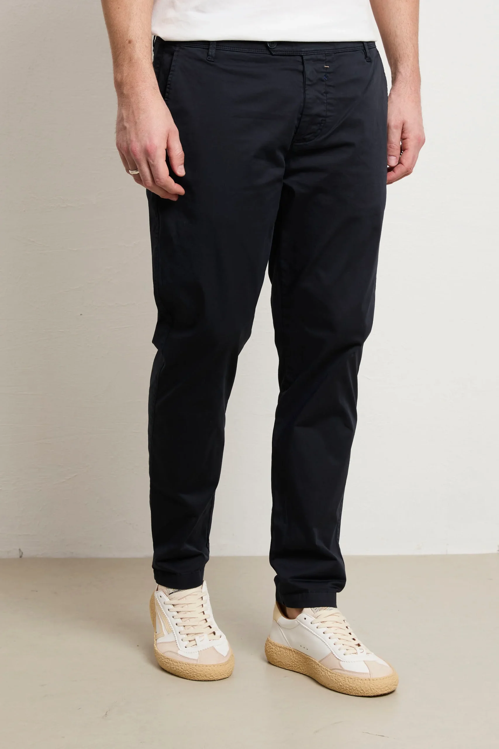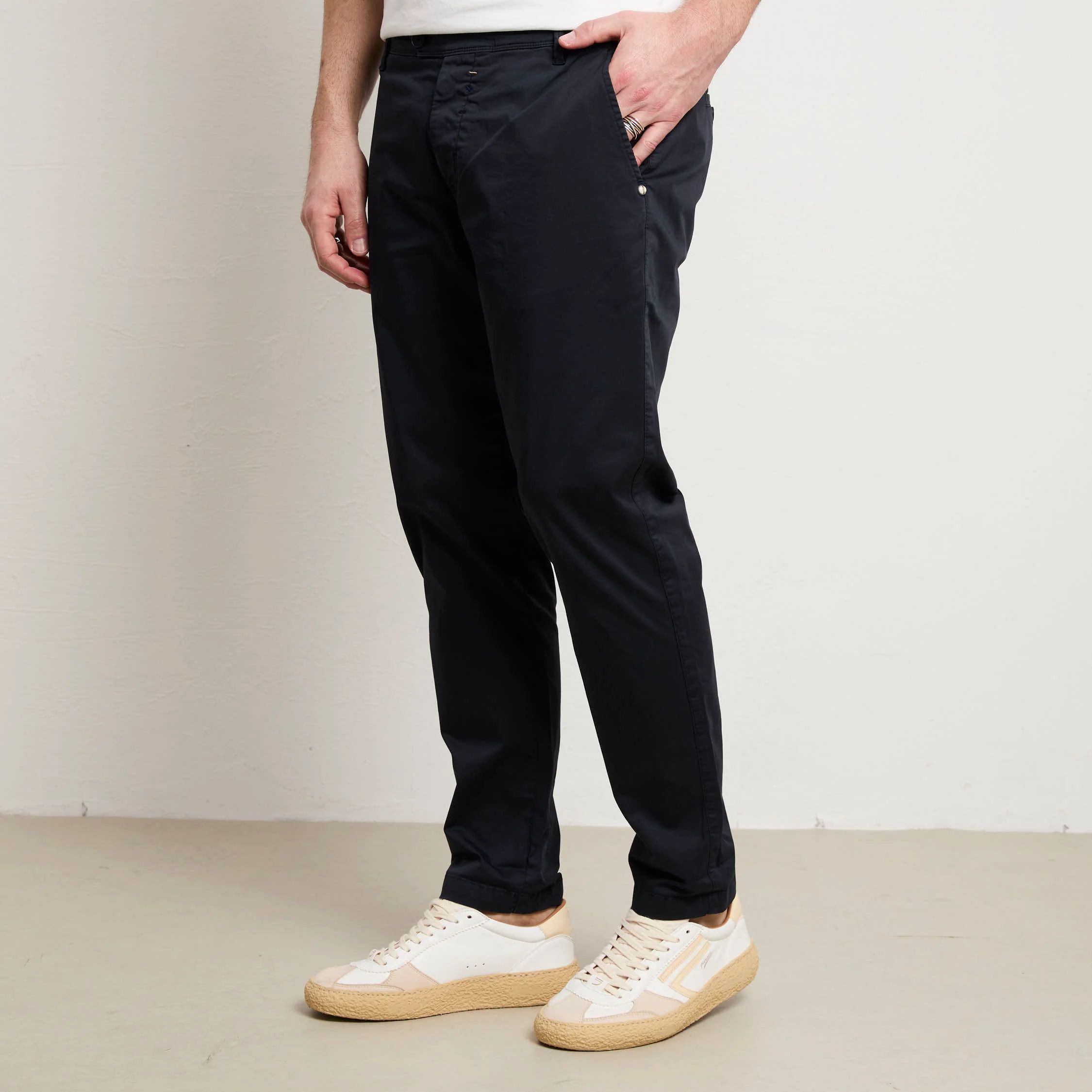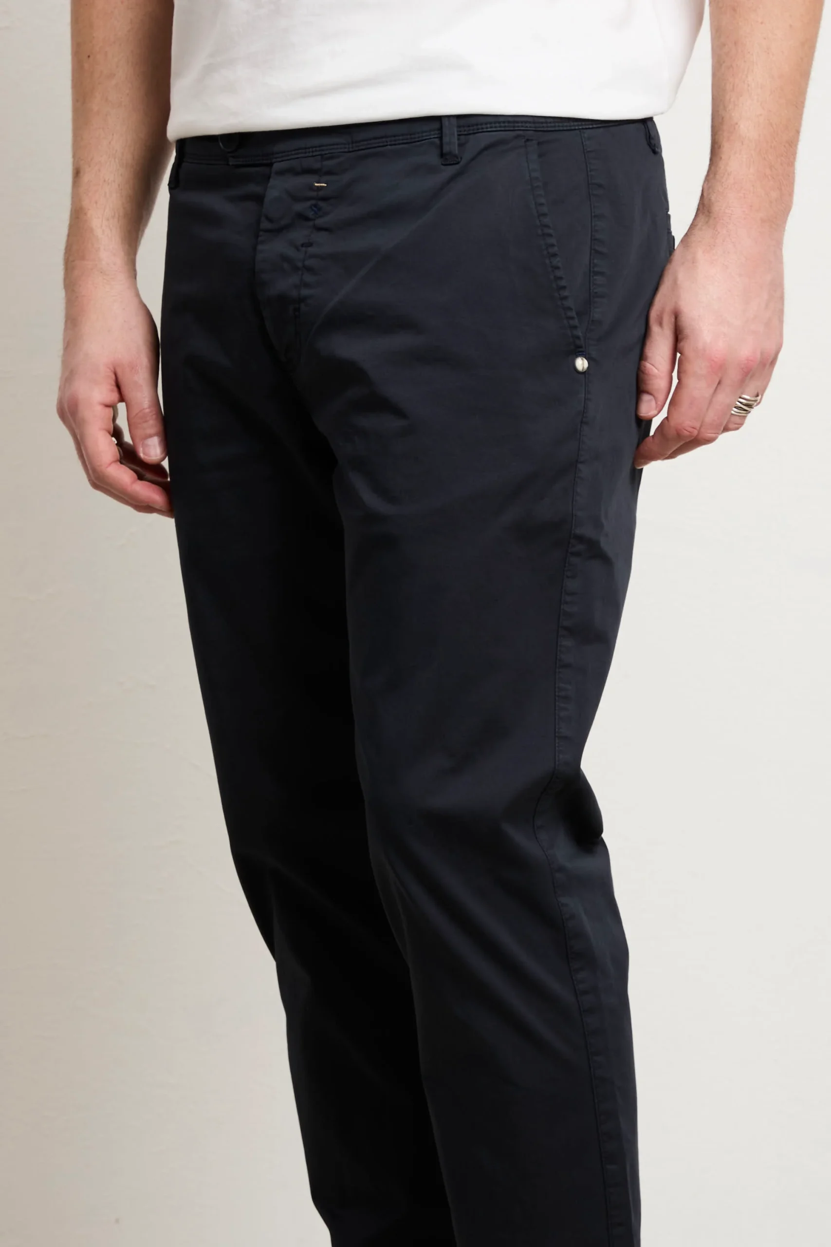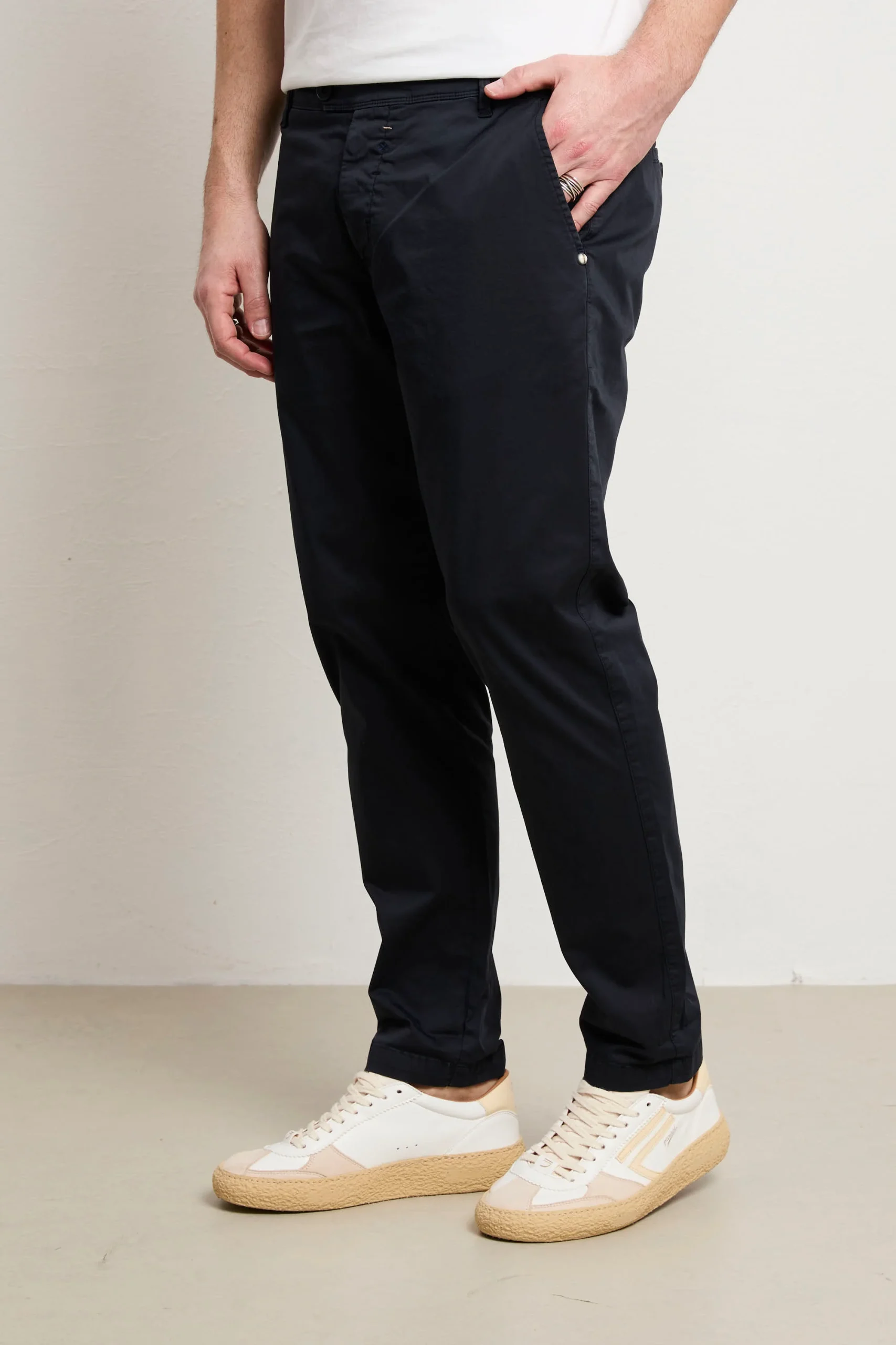 Chino in gabardina stretch leggera, un capo che sostiene il tuo stile quotidiano con solidità e semplicità. La composizione offre elasticità naturale e traspirabilità superiore, garantendo comfort autentico durante la giornata. La vestibilità sllim e la vita normale creano una silhouette classica e senza tempo, versatile per molteplici contesti e occasioni. Le tasche laterali oblique offrono praticità funzionale, mentre le due tasche posteriori a filo chiuse da bottoni mantengono proporzioni pulite e moderne. La chiusura a bottoni assicura affidabilità e durabilità nel tempo. Il colore blu profondo si integra facilmente in qualsiasi combinazione cromatica del tuo guardaroba, dalle tonalità neutre ai colori più audaci. Con un fondo di 16 cm le proporzioni sono studiate per un look contemporaneo e bilanciato. Questo pantalone rappresenta un investimento consapevole in qualità costruttiva e design essenziale che accompagna il tuo stile con eleganza discreta e comfort naturale.