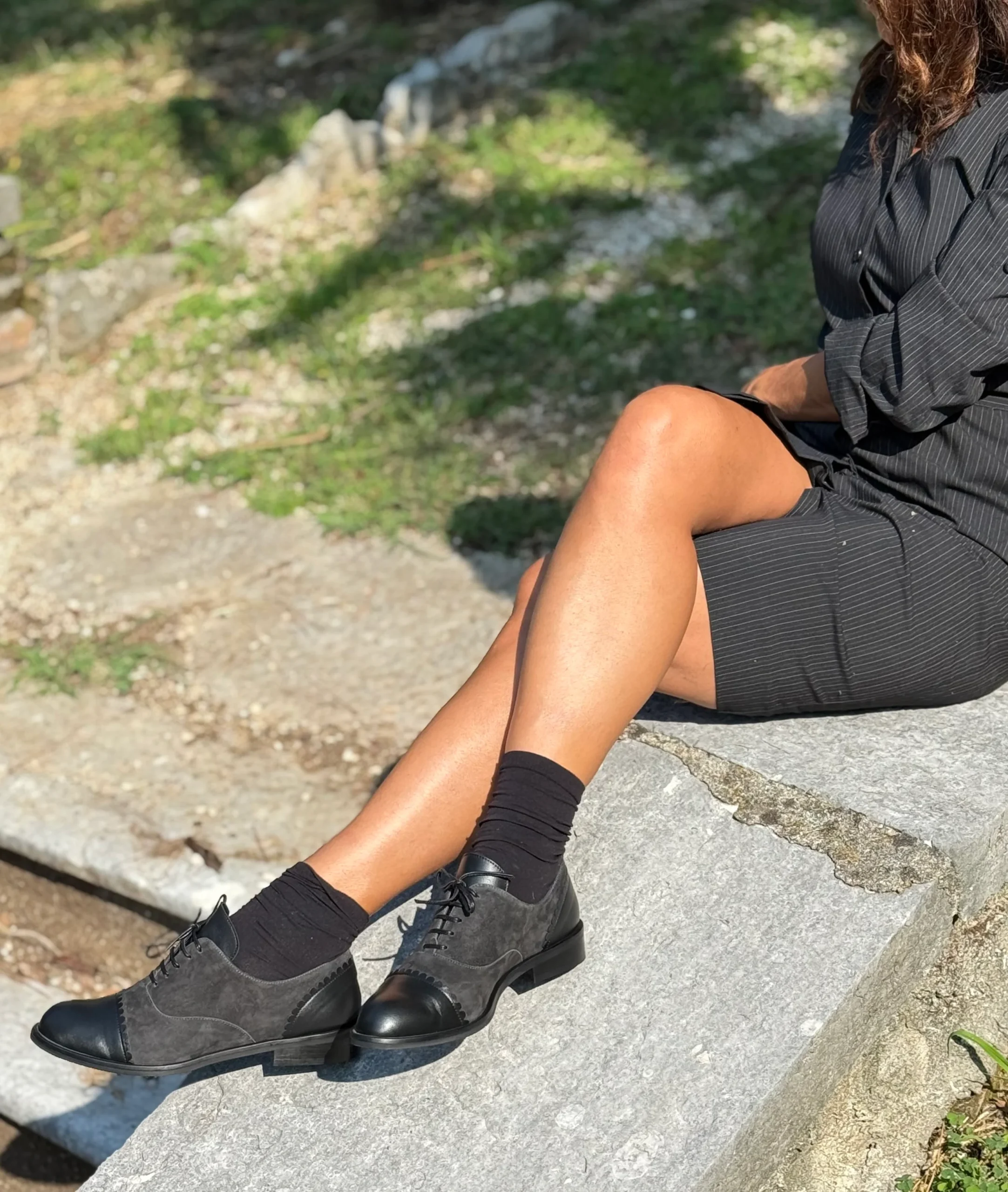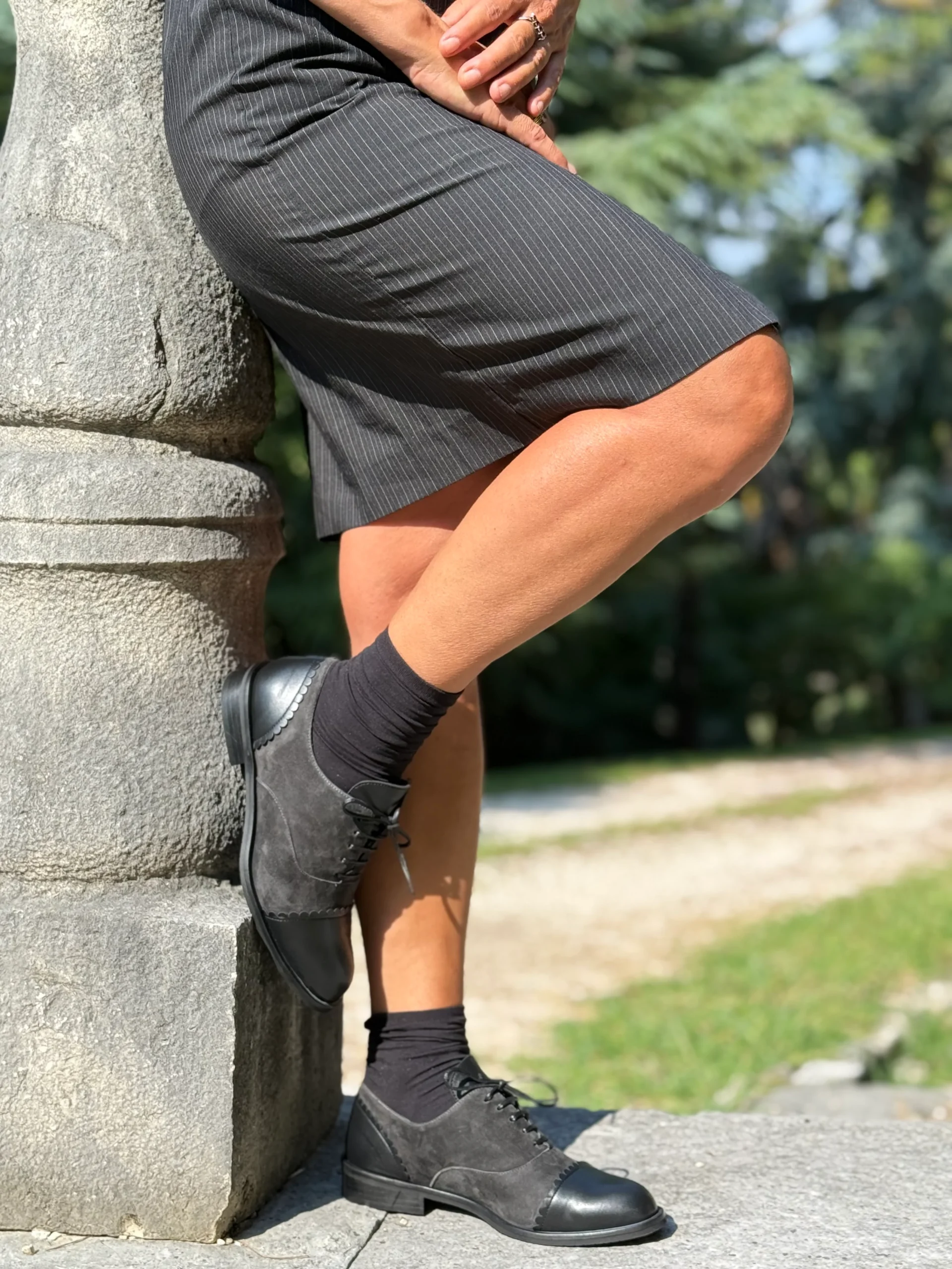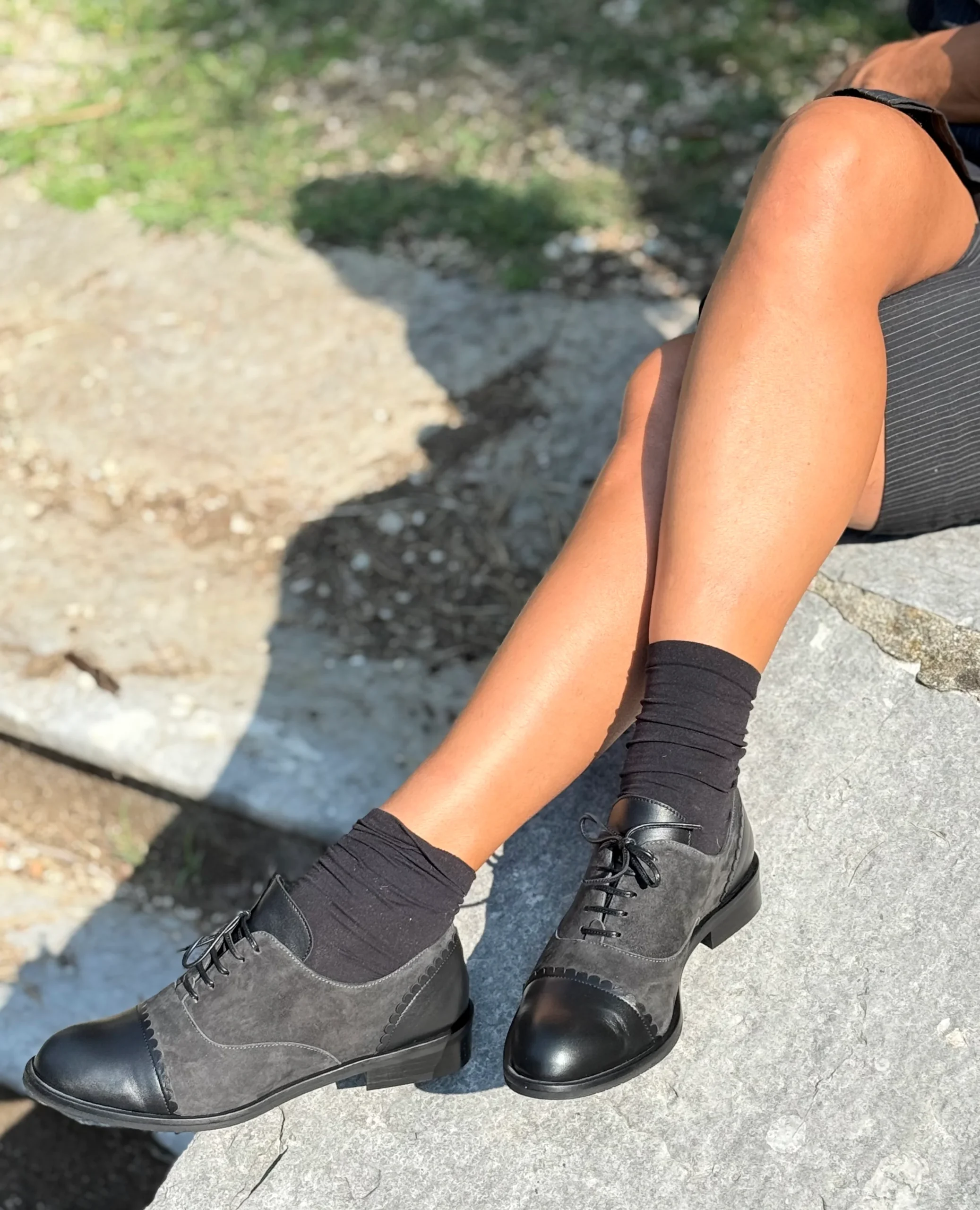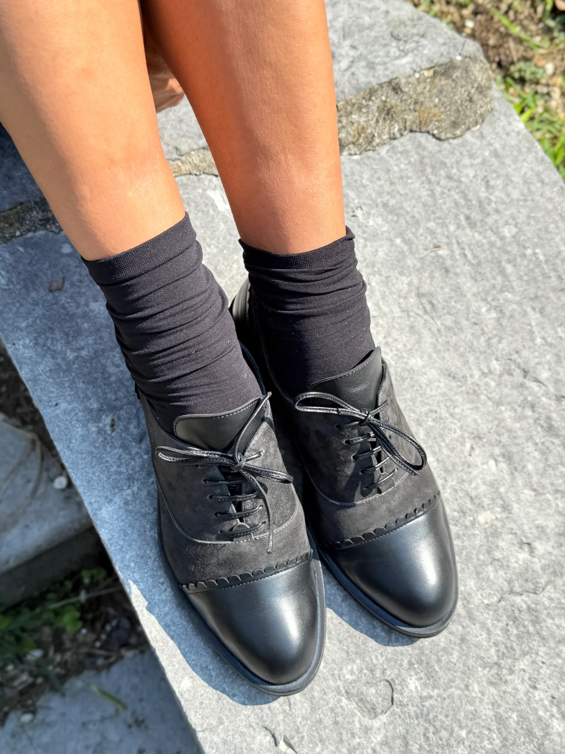 Realizzata in morbido camoscio grigio fumo quasi nero, presenta una punta in nappa dal tono più scuro impreziosita da un’elegante orlatura che decora sia la fine dell’allacciatura sul davanti, sia il tallone sul retro.