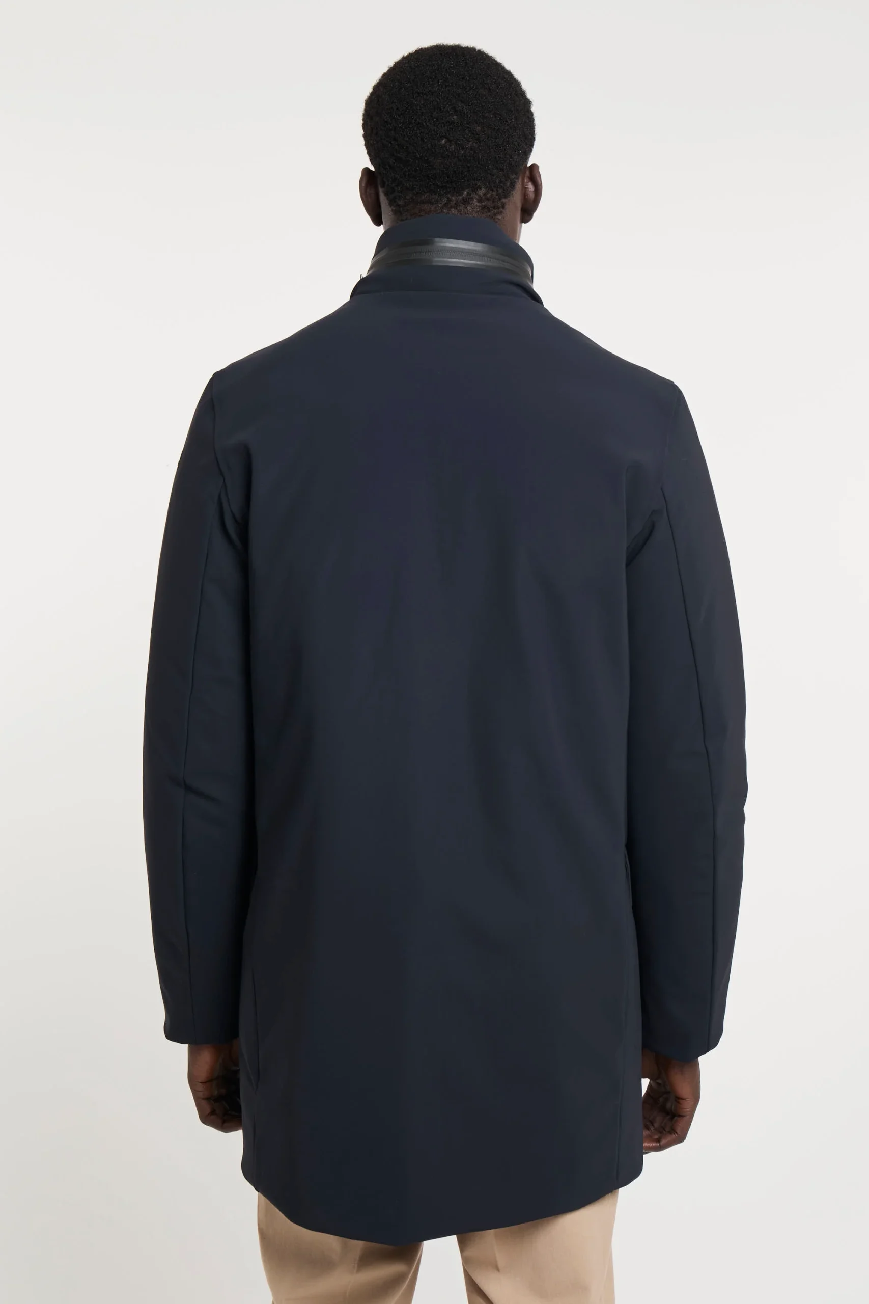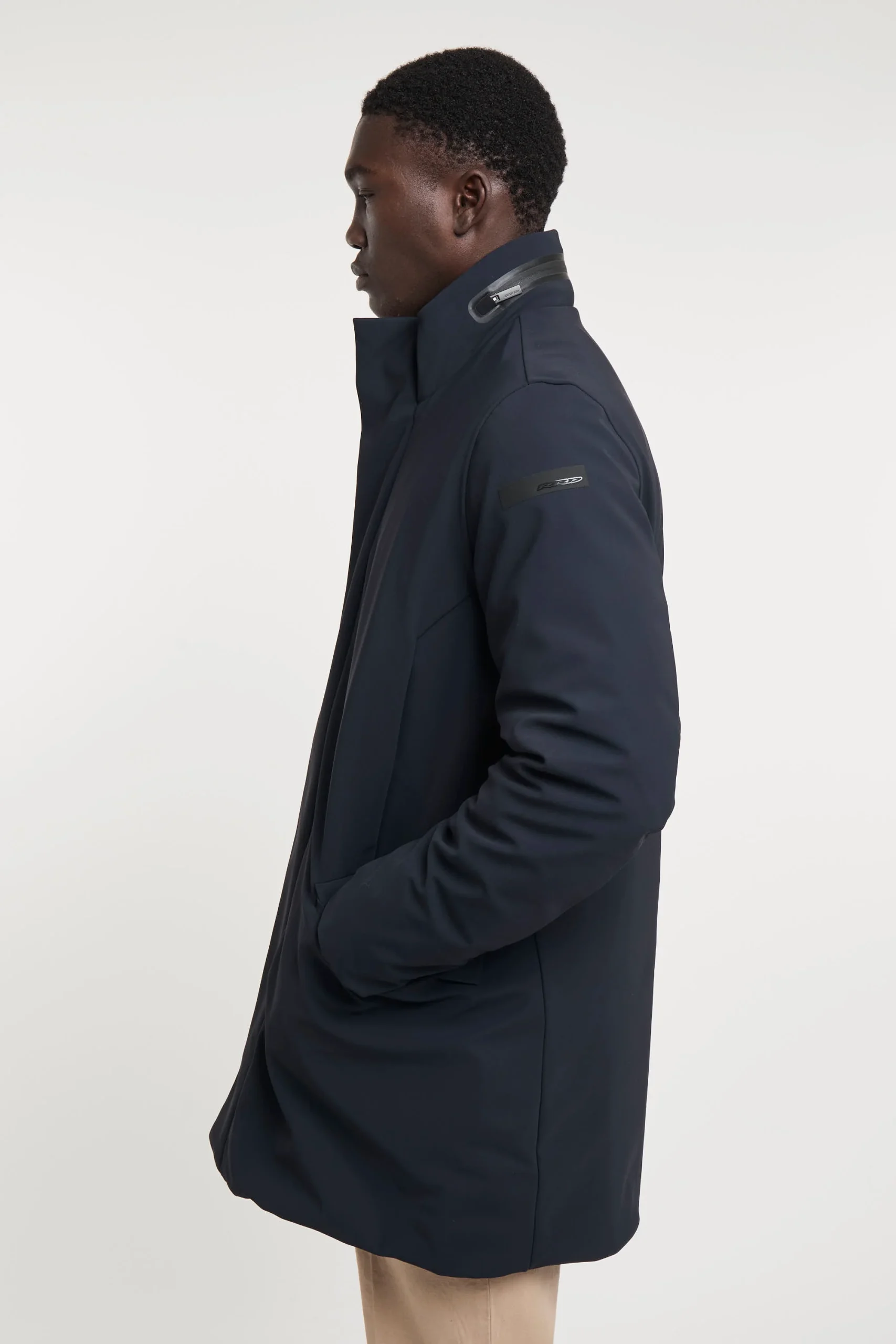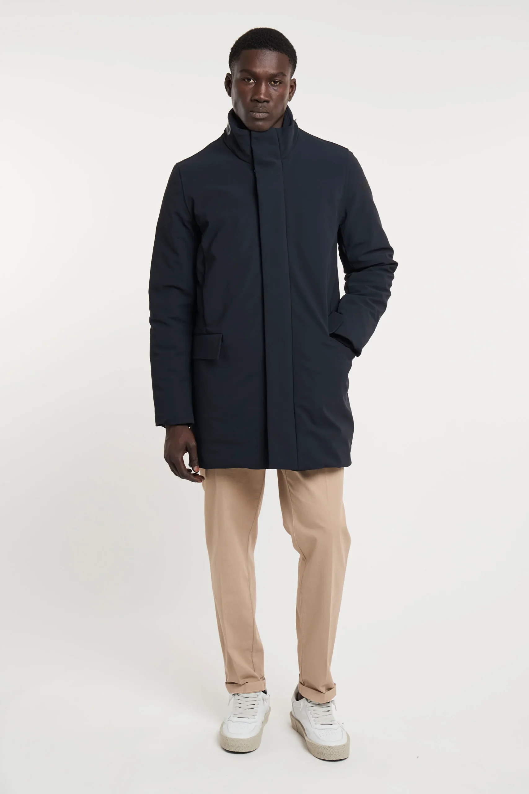 Lo stile intramontabile del soprabito trova una nuova interpretazione contemporanea e tecnologica in un capo dal design pulito ed essenziale. L’effetto super opaco dell’esclusivo tessuto SURFLEX si esalta nell’assenza di cuciture a vista. La patta abbottonata a pressione enfatizza la nitidezza estetica, nel nascondere la chiusura a zip metallica a doppio cursore. Il colletto verticale protegge il collo ed è dotato di cappuccio di servizio, chiuso dalla zip termonastrata. Il tessuto Stratofabric#3 a membrana, impermeabile, stretch e traspirante, rende il soprabito resistente alla pioggia e al vento, con ampia libertà di movimento. Il modello presenta tasche laterali multiple, a pattina e chiusura magnetica. La morbida imbottitura in piuma d’anatra 90/10 è contenuta nei canali tubici privi di impunture e dotati di due taschini interni, a zip invisibile. Vestibilità impeccabile, leggerezza e comfort per le giornate più fredde della mezza stagione. SURFLEX porta con sé qualità indelebili: autenticità brevettata per la costruzione innovativa e per il processo produttivo e sostenibilità certificata. È un tessuto tecnico dall’aspetto super opaco che ricorda le texture più tradizionali: è compatto, morbido e versatile ideale per la realizzazione di capi eleganti, easy care, super stretch e non iron. È realizzato con un filo di poliammide 100% riciclato da sfridi pre e post consumer che viene recuperato e rigenerato per diventare nuova materia prima senza però intaccare fonti di energia non rinnovabili: le reti da pesca recuperate e ripulite attraverso un sofisticato processo di scomposizione fisico-chimico, vengono rigenerate in nuovo filo totalmente riciclato. Composizione: Tessuto esterno 79% Poliammidica, 21% Elastane, Tessuto interno 100% Poliammidica,