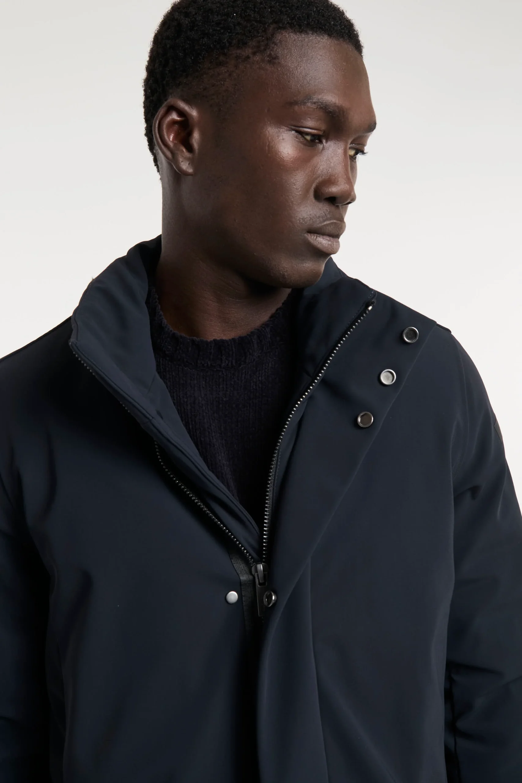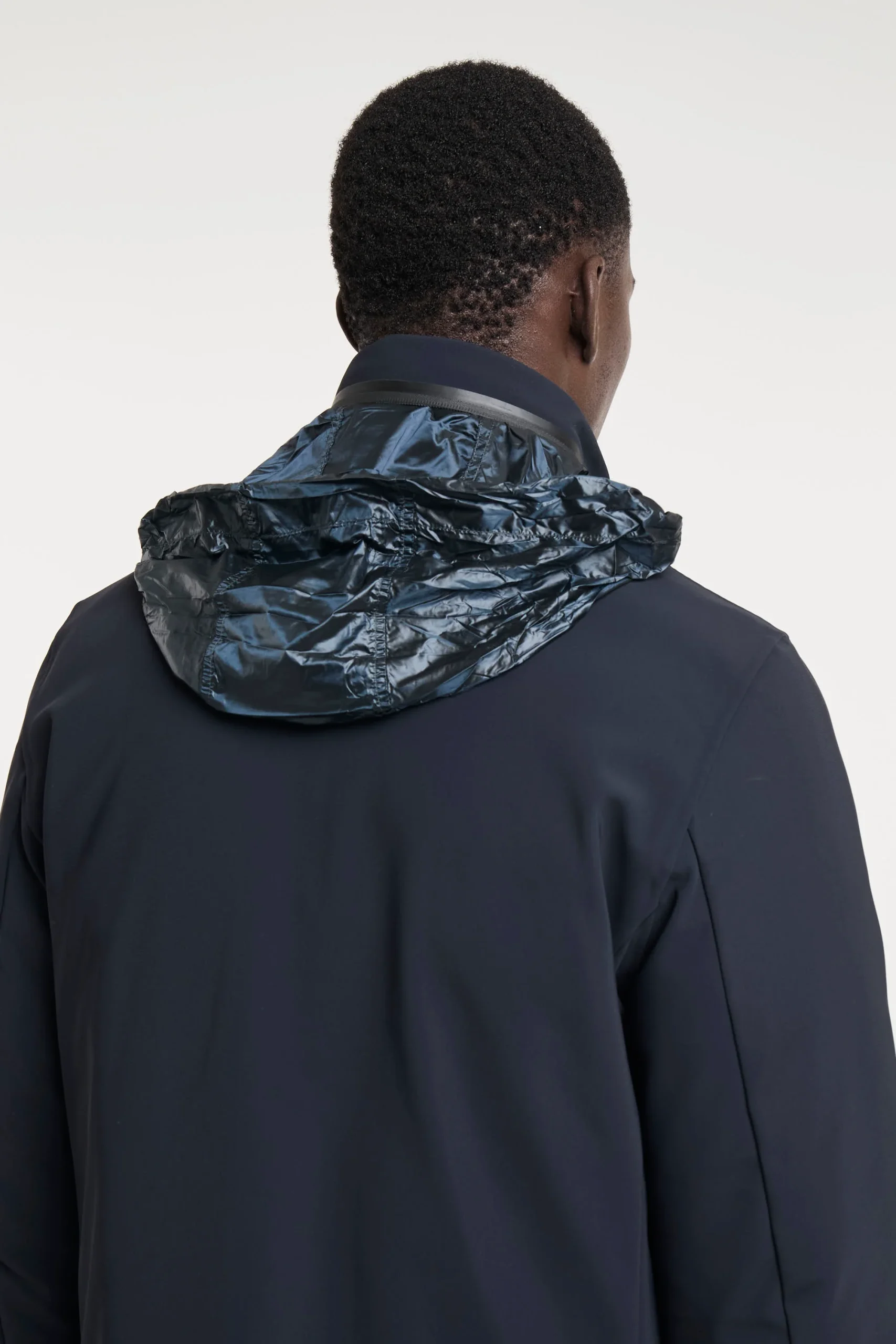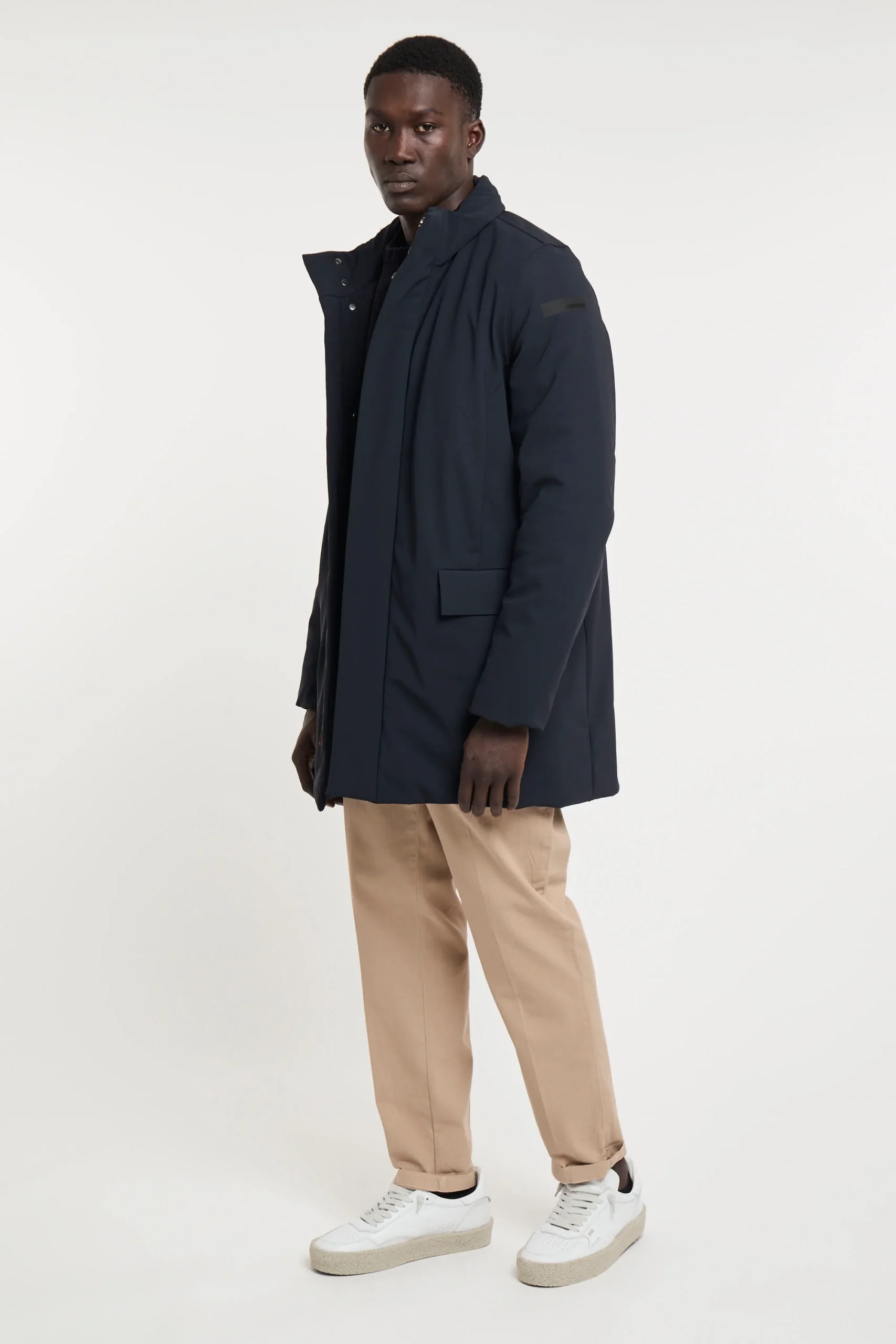 Lo stile intramontabile del soprabito trova una nuova interpretazione contemporanea e tecnologica in un capo dal design pulito ed essenziale. L’effetto super opaco dell’esclusivo tessuto SURFLEX si esalta nell’assenza di cuciture a vista. La patta abbottonata a pressione enfatizza la nitidezza estetica, nel nascondere la chiusura a zip metallica a doppio cursore. Il colletto verticale protegge il collo ed è dotato di cappuccio di servizio, chiuso dalla zip termonastrata. Il tessuto Stratofabric#3 a membrana, impermeabile, stretch e traspirante, rende il soprabito resistente alla pioggia e al vento, con ampia libertà di movimento. Il modello presenta tasche laterali multiple, a pattina e chiusura magnetica. La morbida imbottitura in piuma d’anatra 90/10 è contenuta nei canali tubici privi di impunture e dotati di due taschini interni, a zip invisibile. Vestibilità impeccabile, leggerezza e comfort per le giornate più fredde della mezza stagione. SURFLEX porta con sé qualità indelebili: autenticità brevettata per la costruzione innovativa e per il processo produttivo e sostenibilità certificata. È un tessuto tecnico dall’aspetto super opaco che ricorda le texture più tradizionali: è compatto, morbido e versatile ideale per la realizzazione di capi eleganti, easy care, super stretch e non iron. È realizzato con un filo di poliammide 100% riciclato da sfridi pre e post consumer che viene recuperato e rigenerato per diventare nuova materia prima senza però intaccare fonti di energia non rinnovabili: le reti da pesca recuperate e ripulite attraverso un sofisticato processo di scomposizione fisico-chimico, vengono rigenerate in nuovo filo totalmente riciclato. Composizione: Tessuto esterno 79% Poliammidica, 21% Elastane, Tessuto interno 100% Poliammidica,