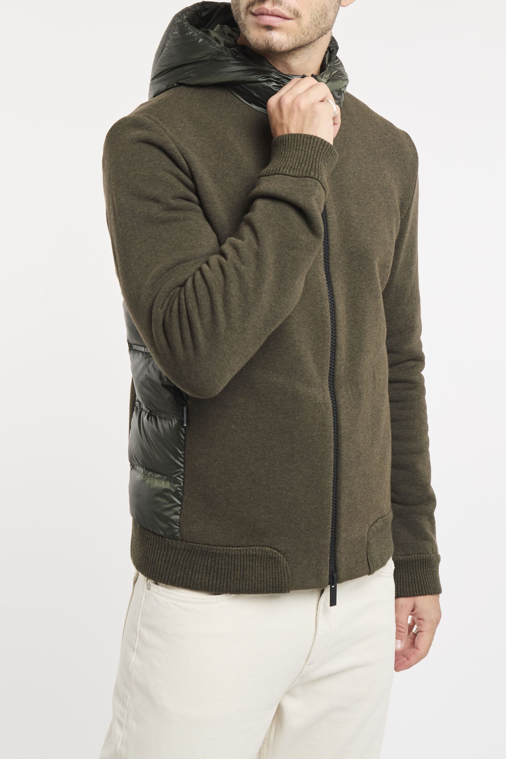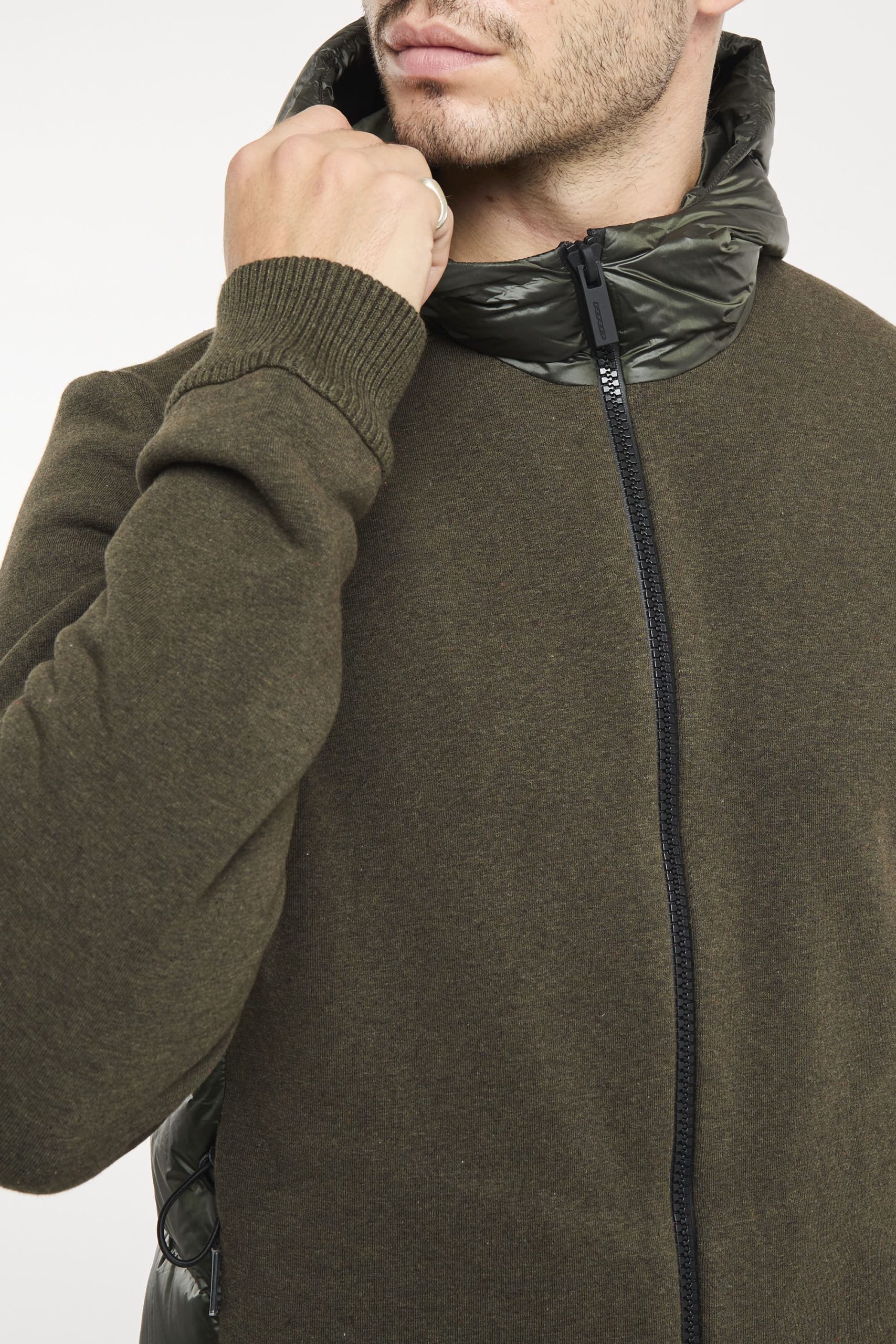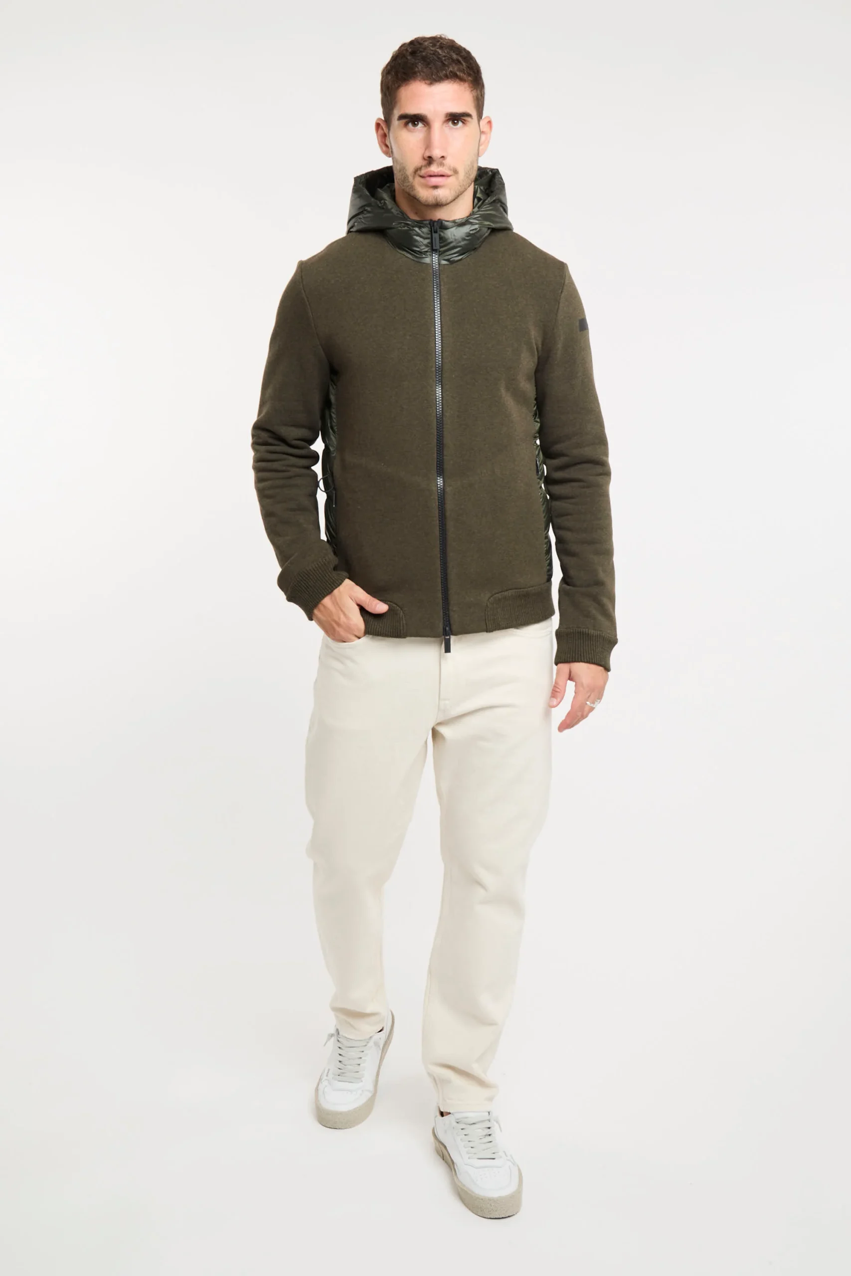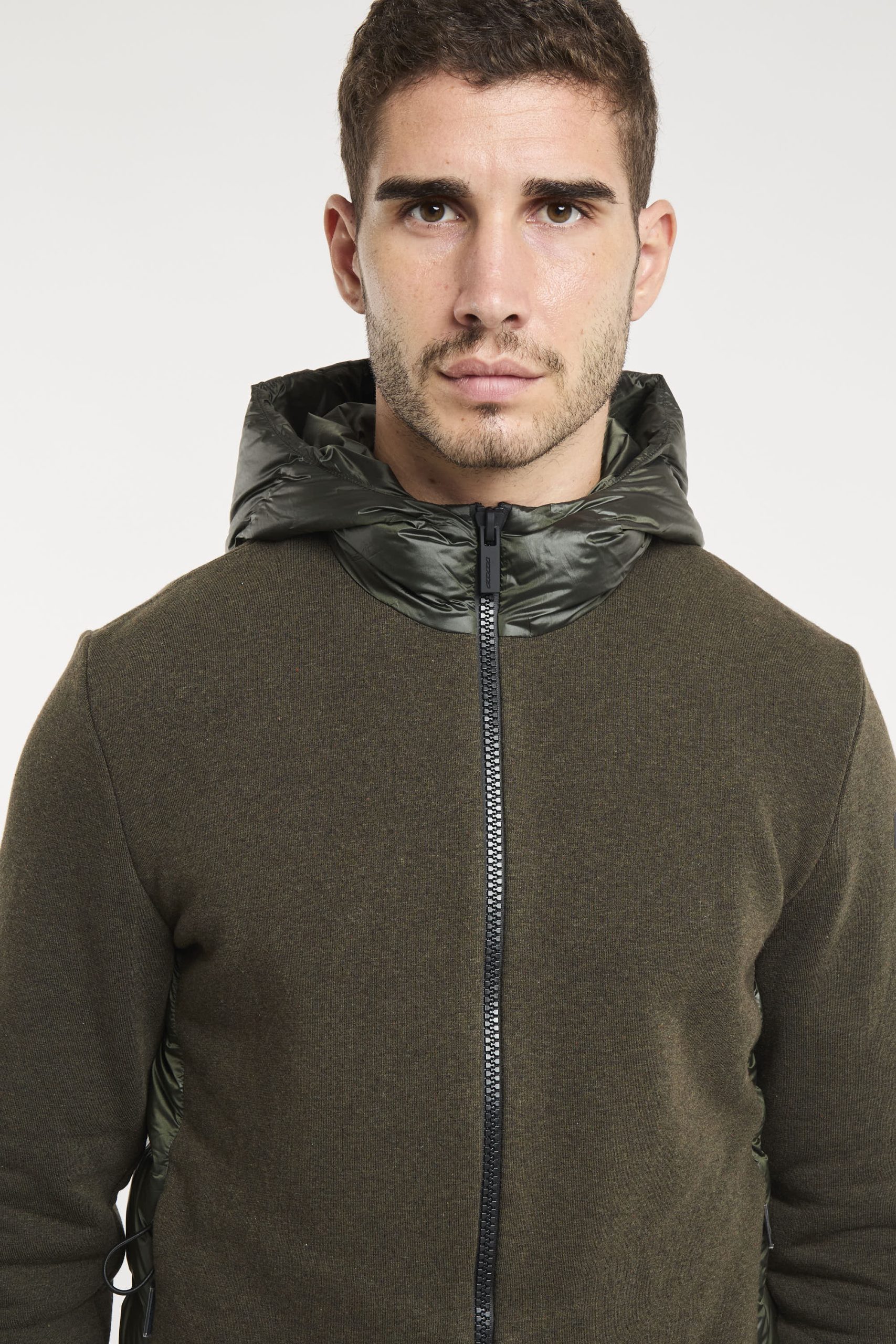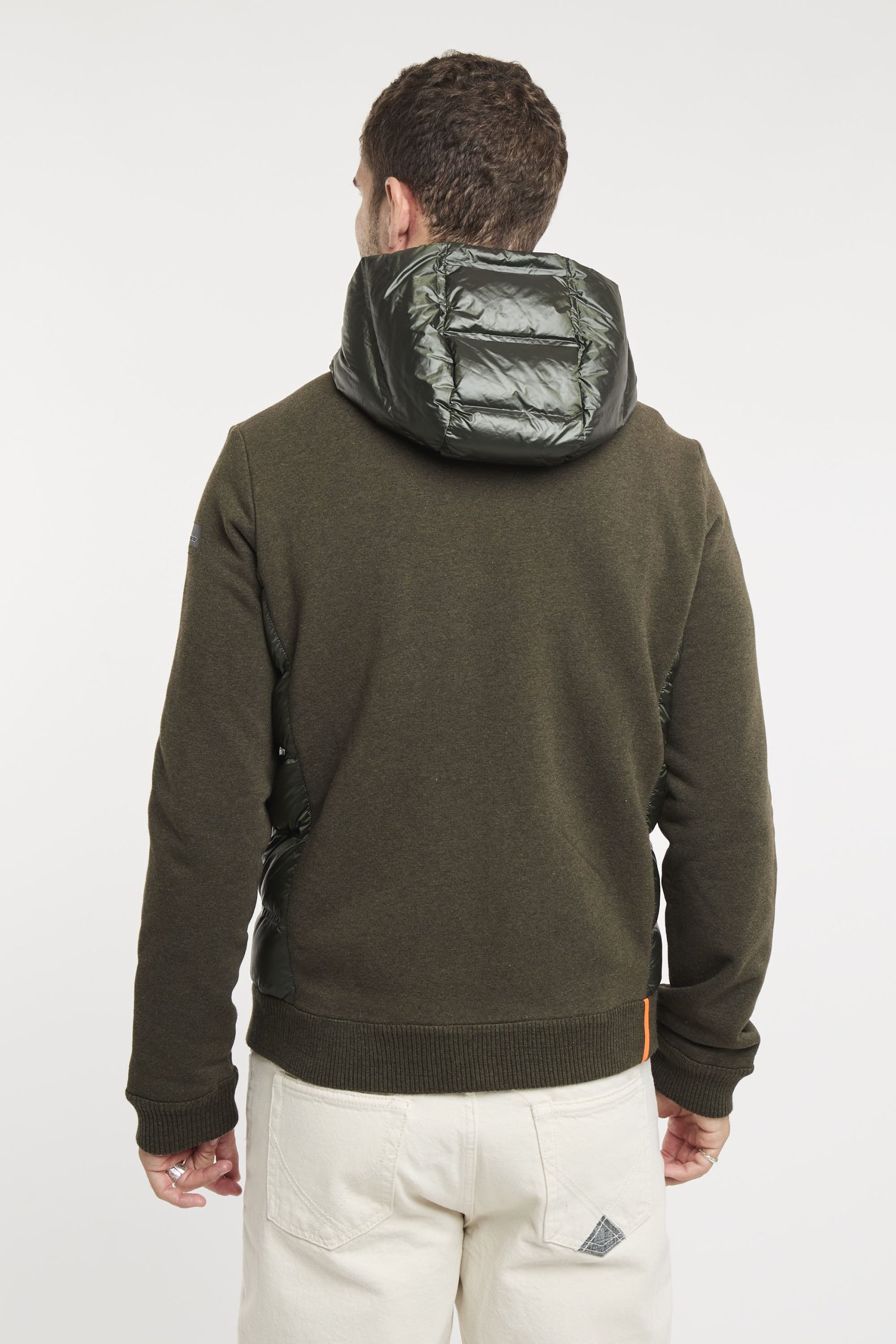 Un giubbino strutturato e robusto dotato di cappuccio fisso imbottito, per vivere con energia e grande comfort le giornate più fresche della mezza stagione. Il design composito, dalla spiccata attitudine urban, combina tessuti e finiture differenti con naturalezza e praticità. L’esterno in cotone e nylon elasticizzato presenta gli inserti laterali in canali tubici termosaldati a finitura glossy. L’imbottitura in piuma d’anatra 90/10 extrafine è leggera e ad alto potere calorifico. L’interno dell giubbino presenta il colore arancione a contrasto ed è rinforzato dal sistema di termonastrature selettive interne, mentre il fit regolare è perfezionato dalla lavorazione a finissime coste elasticizzate dei polsi e del fondo. La zip termonastrata a doppio cursore chiude il davanti e il cappuccio. Il giubbino si presta alla creazione di un casual look distintivo e contemporaneo, disponibile nelle tonalità scure di stagione e impreziosita dal logo a microiniezione nero sulla manica sinistra. Composizione: Tessuto esterno 82% Cotone, 17% Poliammide, 1% Elastan; Imbottitura 90% Piumino, 10% Piuma