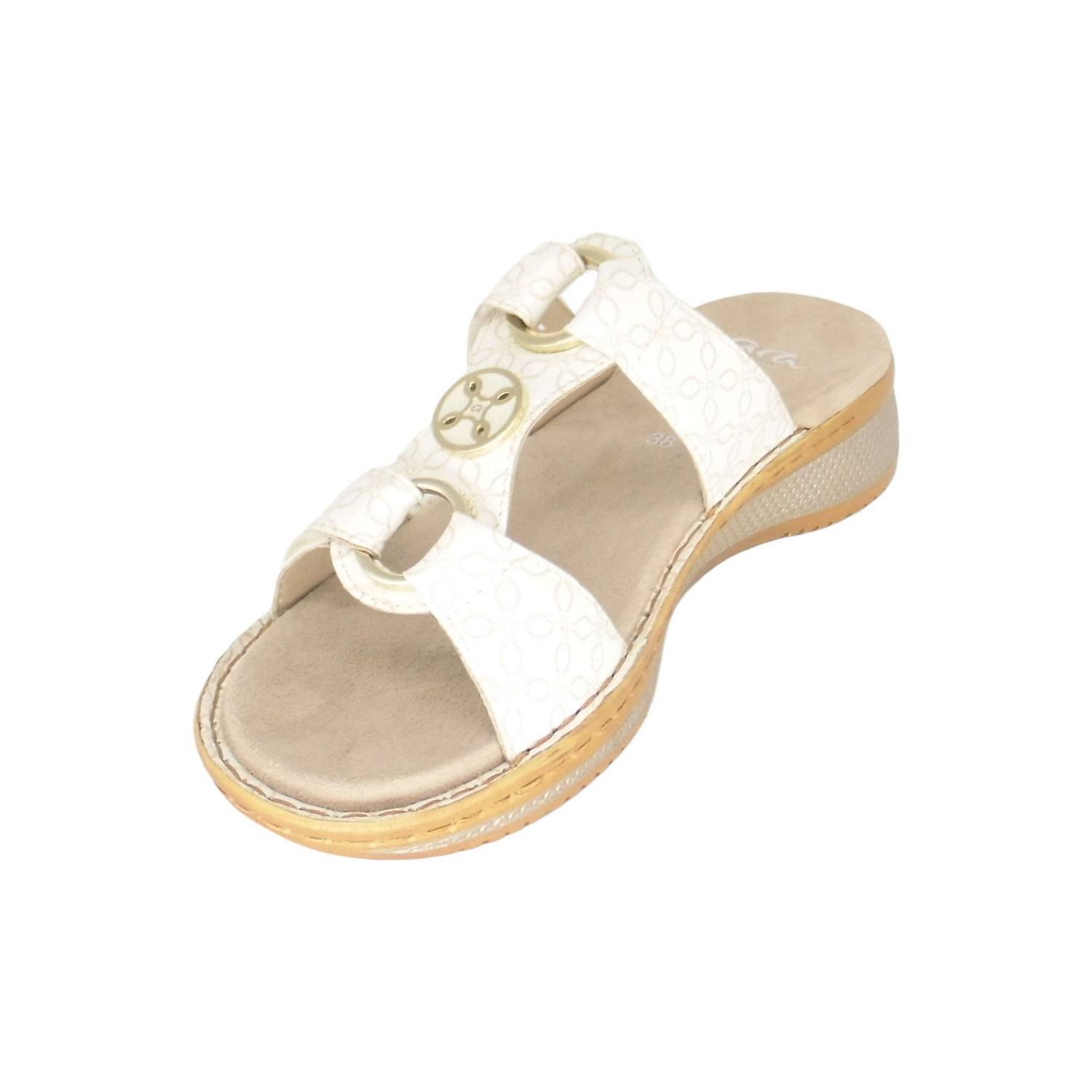 Con fantasie di colori chiari e inserti a forma di cerchi, questi sandali aggiungono un tocco di stile e originalità al tuo look estivo.