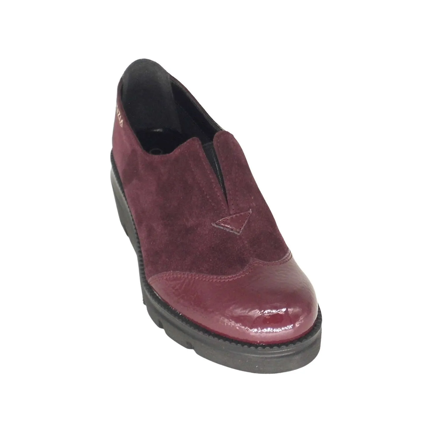 La tomaia combina vera pelle scamosciata con finiture lucide sulla punta, garantendo un look elegante e sofisticato.