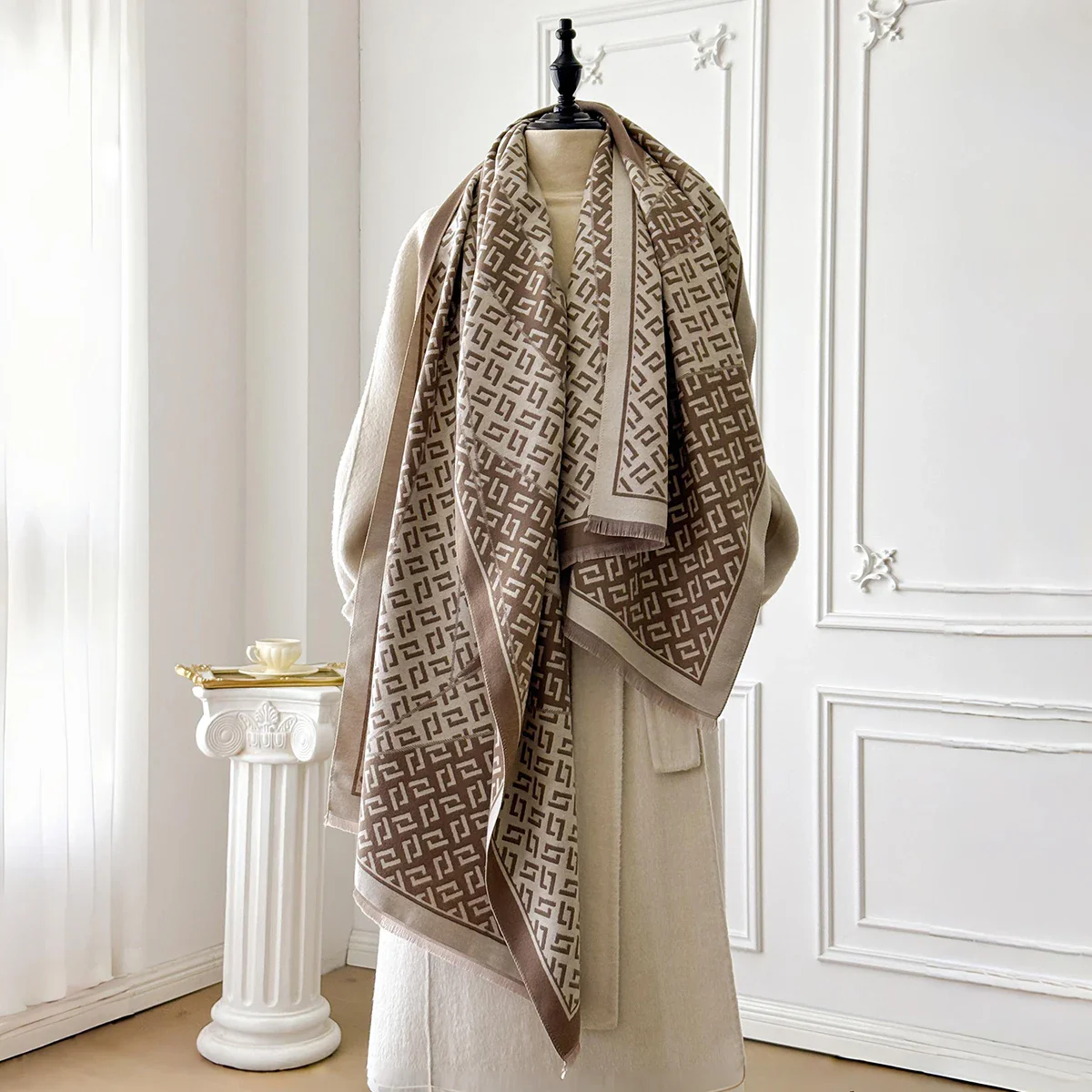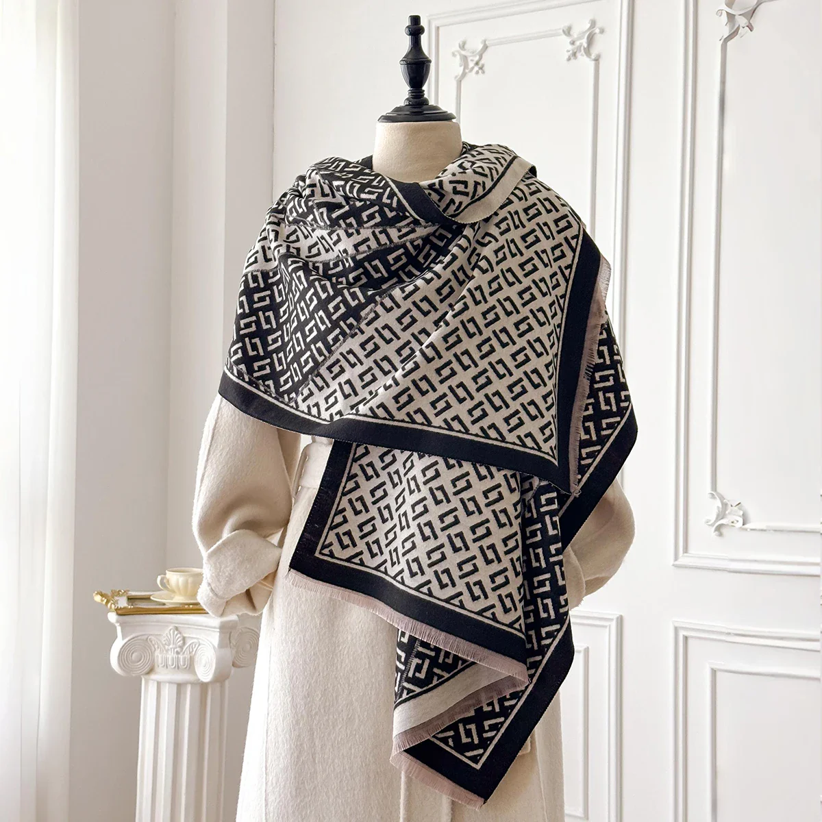 Aggiungete un tocco sofisticato al vostro stile con questa sciarpa a motivi geometrici neri e beige. Elegante e versatile, si abbina bene sia a un cappotto invernale che a un outfit più leggero per la mezza stagione.