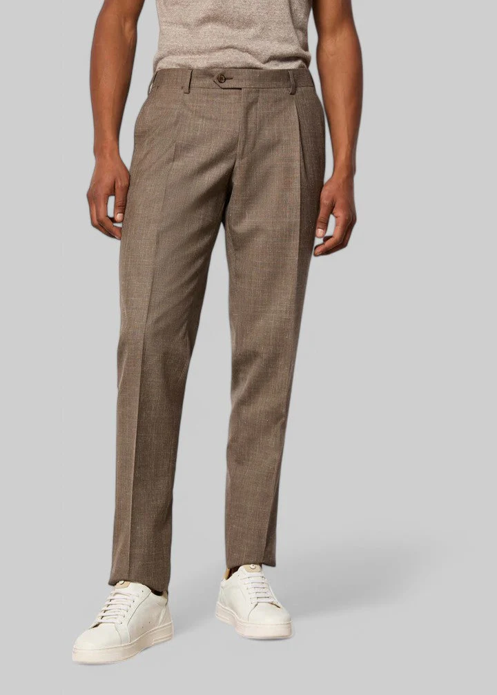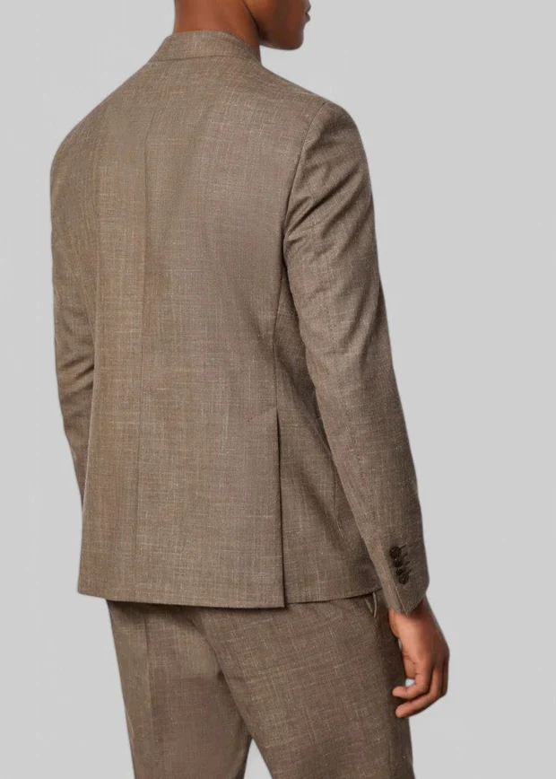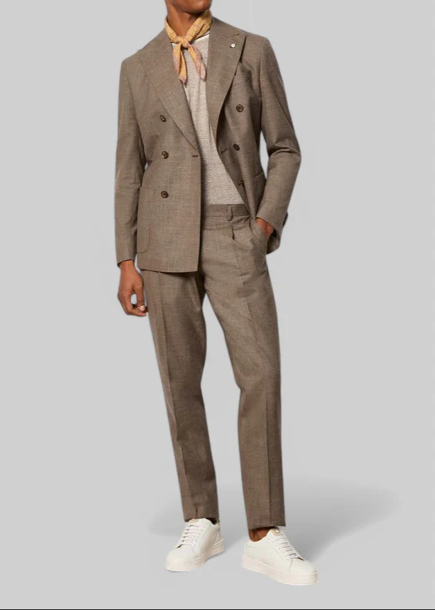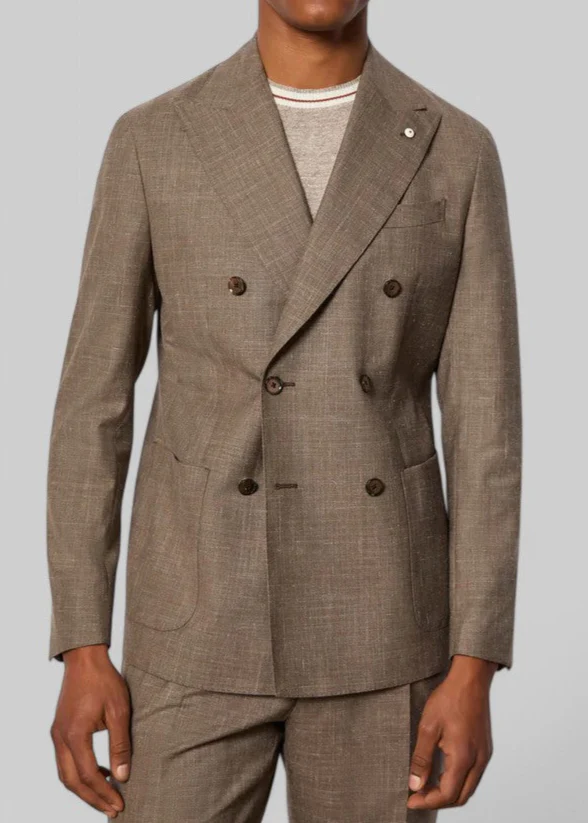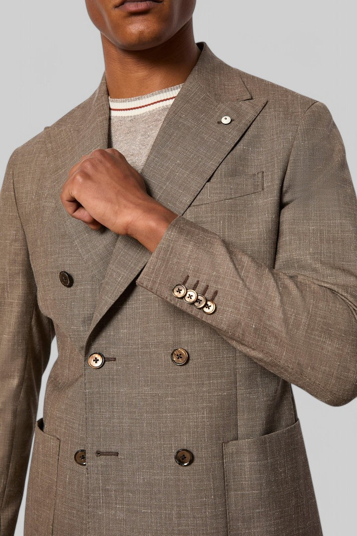 Abito da uomo doppiopetto non trattato realizzato in una preziosa e fresca mischia di lana vergine, seta e lino nei toni neutri del tortora con effetto melange. Modello con rever punta lancia, abbottonatura a 6 bottoni e pantalone ad una pince. Completo elegante e giovane, è il capo perfetto per un evento estivo formale come un matrimonio.