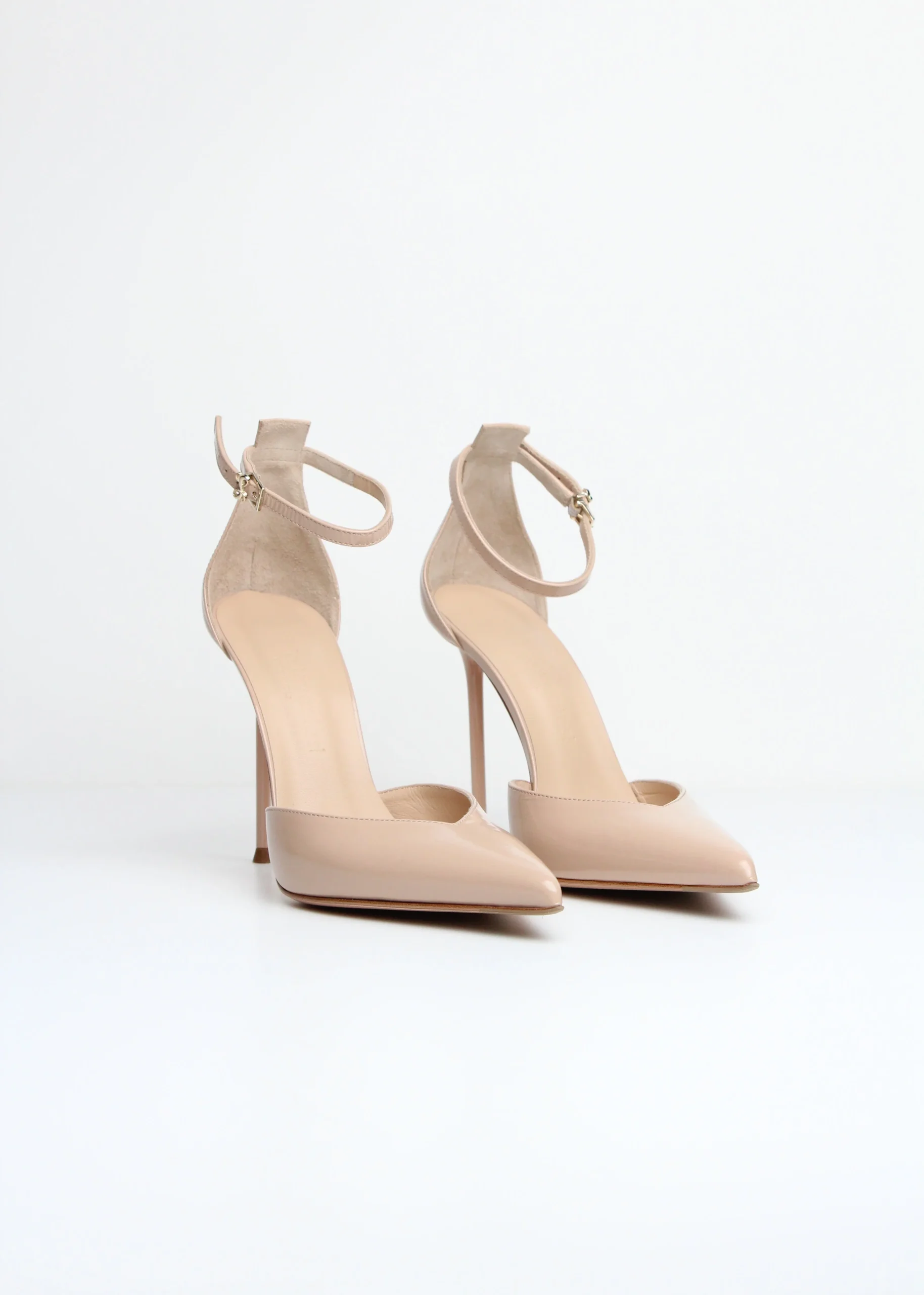 Realizzata in pelle verniciata dall’elegante tonalità beige chiaro, questa scarpa esalta la silhouette del piede con delicatezza, offrendo un look pulito e femminile. Il cinturino alla caviglia con fibbia regolabile aggiunge stabilità e charme, valorizzando la linea con un dettaglio raffinato.