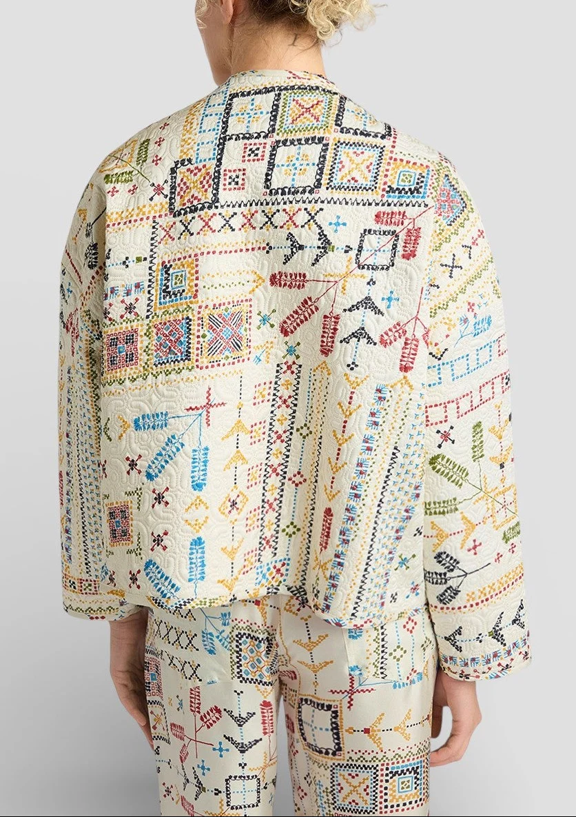 Cappotto boxy reversibile in twill stampato, trapuntato nel nuovo disegno logo Momonì. Gelsomino può essere indossato in unito grazie all’interno in tessuto unito con trapunto in filo in tono. Chiusura con bottoni snap metallici. Profili a contrasto.